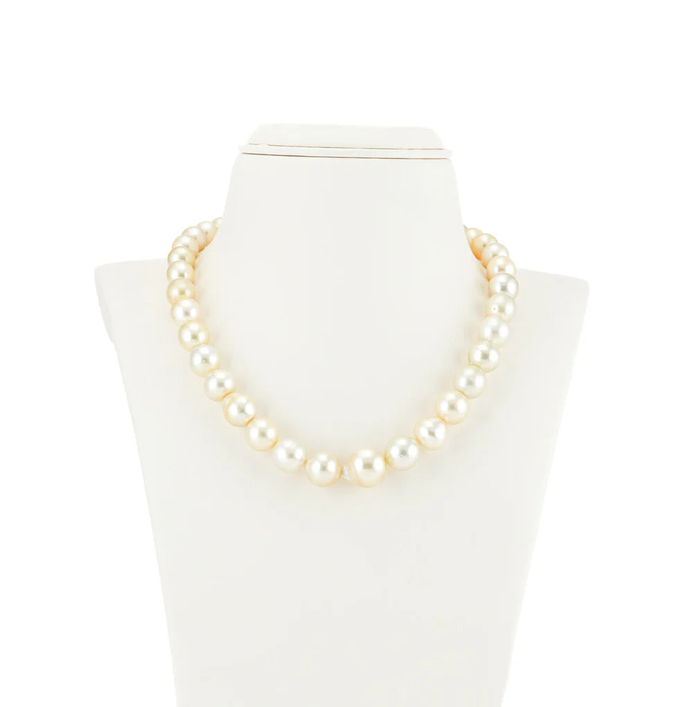 Grace your collection with this exquisite South Sea pearl necklace, showcasing natural white saltwater cultured pearls in a refined round shape. Ranging from 9 to 18 mm in size and graded A in quality, this single-row 18-inch necklace weighs approximately 528.75 grams. It is backed by a lifelong guarantee and comes with a Certificate of Authenticity to ensure 100% genuine pearls. A timeless treasure for any jewelry lover, this piece pairs beautifully with both traditional and western wear, making it ideal for weddings, festive occasions, or sophisticated evening events