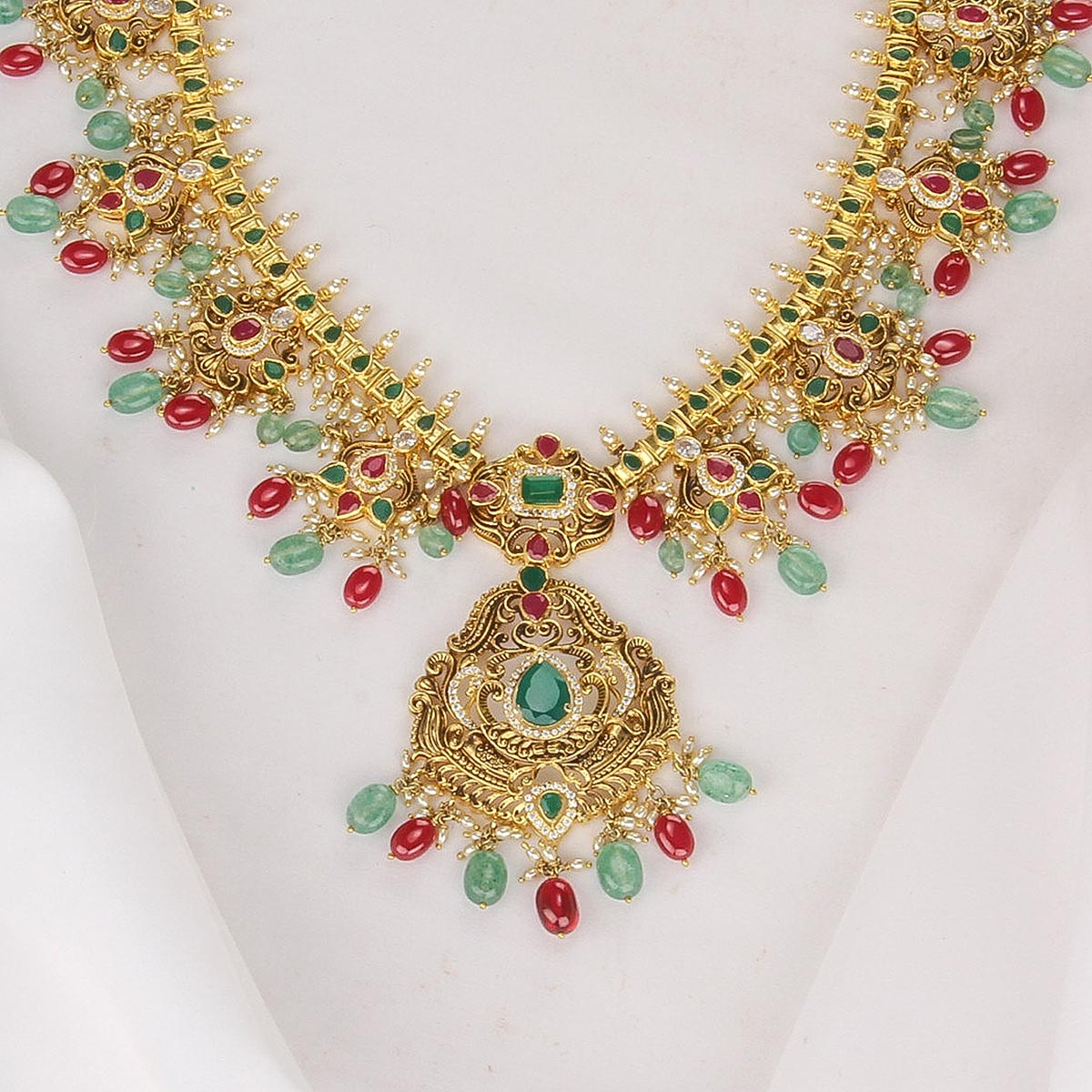 This 92.5 Silver, 24 kt Gold-Plated Long Necklace is adorned with Semi-precious Stones for a luxurious aesthetic.