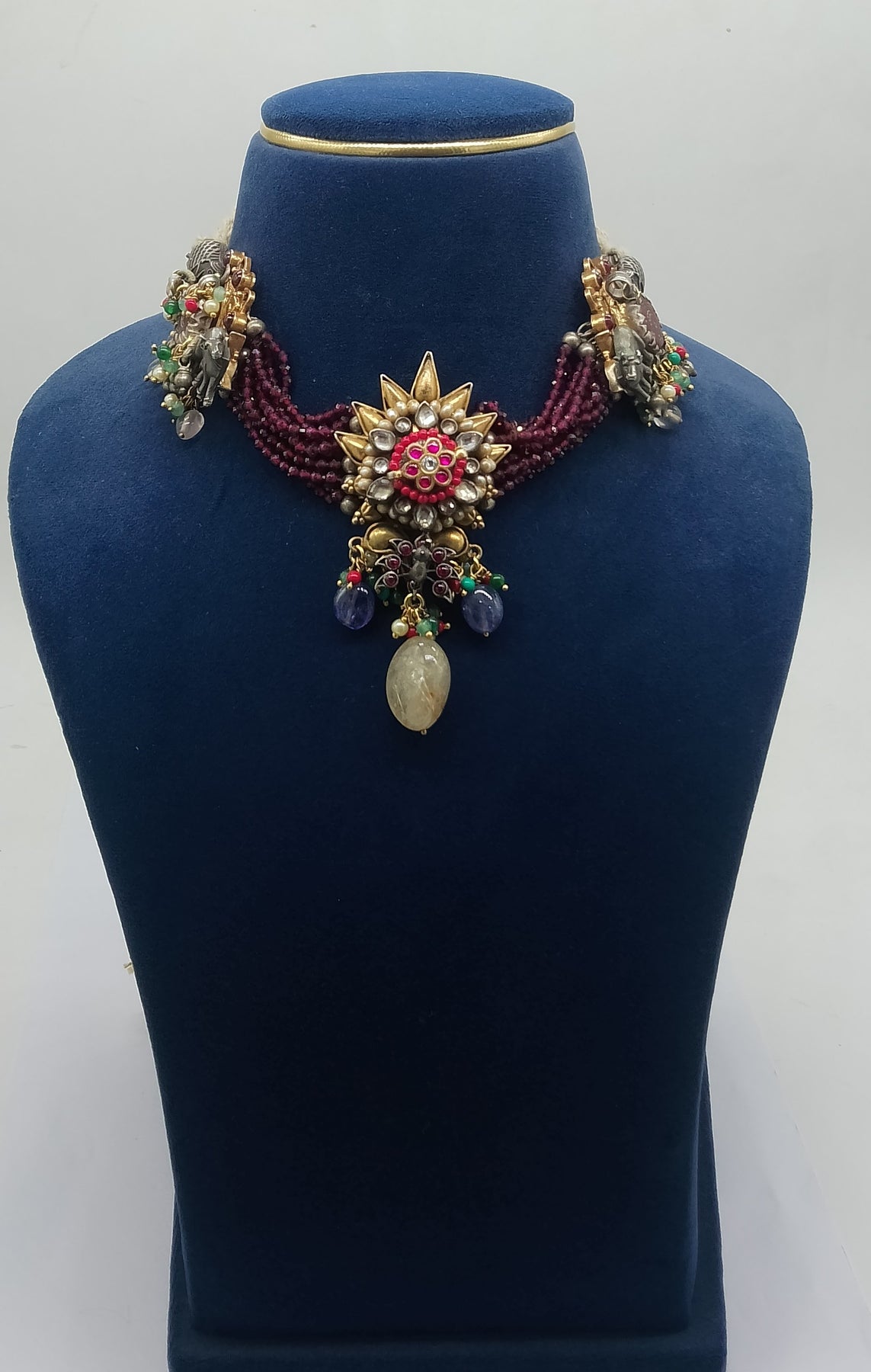 Regular price $1,464.00 Save $-1,464.00925 Silver Nakhra Red Choker with Handcrafted Multicolour Kundan Stone Pendent . Motifs of Elephant and Cow .Its studded with Pearls,Corals,Turquoise,Rose Quartz and Green Beeds. Kundan Work is also intricately done. Gross weight:104 Gms. Length 8".The Silver Nakhra Red Choker is a striking blend of elegance and bold charm, designed to make a statement. Crafted in a radiant silver finish, this choker features intricate detailing that highlights traditional artistry, beautifully complemented by rich red accents that add depth and allure