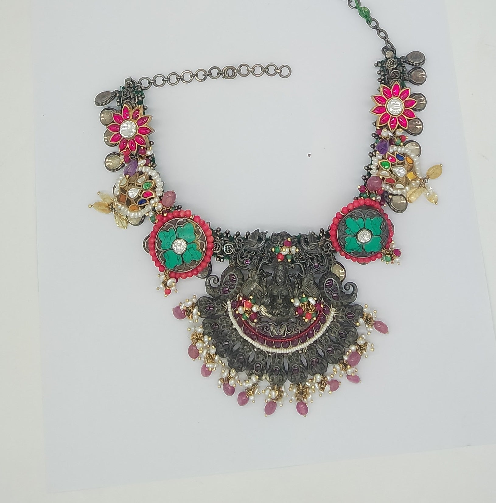 The Traditional Temple-Style Lakshmi Choker with Semi-Precious Stones is a stunning tribute to classic Indian craftsmanship and heritage jewelry. Featuring an oxidized finish, this exquisite choker showcases the iconic Lakshmi motif, adorned with vibrant rubies, lustrous pearls, and carefully selected semi-precious stones. Its intricate temple-inspired design captures the richness and grandeur of traditional artistry, making it a perfect statement piece for weddings, festivals, or special occasions. Lightweight yet striking, this choker effortlessly elevates ethnic ensembles while celebrating timeless elegance and cultural charm.