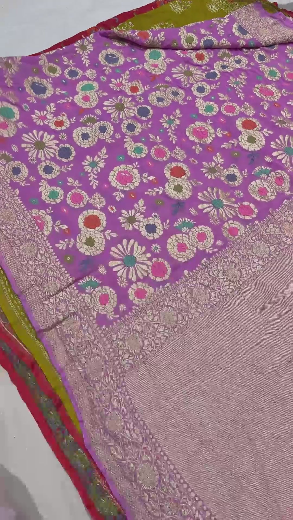 The Authentic Lilac Banarasi Silk Georgette Saree is a stunning blend of delicate color and intricate craftsmanship. Made from lightweight, flowing silk georgette, this saree features a soft lilac hue that lends an aura of grace and sophistication. The highlight of this saree is its ornate Persian design border and pallu, intricately woven with rich zari work depicting classic Persian motifs such as floral vines and elegant arabesques. This exquisite detailing adds a regal touch, making the saree perfect for weddings, formal occasions, and festive celebrations. A true masterpiece that beautifully marries traditional artistry with contemporary elegance.