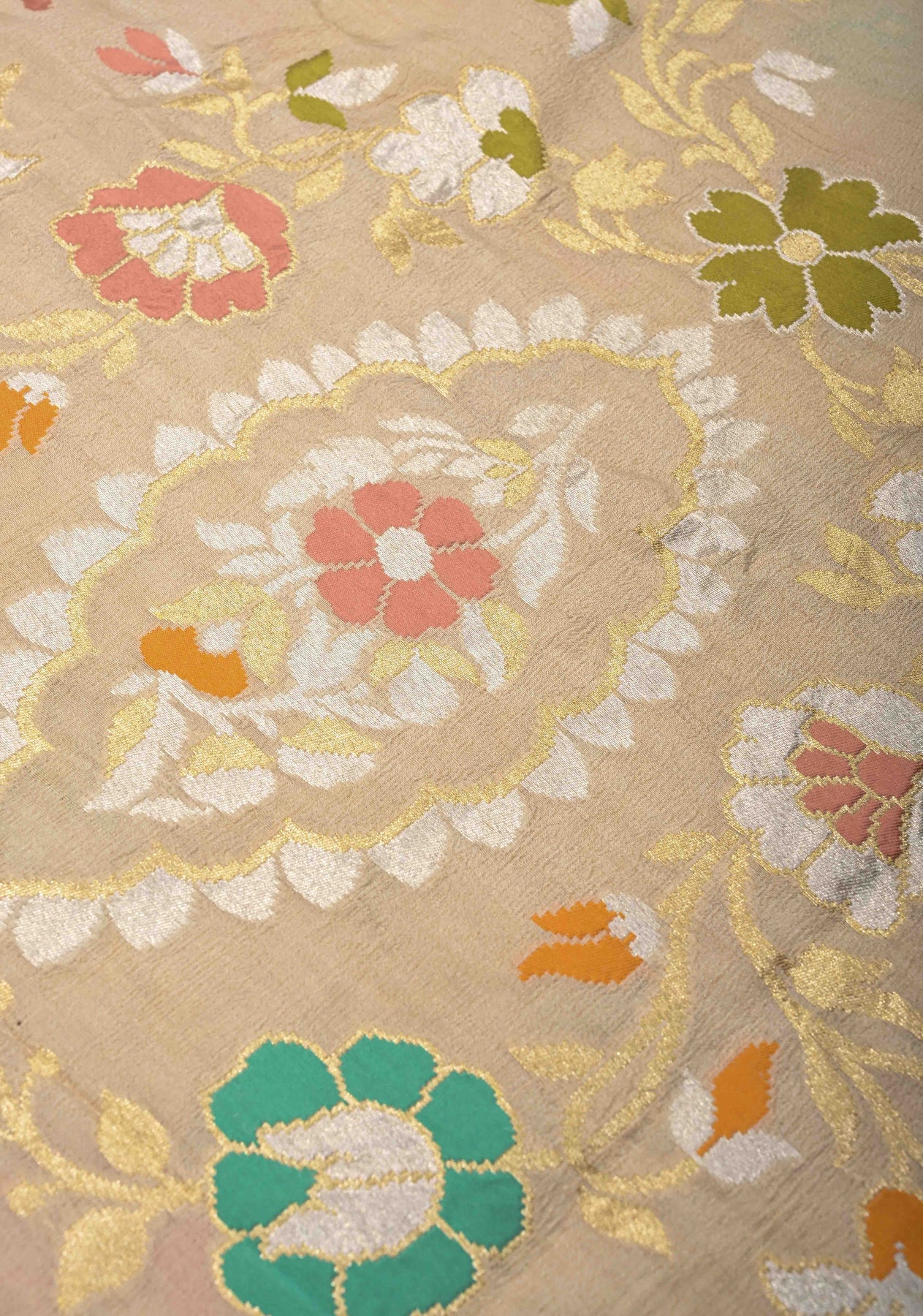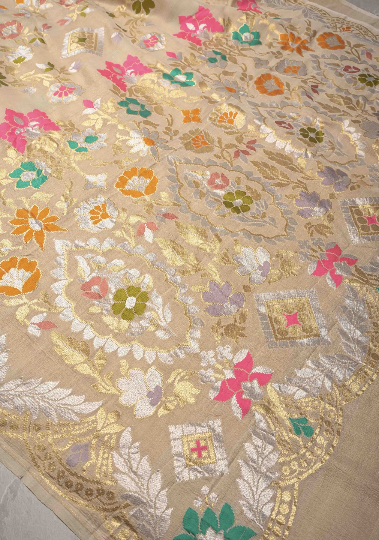 Intricately adorned with Meenakari floral jaal, the saree showcases fine multicolored motifs that bring subtle vibrancy to its neutral base. The highlight is the elegant scallop zari border, adding a unique, ornate touch that elevates the entire look.