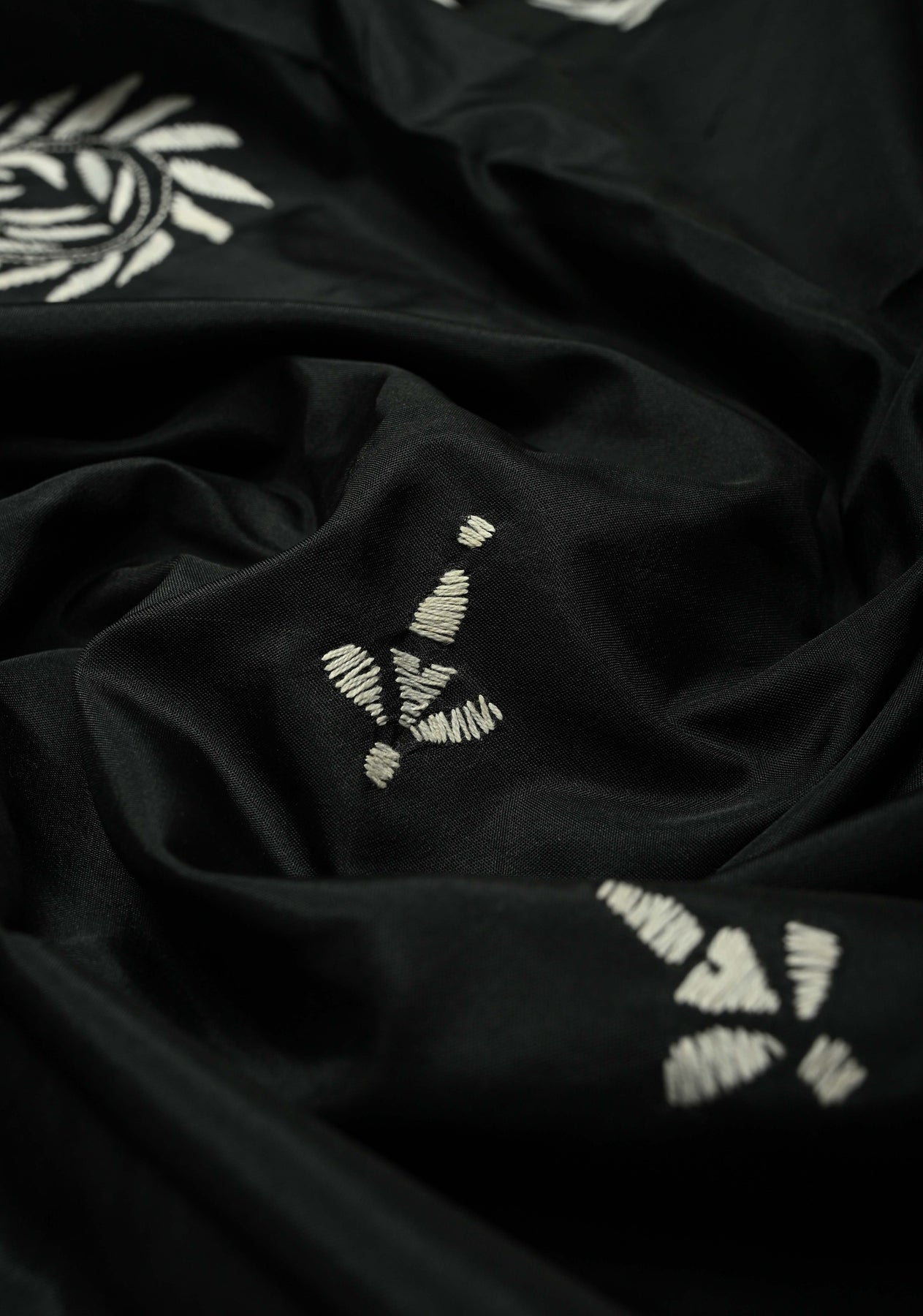 This Black Art Silk Saree with Kantha Hand Embroidery is a perfect blend of elegance and traditional craftsmanship. The black base creates a sophisticated canvas, allowing the intricate Kantha hand embroidery to truly shine. The embroidery, done with fine threadwork, features delicate patterns, adding a touch of artistry and texture to the saree.