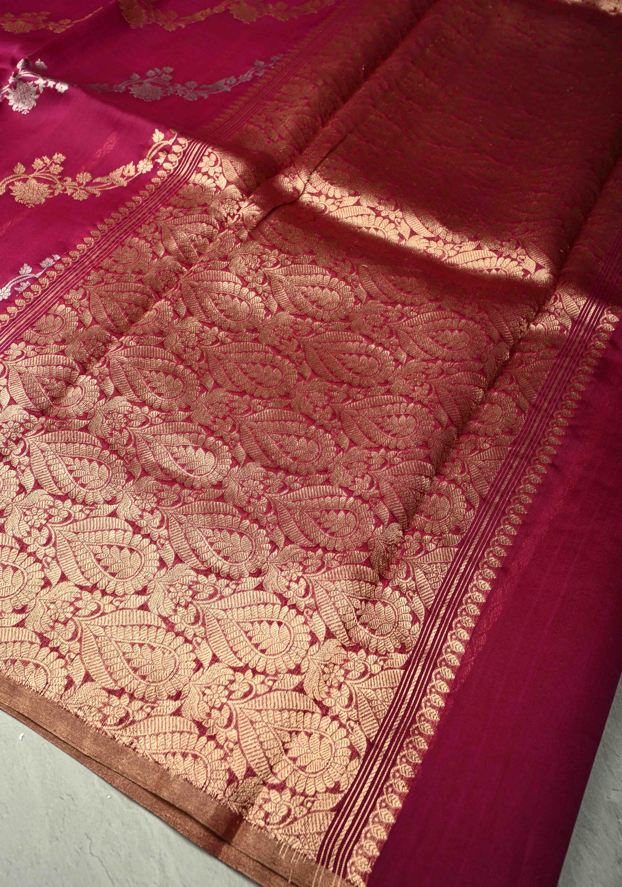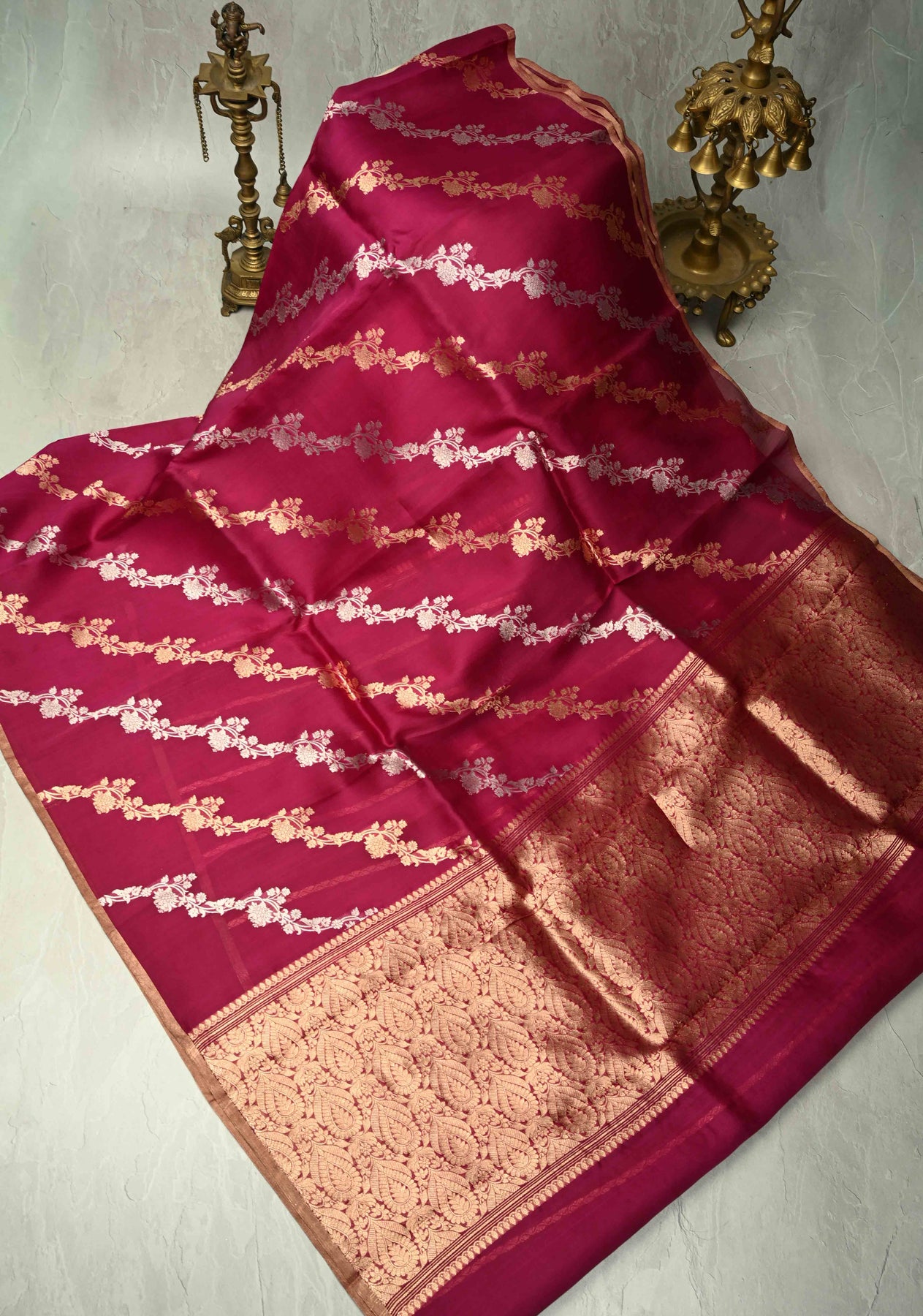 Graceful and radiant, this Ruby Wine Banarasi Kora Silk Saree is a masterpiece of traditional weaving and refined luxury. Crafted from lightweight and lustrous pure Kora silk, the saree features exquisite Sona Rupa Leheria patterns, intricately woven in gold and silver zari that shimmer beautifully against the deep ruby wine base.