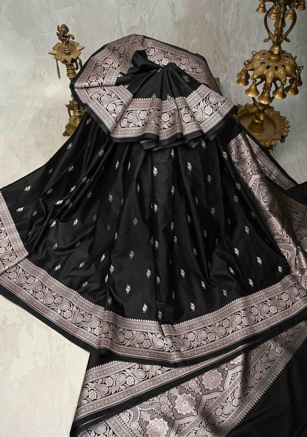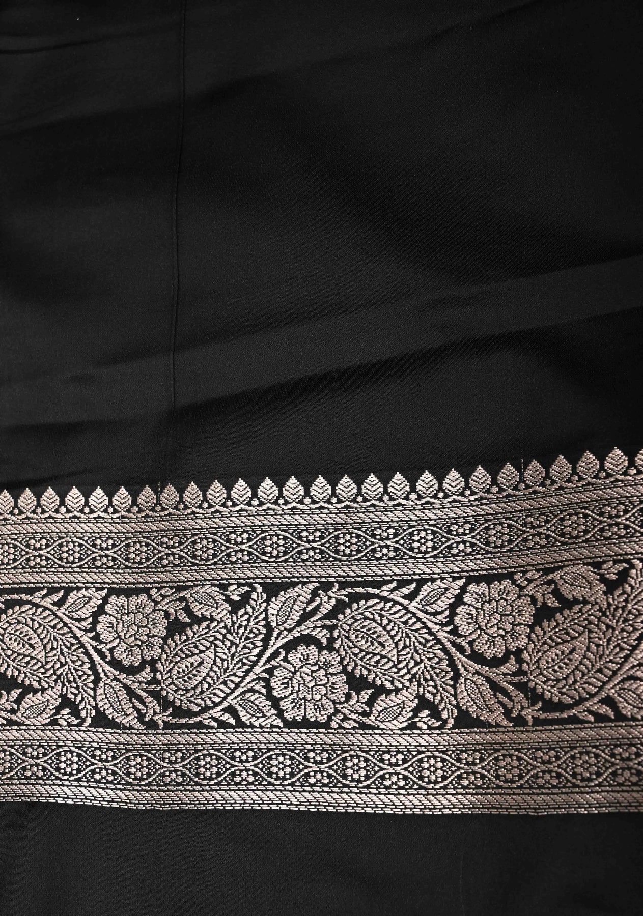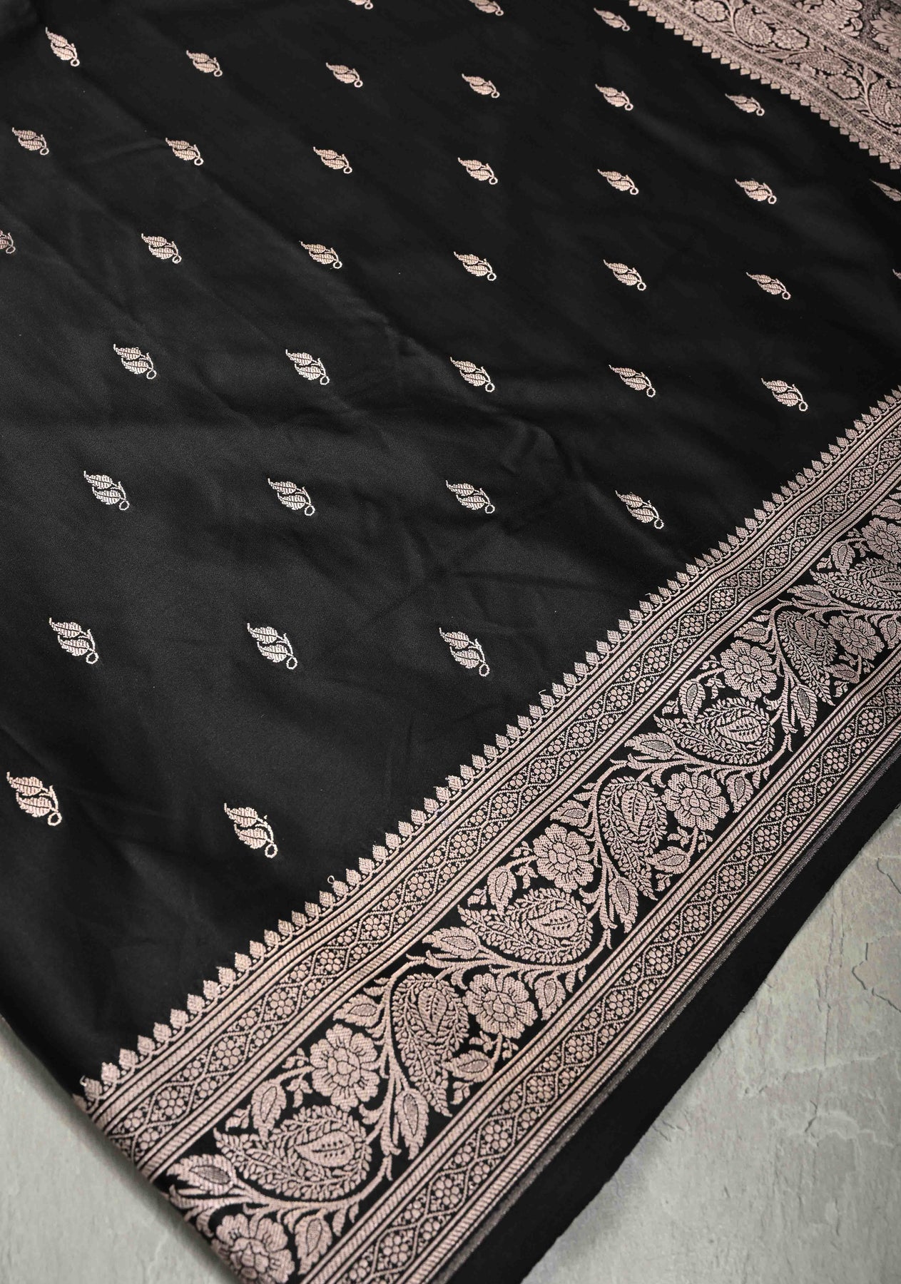Make a striking statement with this Black Banarasi Semi Mashru Silk Saree. Adorned with silver floral zari buttas and finished with a matching zari border, this saree blends classic Banarasi craftsmanship with contemporary elegance. Perfect for occasions, and evening events, it exudes sophistication and timeless charm.