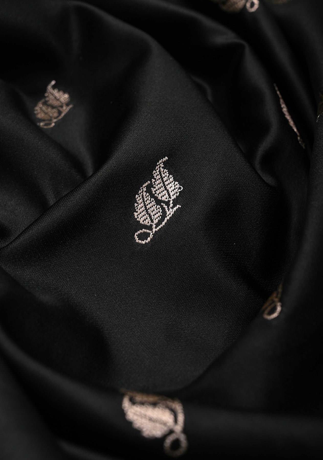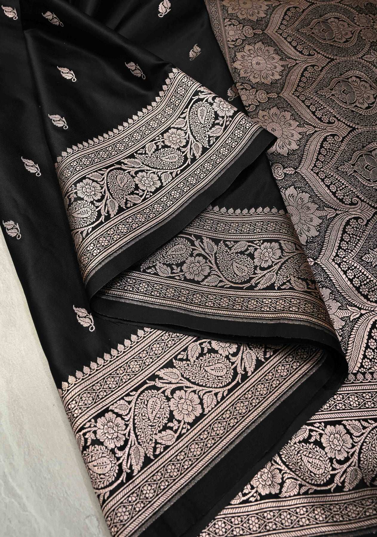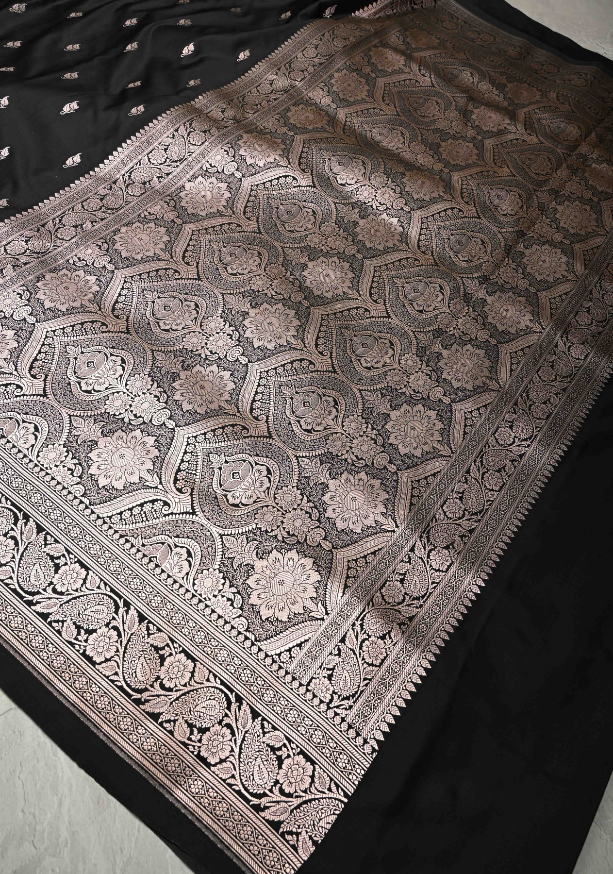 Make a striking statement with this Black Banarasi Semi Mashru Silk Saree. Adorned with silver floral zari buttas and finished with a matching zari border, this saree blends classic Banarasi craftsmanship with contemporary elegance. Perfect for occasions, and evening events, it exudes sophistication and timeless charm.