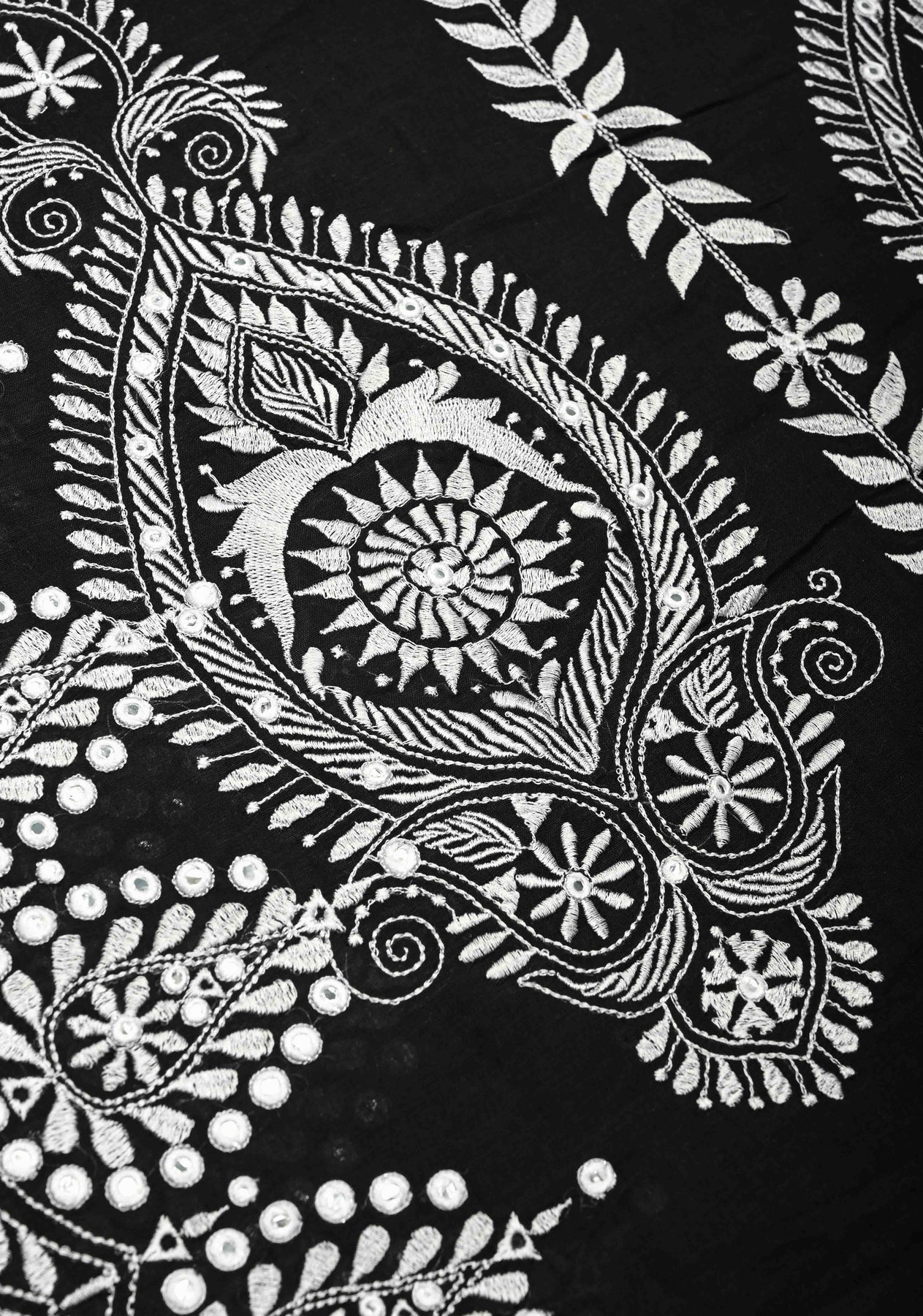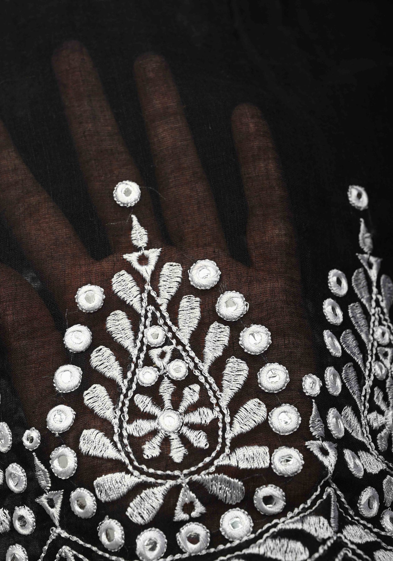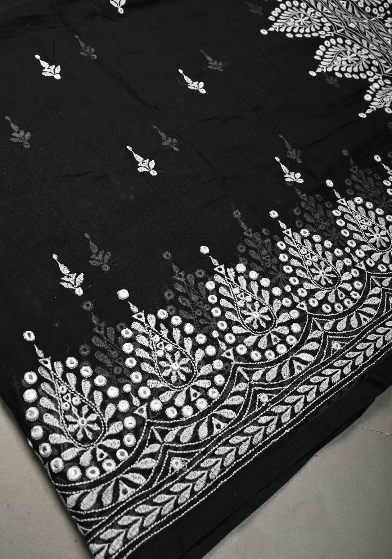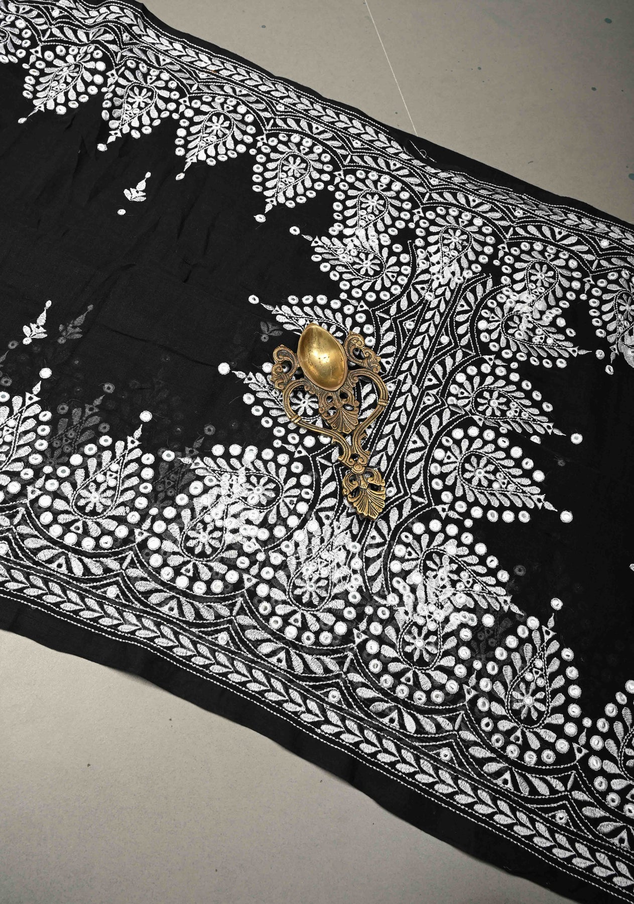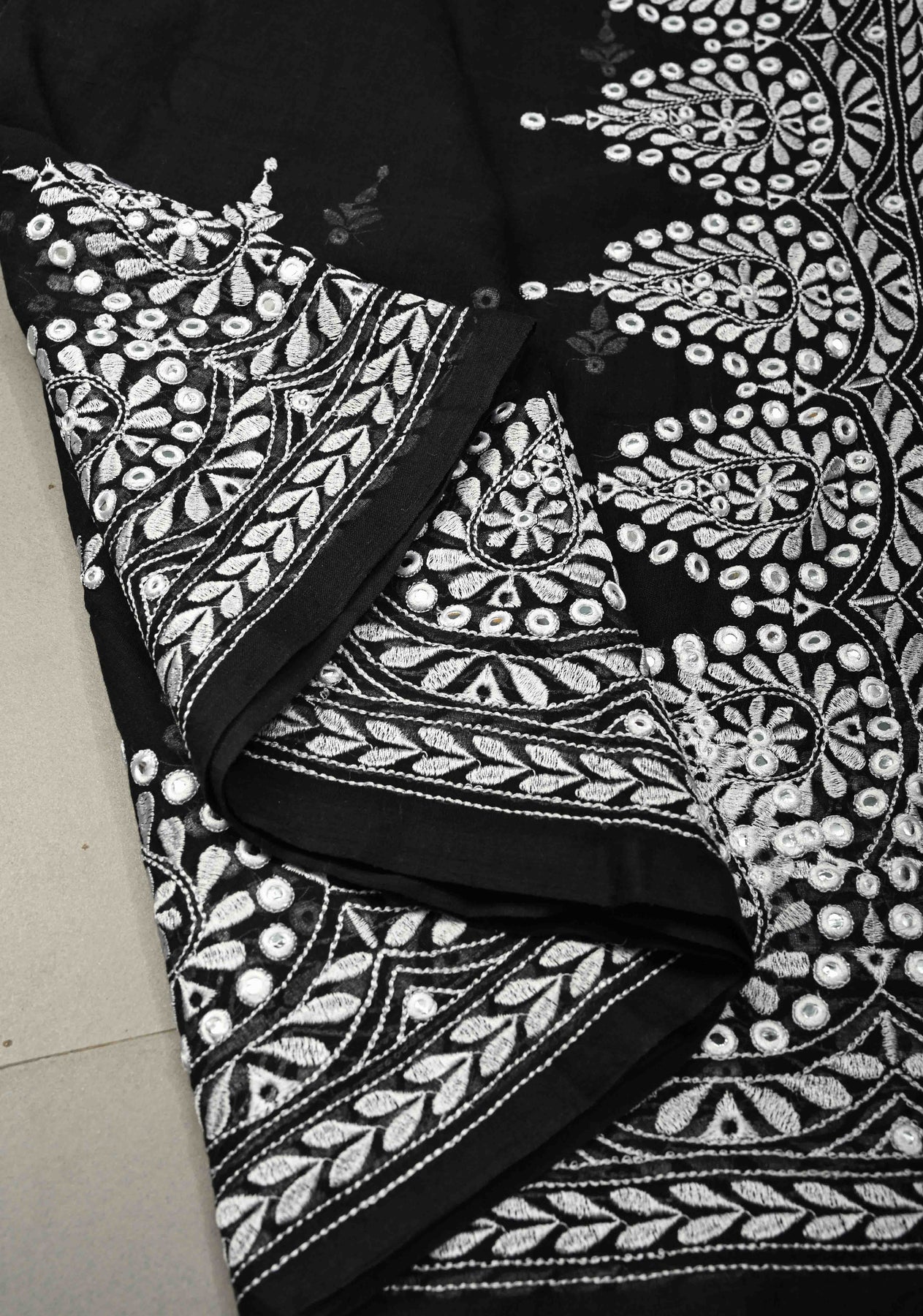 Black Mul Cotton Saree with White Chikankari Embroidery and Disk Mirror