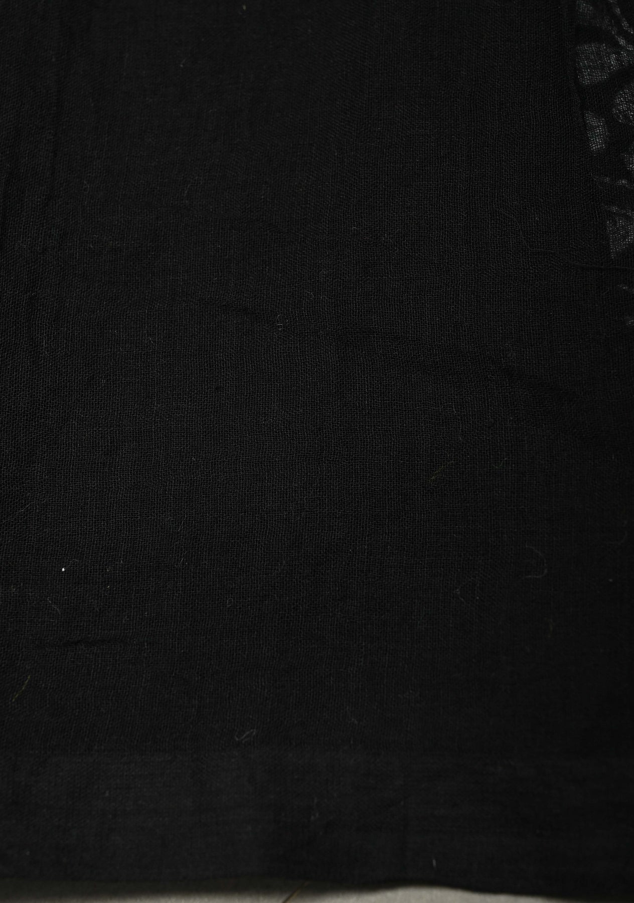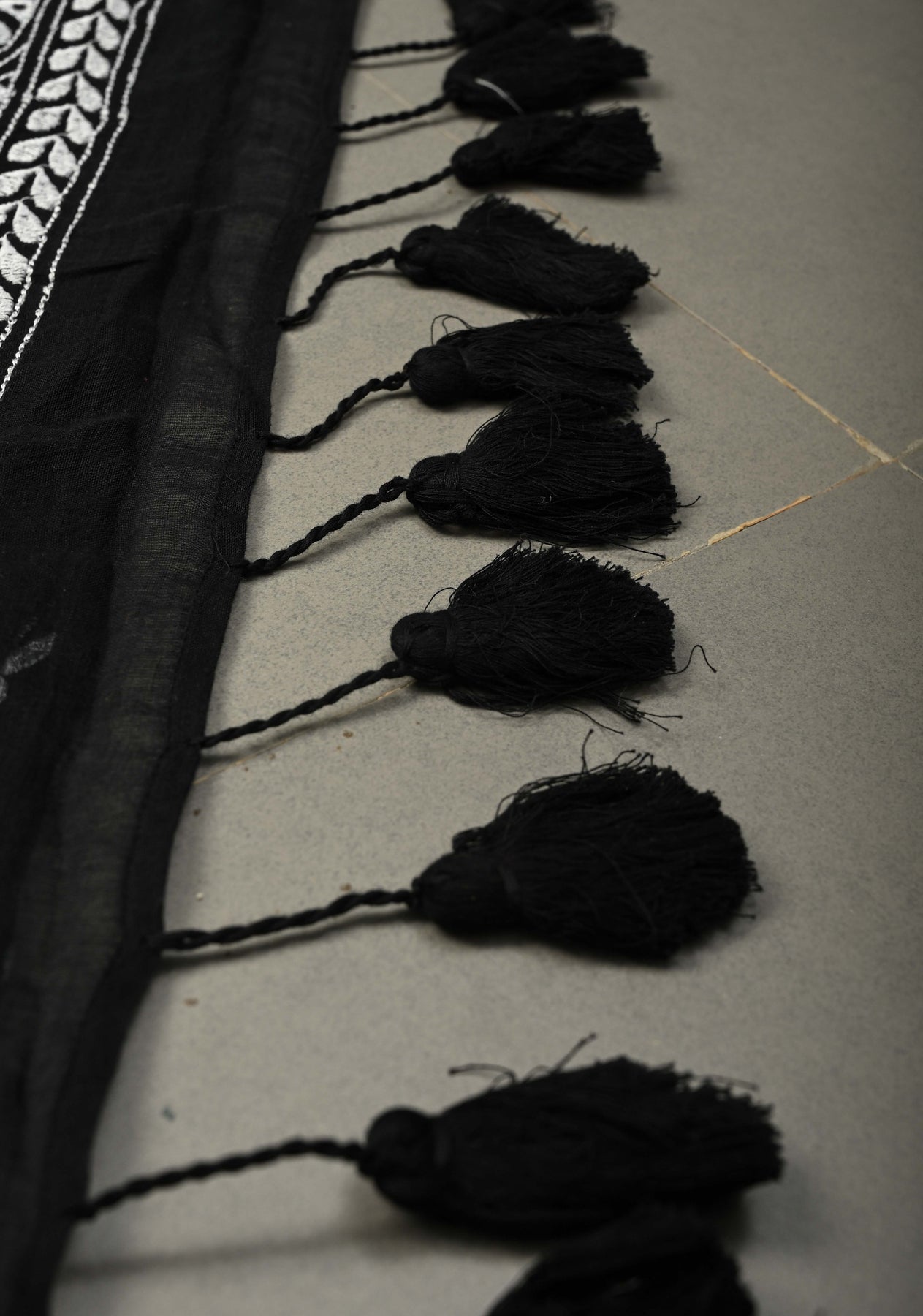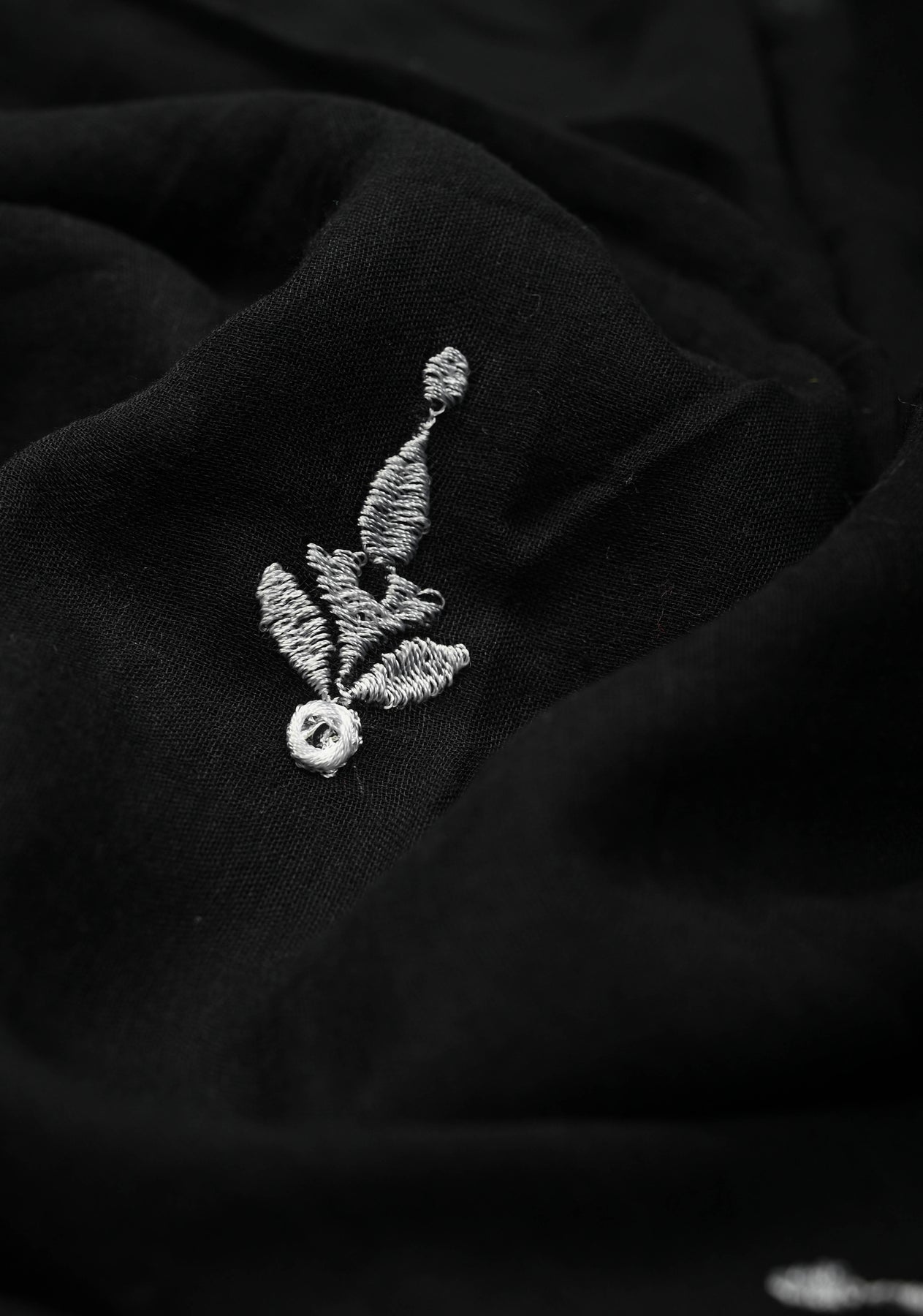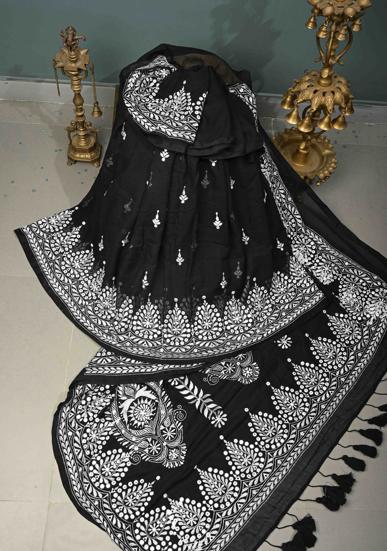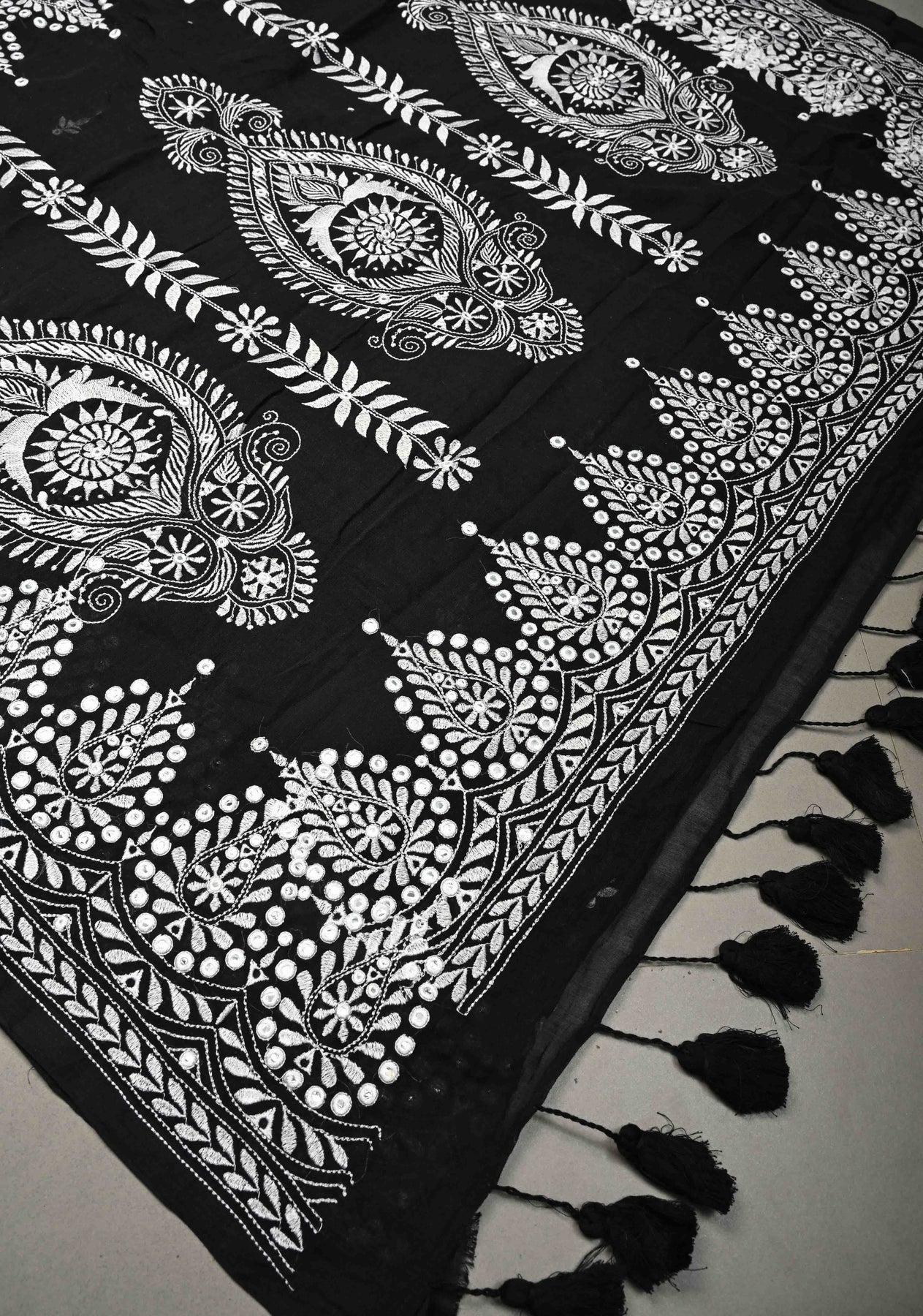 Black Mul Cotton Saree with White Chikankari Embroidery and Disk Mirror
