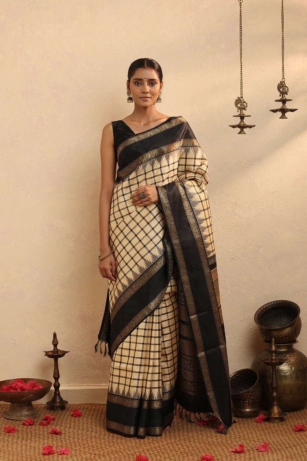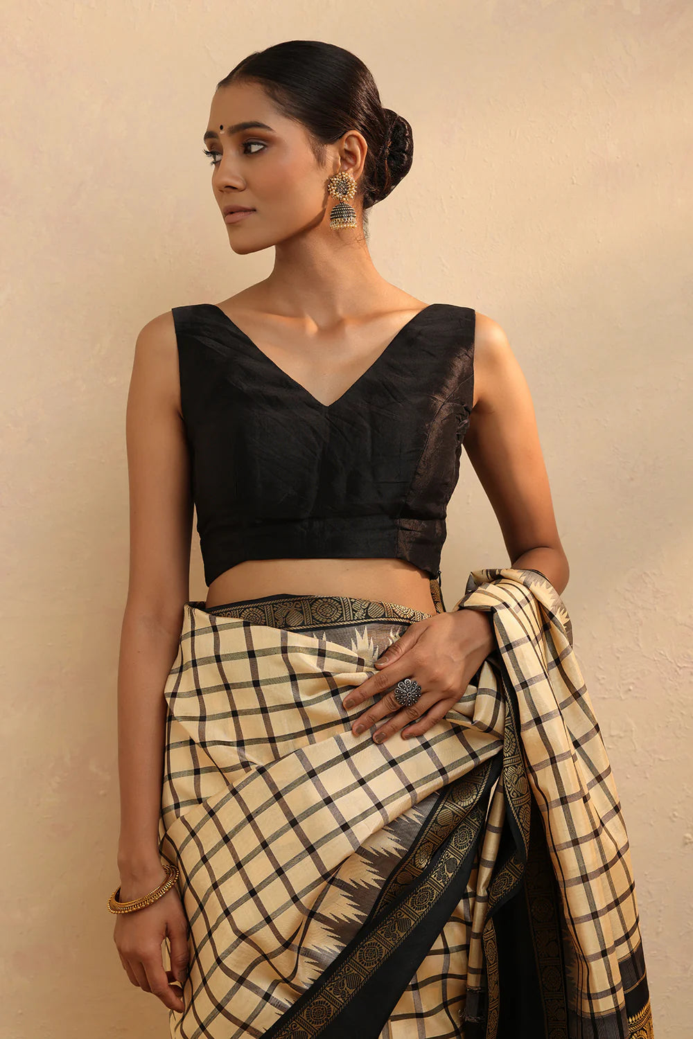 Elevate your ensemble with our Black Silk V-Neck Blouse, crafted from silk for a refined finish. Featuring a flattering V neckline and a sleek side-zip closure, it offers both style and comfort. Perfect for pairing with sarees or skirts, this timeless piece adds understated elegance to festive occasions and sophisticated evening looks.