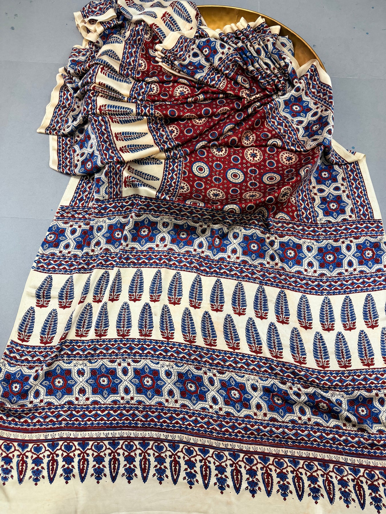 Make a bold statement with this Blood Red Ajrakh Hand Block Printed Modal Silk Saree, a stunning example of traditional craftsmanship and contemporary elegance. Handcrafted using the authentic Ajrakh hand block printing technique, the saree showcases intricate motifs that beautifully complement the deep blood red base.