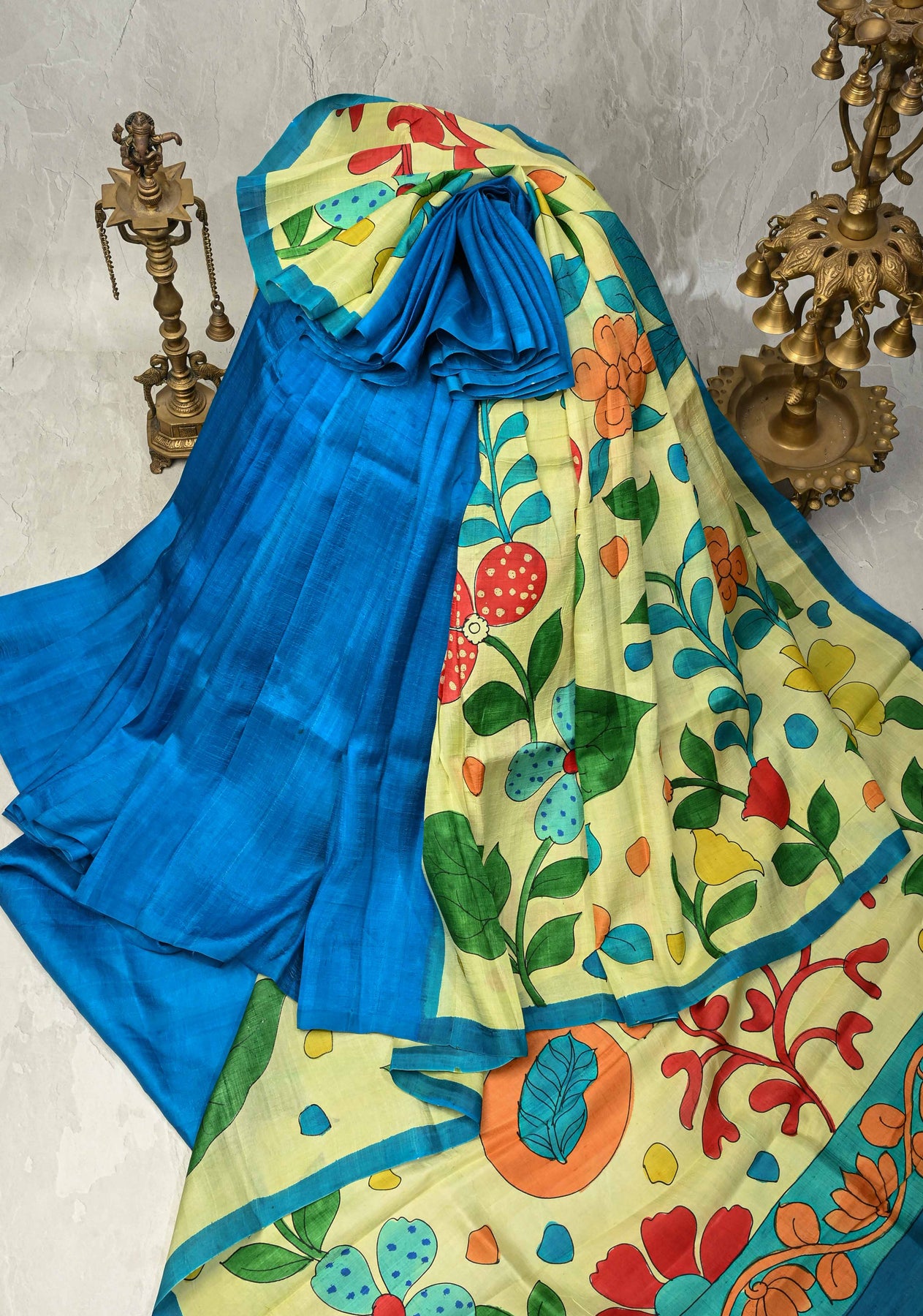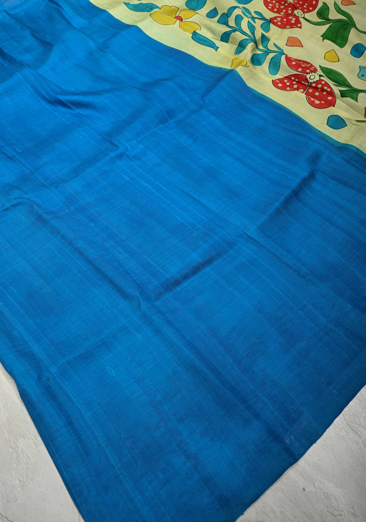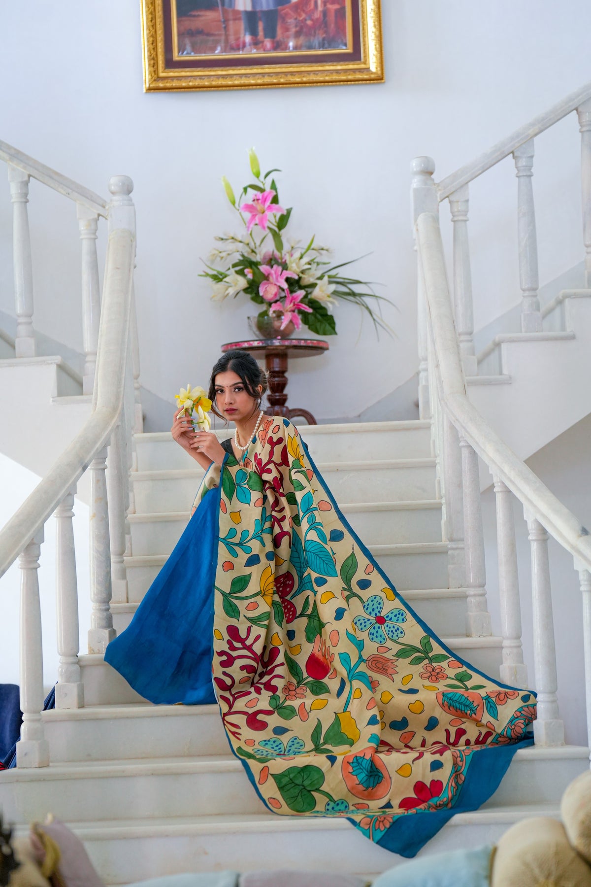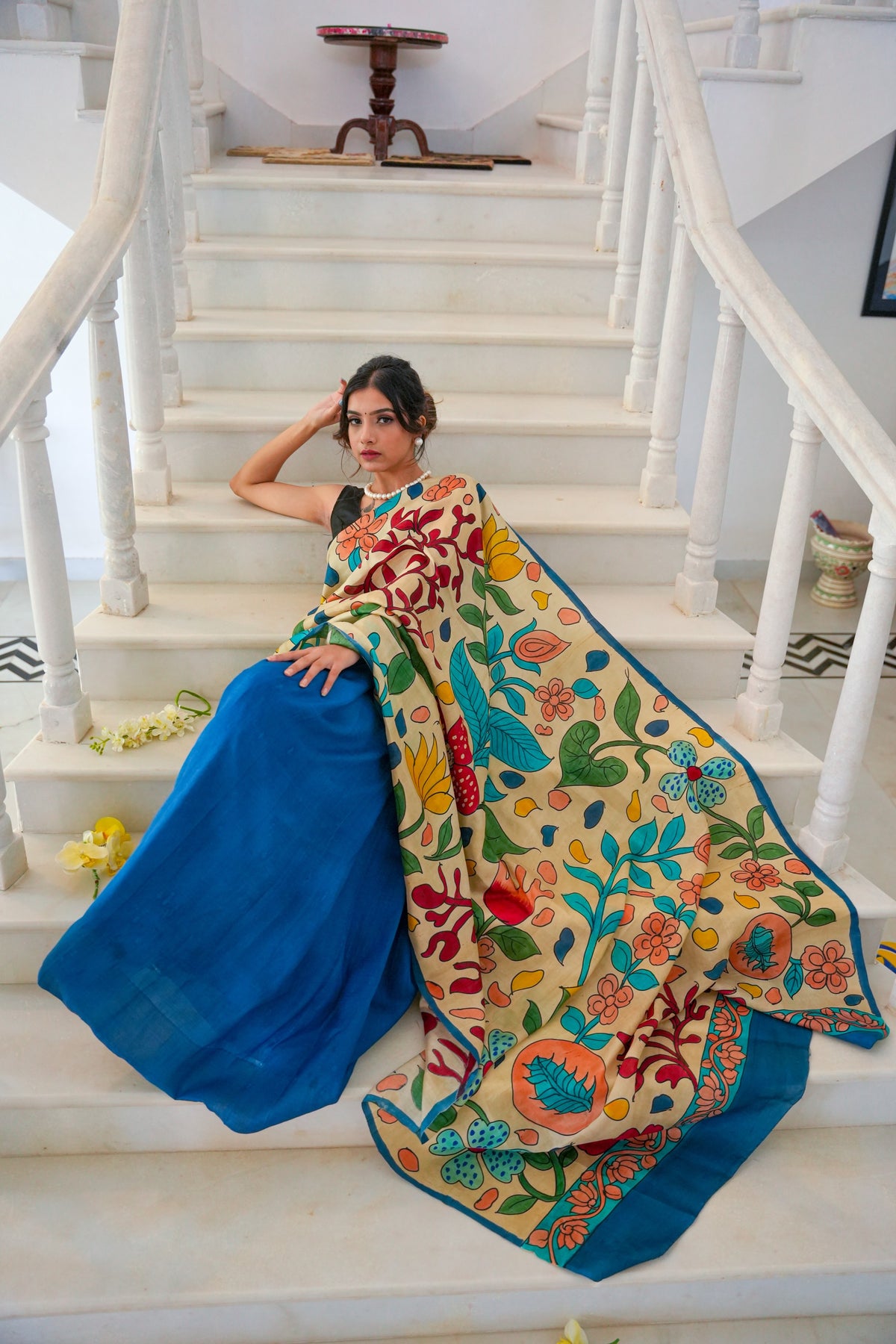 The soothing blue and cream color palette is adorned with intricate Kalamakari-inspired handpainted motifs, created by skilled artisans using traditional techniques. Each saree is uniquely handpainted, making it a one-of-a-kind piece that reflects artistic excellence and cultural richness.