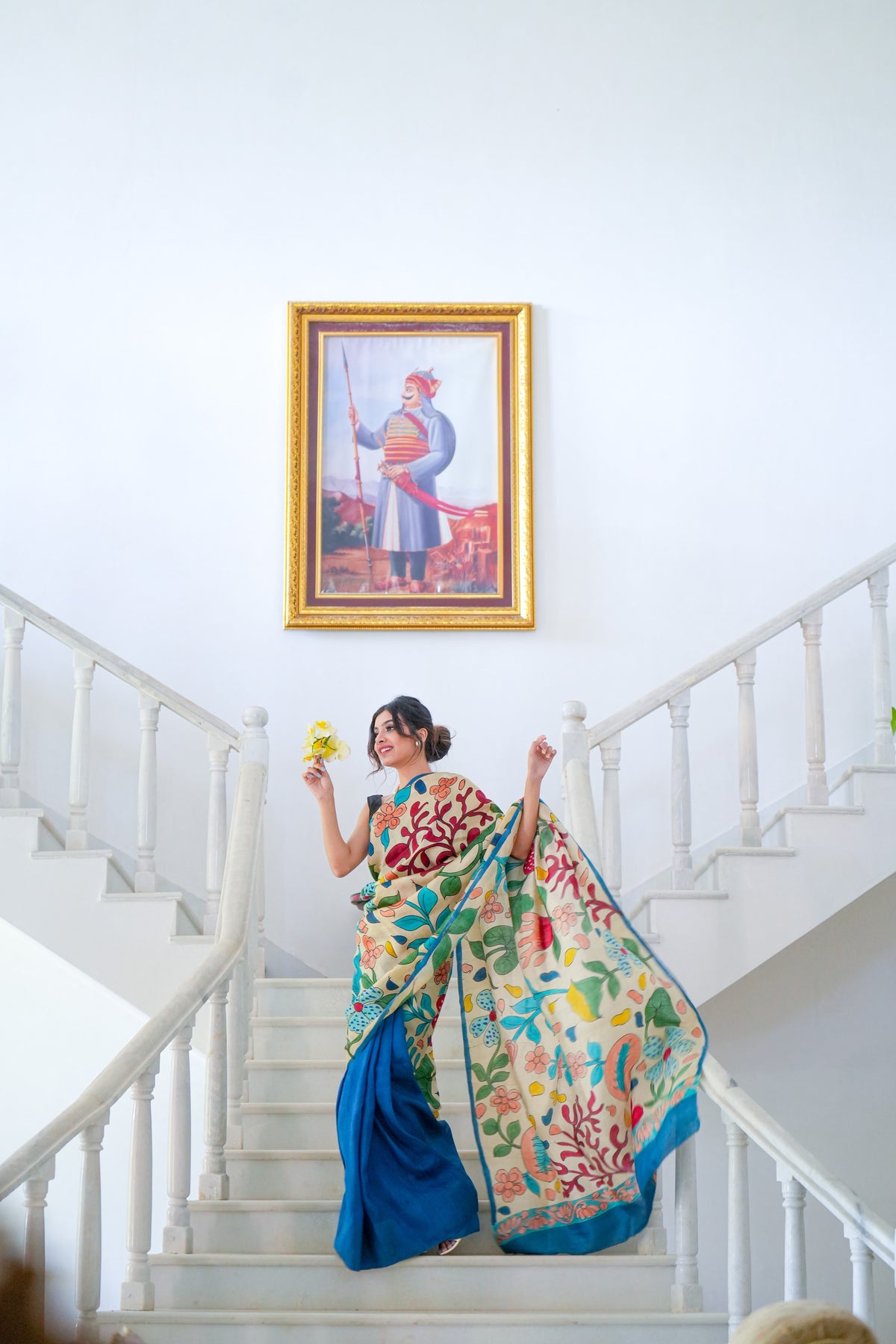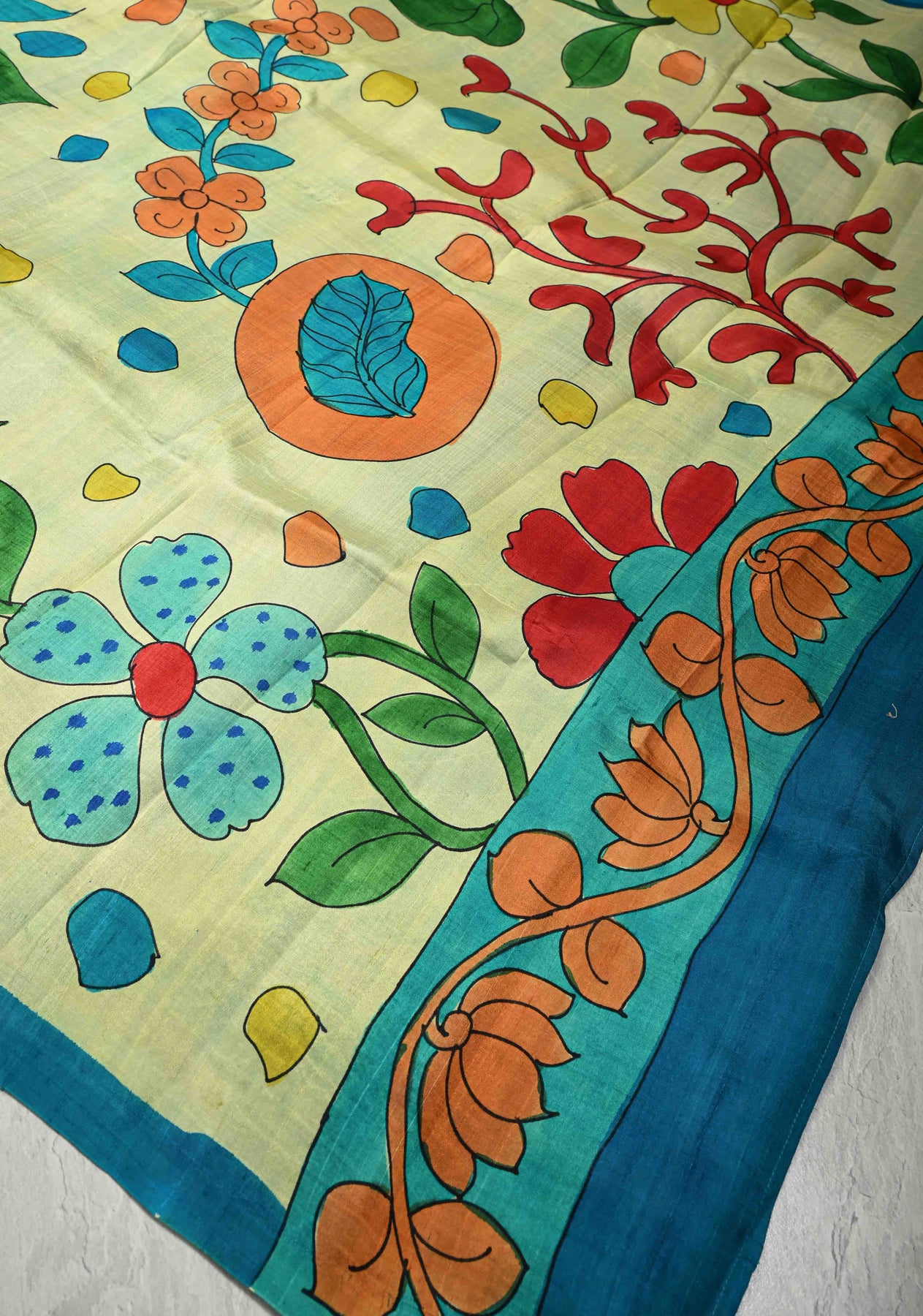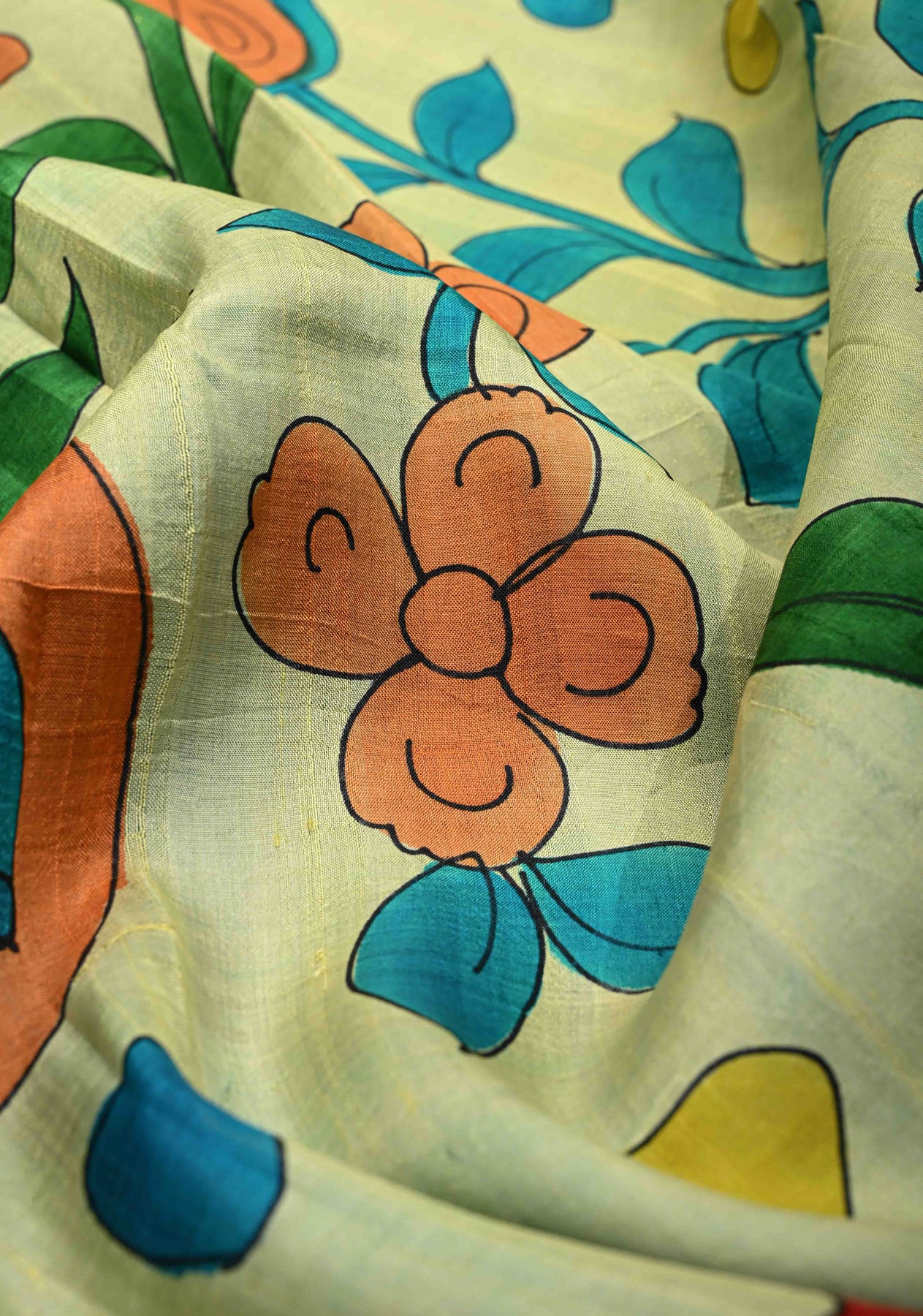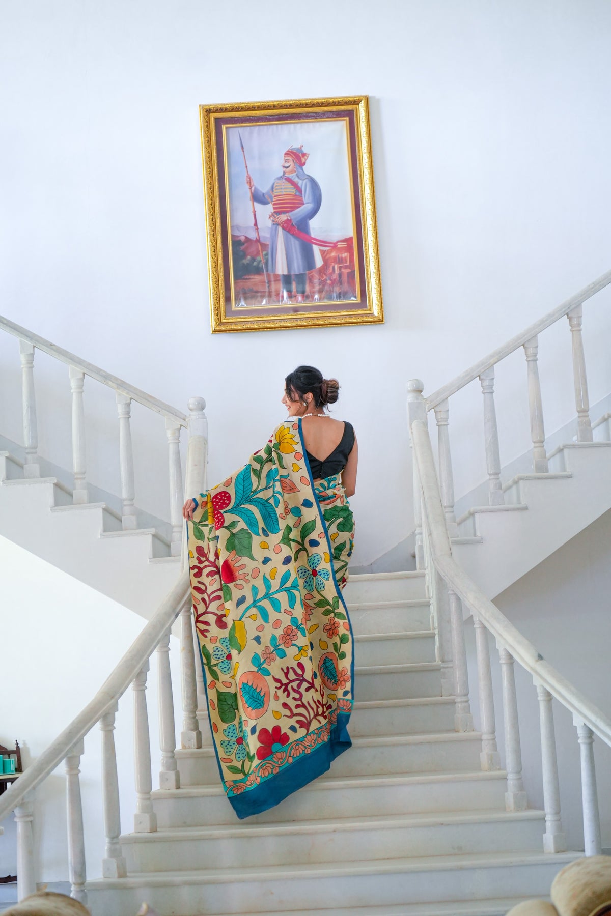 The soothing blue and cream color palette is adorned with intricate Kalamakari-inspired handpainted motifs, created by skilled artisans using traditional techniques. Each saree is uniquely handpainted, making it a one-of-a-kind piece that reflects artistic excellence and cultural richness.