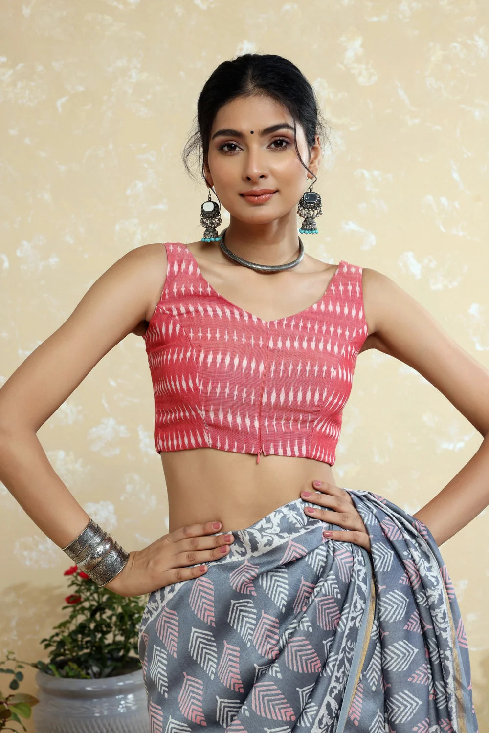 Discover elegance with our Pink & White Pure Cotton Handloom Ikkat Blouse. Featuring a front zip closure, sleeveless design with a flattering V-neckline, and comfortable lining, this blouse seamlessly blends traditional craftsmanship with modern style. Perfect for both casual outings and special occasions, it adds a touch of artisanal charm to your wardrobe.