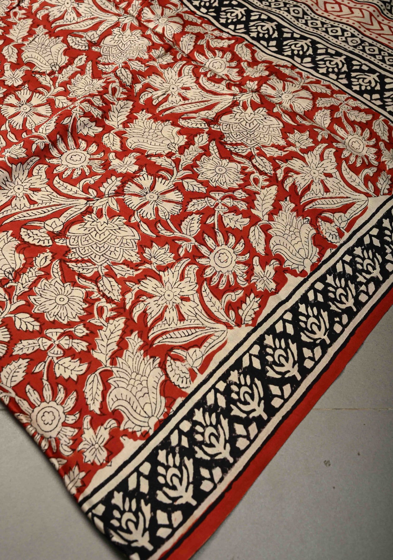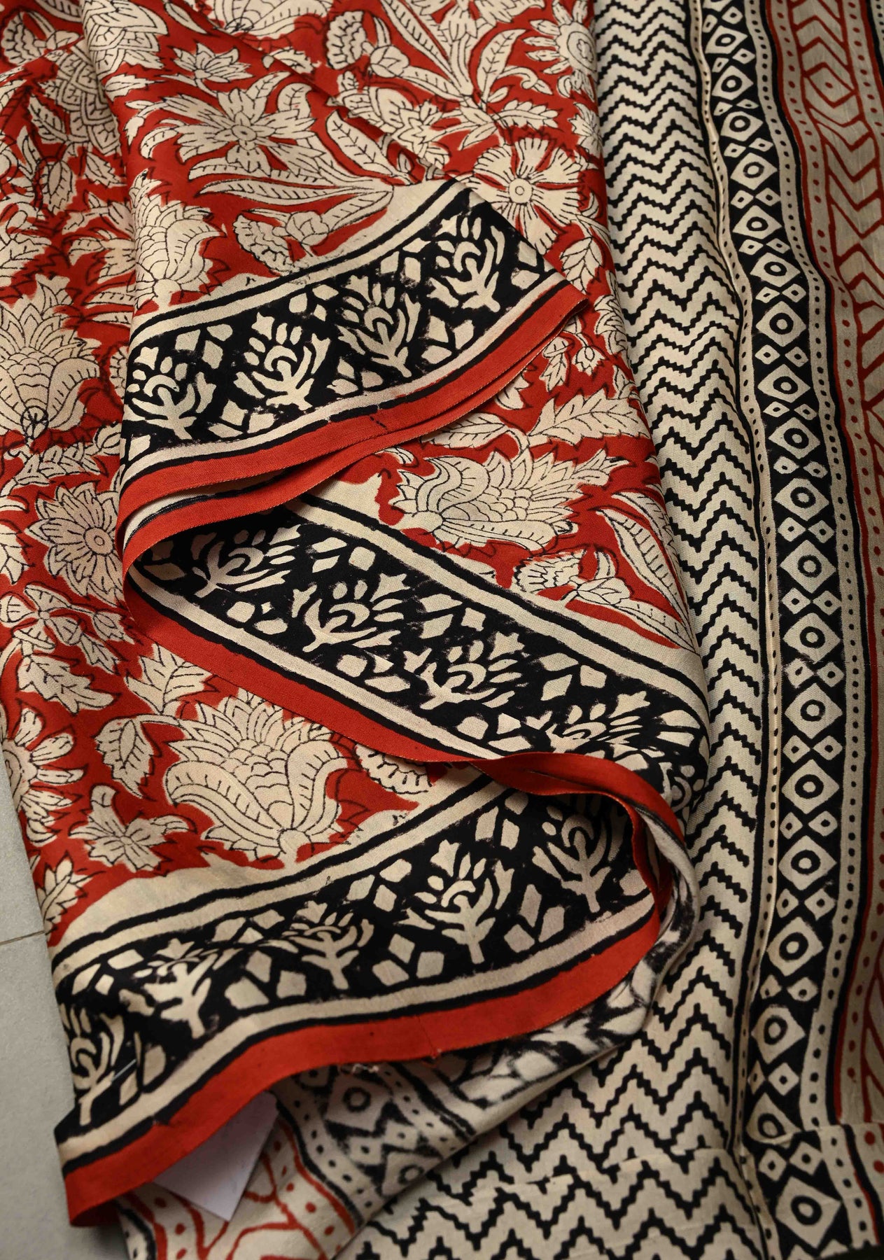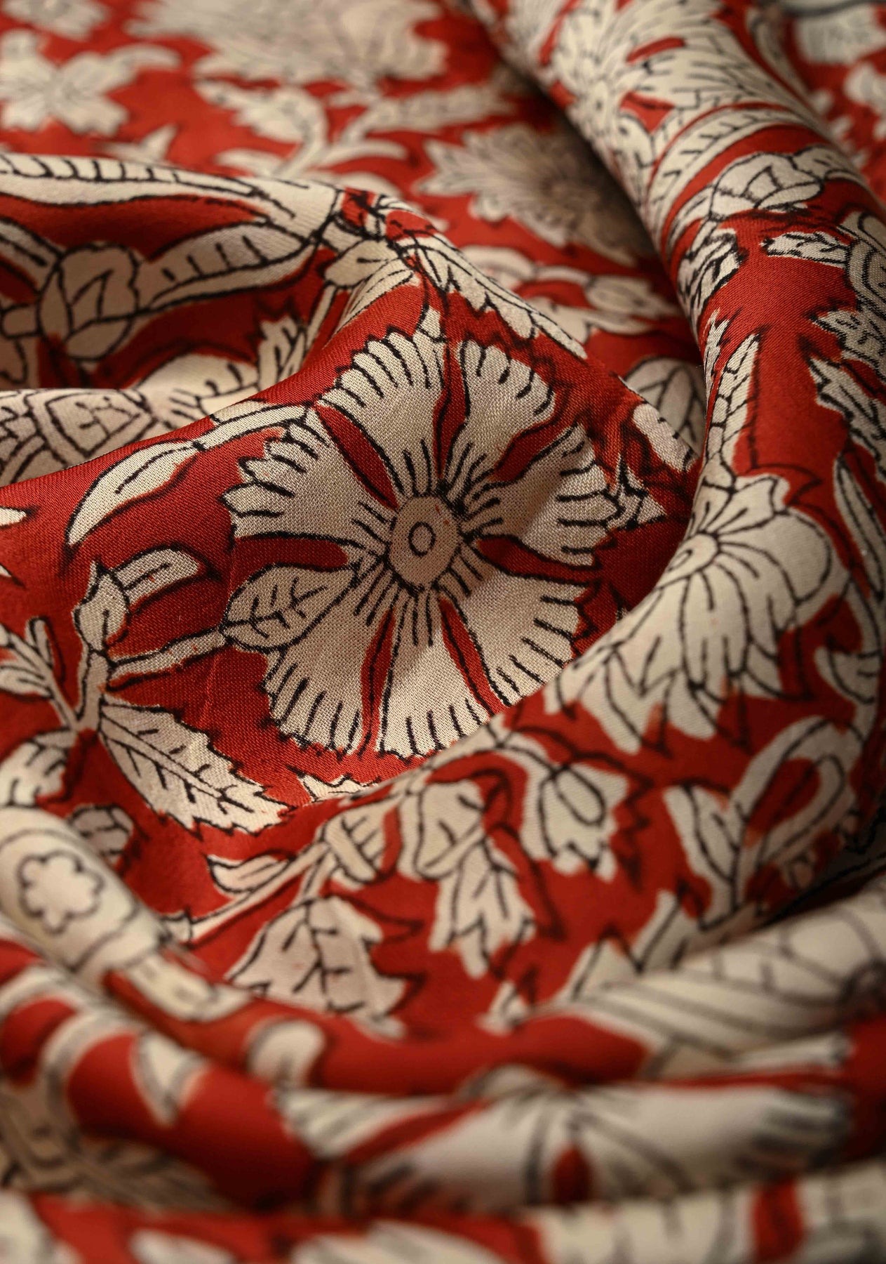 Brick Red Modal Silk Saree with Sanganeri Block Print