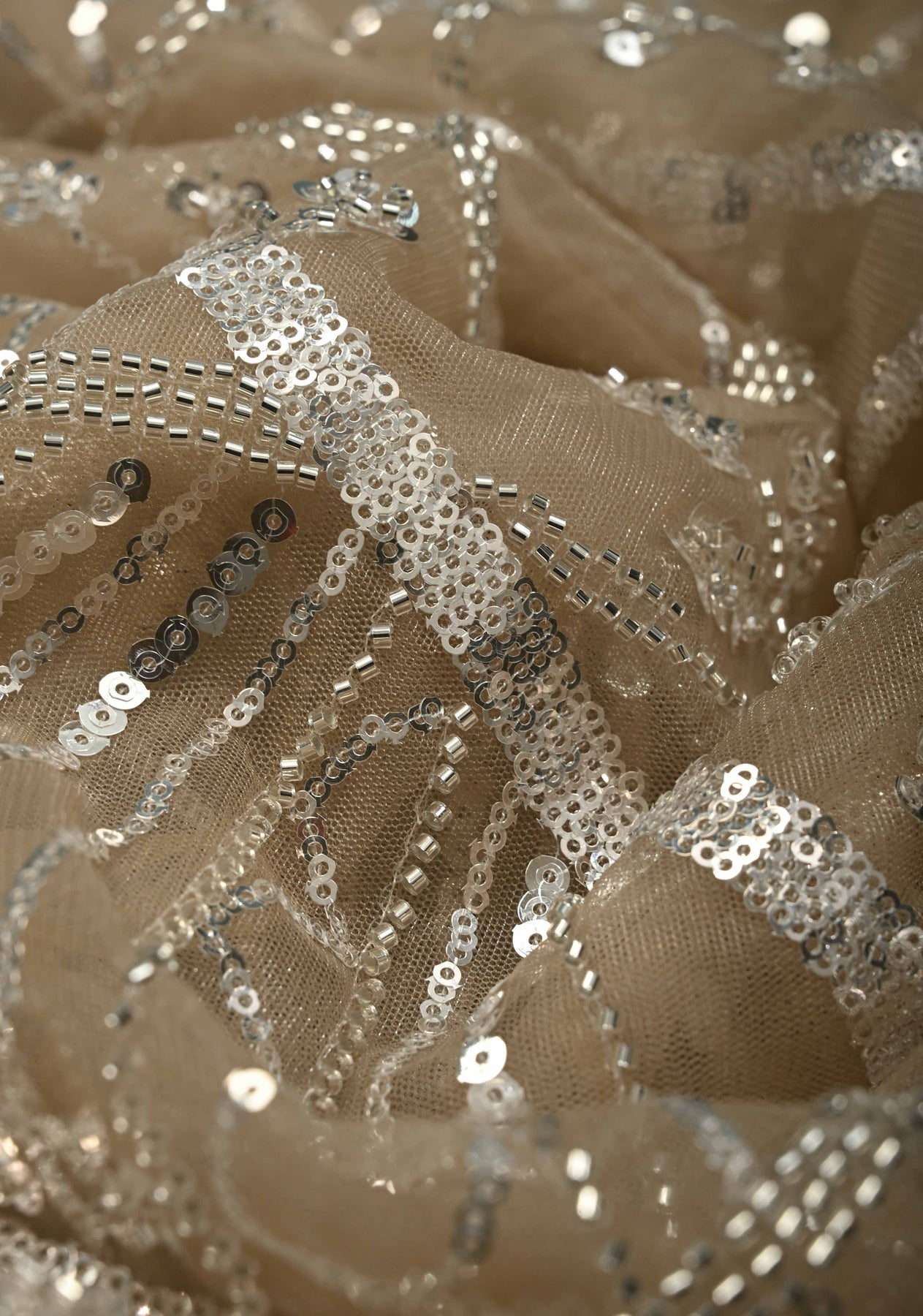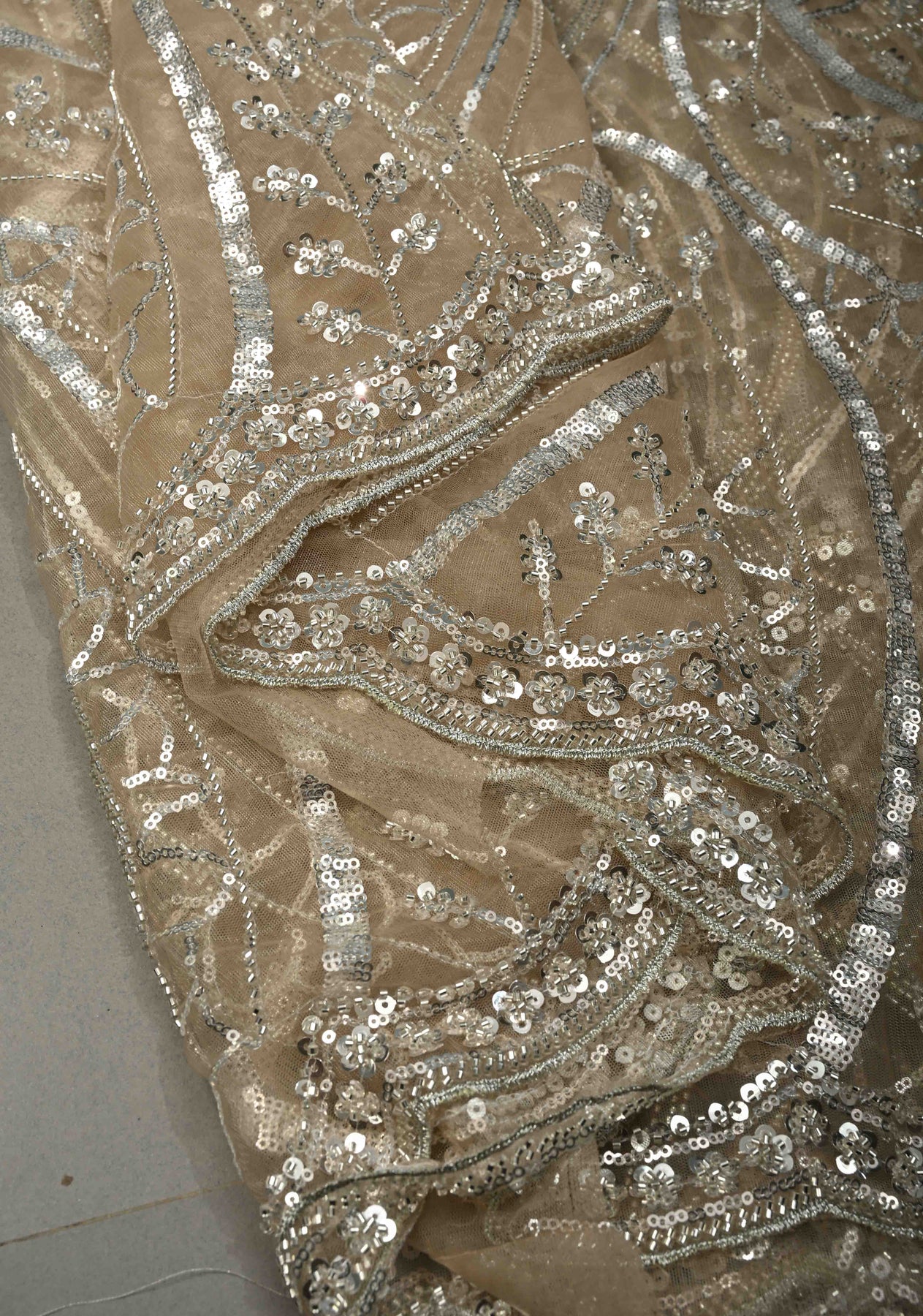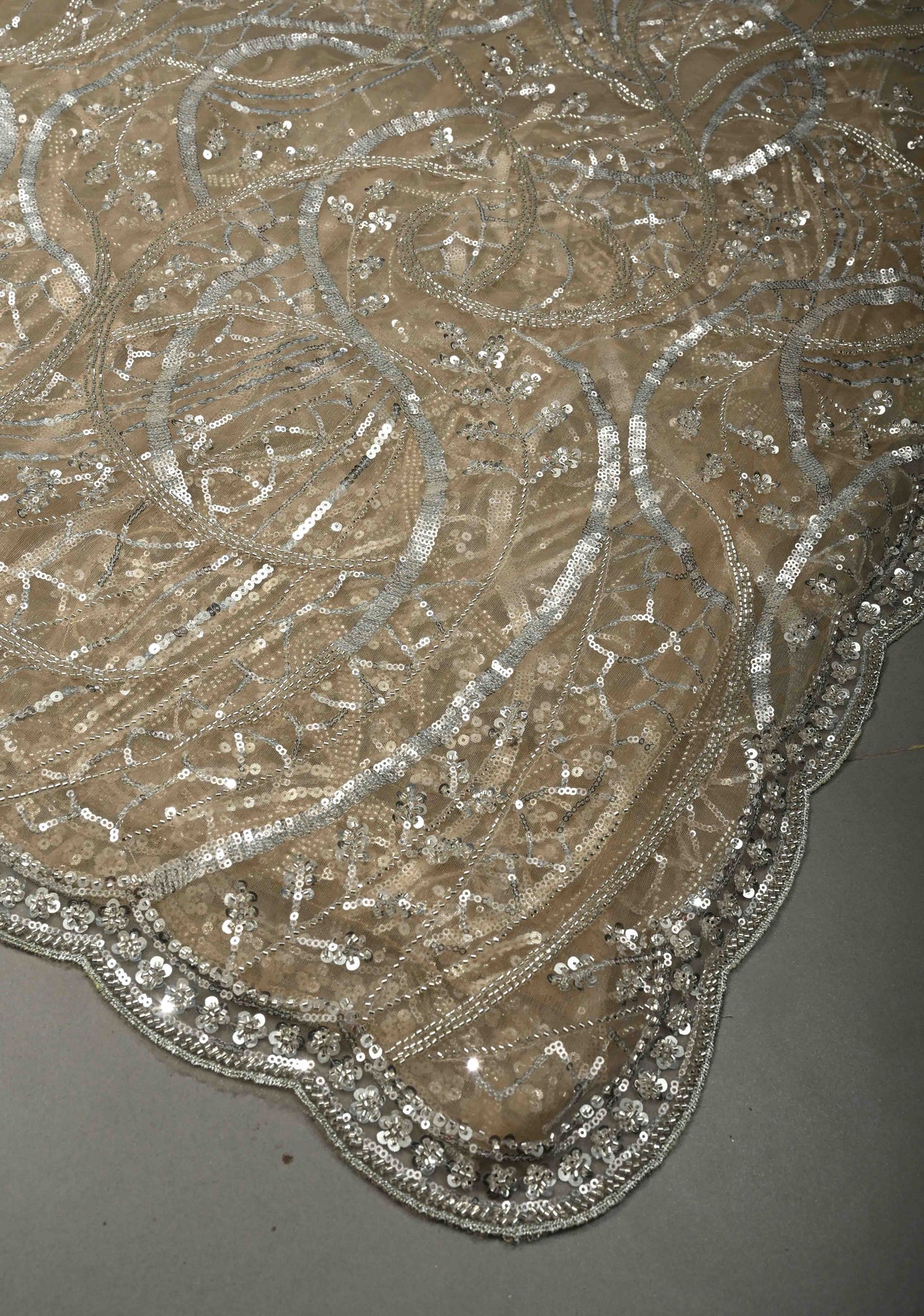 Elevate your evening elegance with this Champagne Beige Net Saree, beautifully embellished with swirling sequin and cutdana work that creates a soft, radiant shimmer. The refined champagne beige tone exudes understated luxury, while the sheer net fabric lends a light, graceful drape. Intricate embellishments flow seamlessly across the saree, adding depth and movement, and the delicately crafted scalloped border enhances its feminine and sophisticated appeal. Perfect for receptions, cocktail parties, and festive celebrations, this saree is designed to make a graceful statement with timeless charm and modern finesse