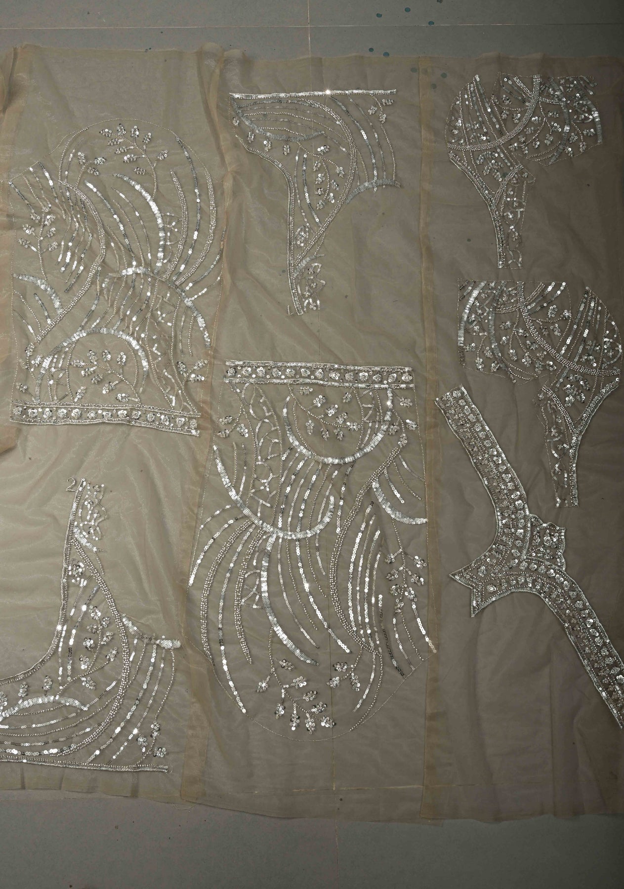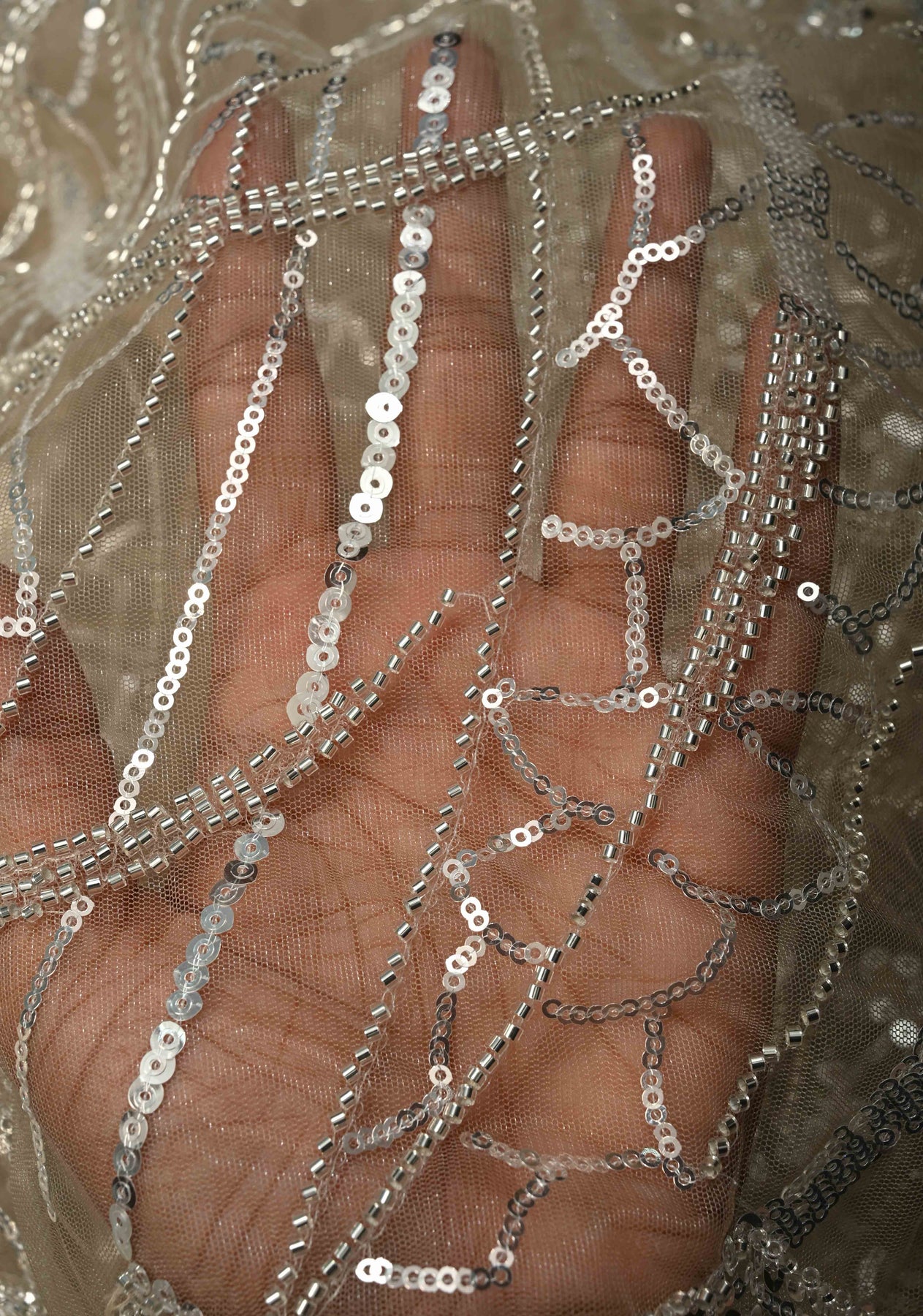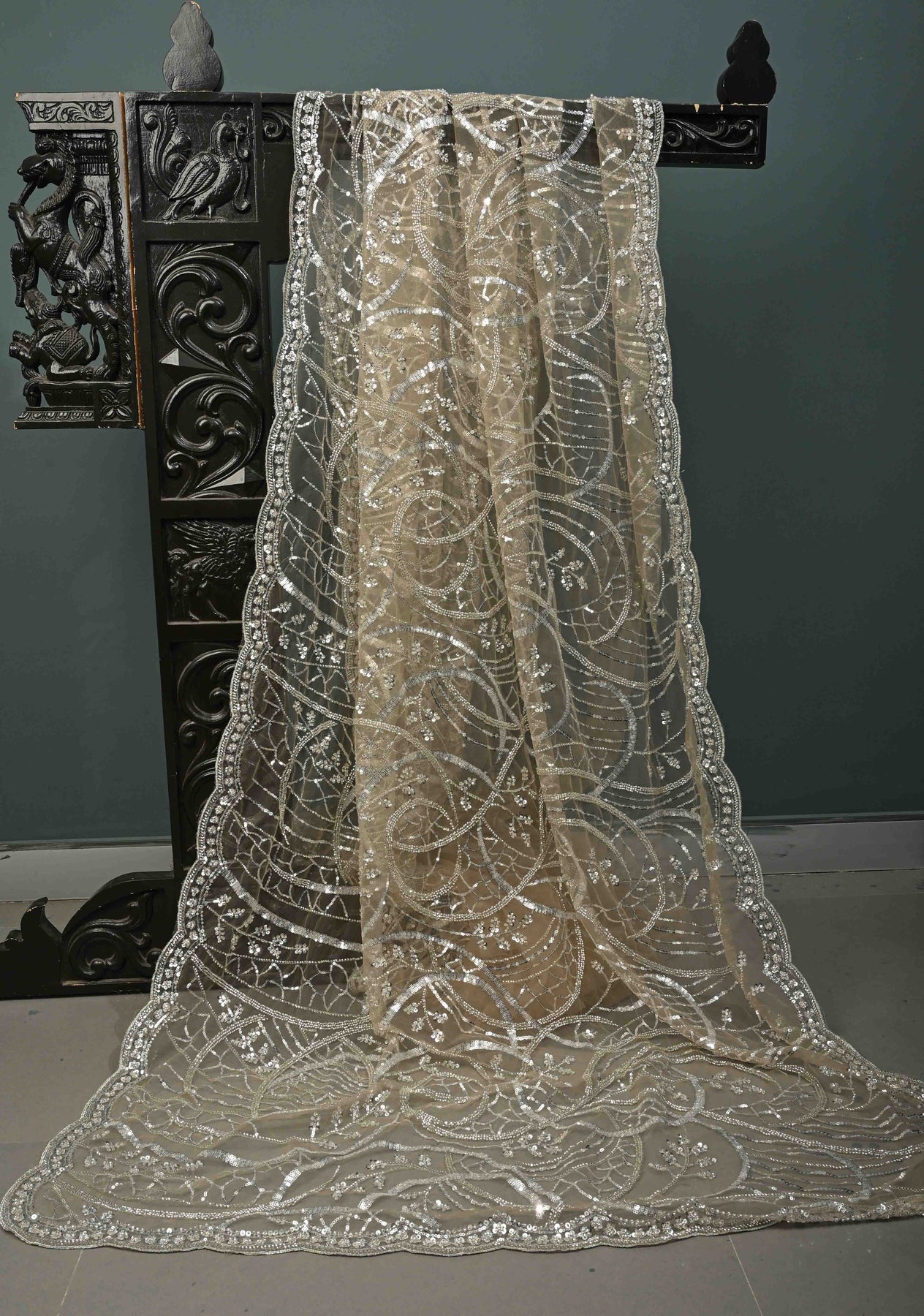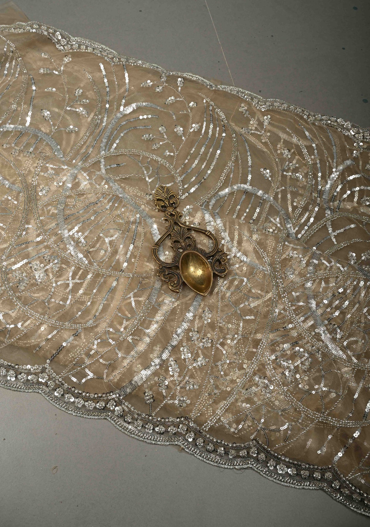 Elevate your evening elegance with this Champagne Beige Net Saree, beautifully embellished with swirling sequin and cutdana work that creates a soft, radiant shimmer. The refined champagne beige tone exudes understated luxury, while the sheer net fabric lends a light, graceful drape. Intricate embellishments flow seamlessly across the saree, adding depth and movement, and the delicately crafted scalloped border enhances its feminine and sophisticated appeal. Perfect for receptions, cocktail parties, and festive celebrations, this saree is designed to make a graceful statement with timeless charm and modern finesse
