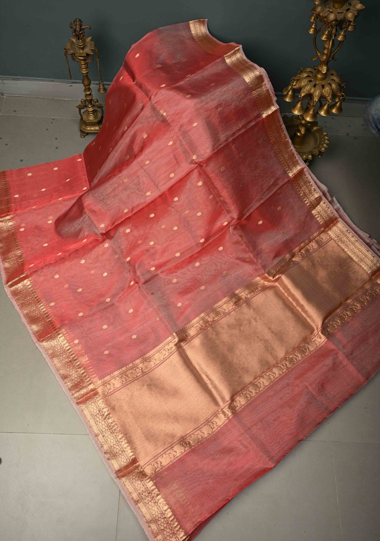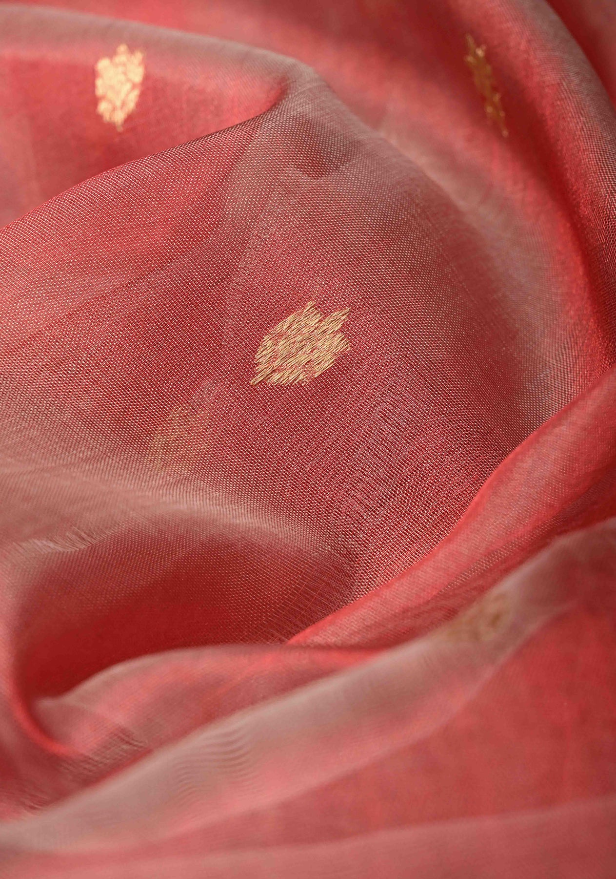 Add timeless elegance to your wardrobe with this Coral Pink Pure Banarasi Organza Silk Saree. Handwoven with care on traditional looms, this saree features delicate floral zari buttas throughout the body, exuding subtle sophistication. The zari border enhances the saree’s charm, giving it a regal finish perfect for weddings, festive occasions, or special celebrations.