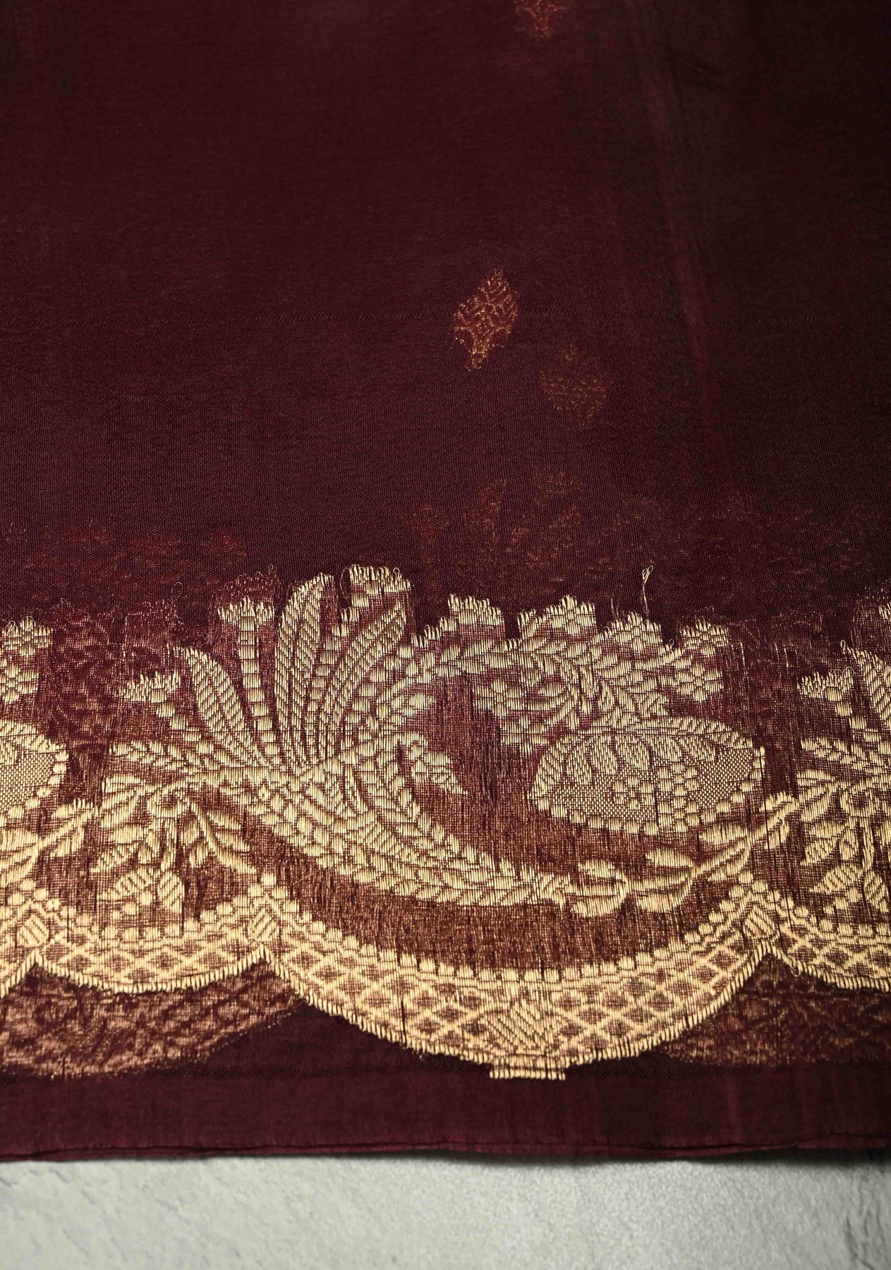 The intricate scallop zari border adds a refined finishing touch, enhancing its festive and ceremonial appeal. Lightweight and airy, this saree drapes beautifully, making it ideal for weddings, formal gatherings, and traditional celebrations