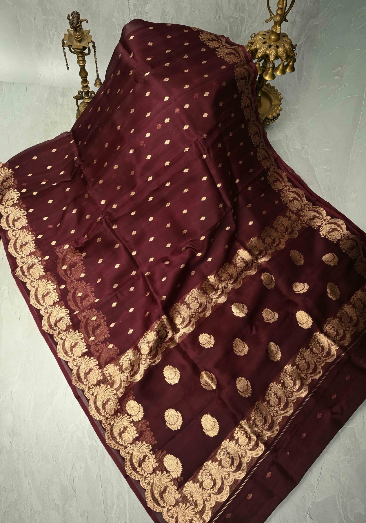 Exude elegance and timeless charm with this Rich Brown Pure Banarasi Organza Silk Saree, a perfect blend of sophistication and traditional craftsmanship. Woven from luxurious pure organza silk, the saree features delicate zari buttas that shimmer gracefully across the rich brown fabric.