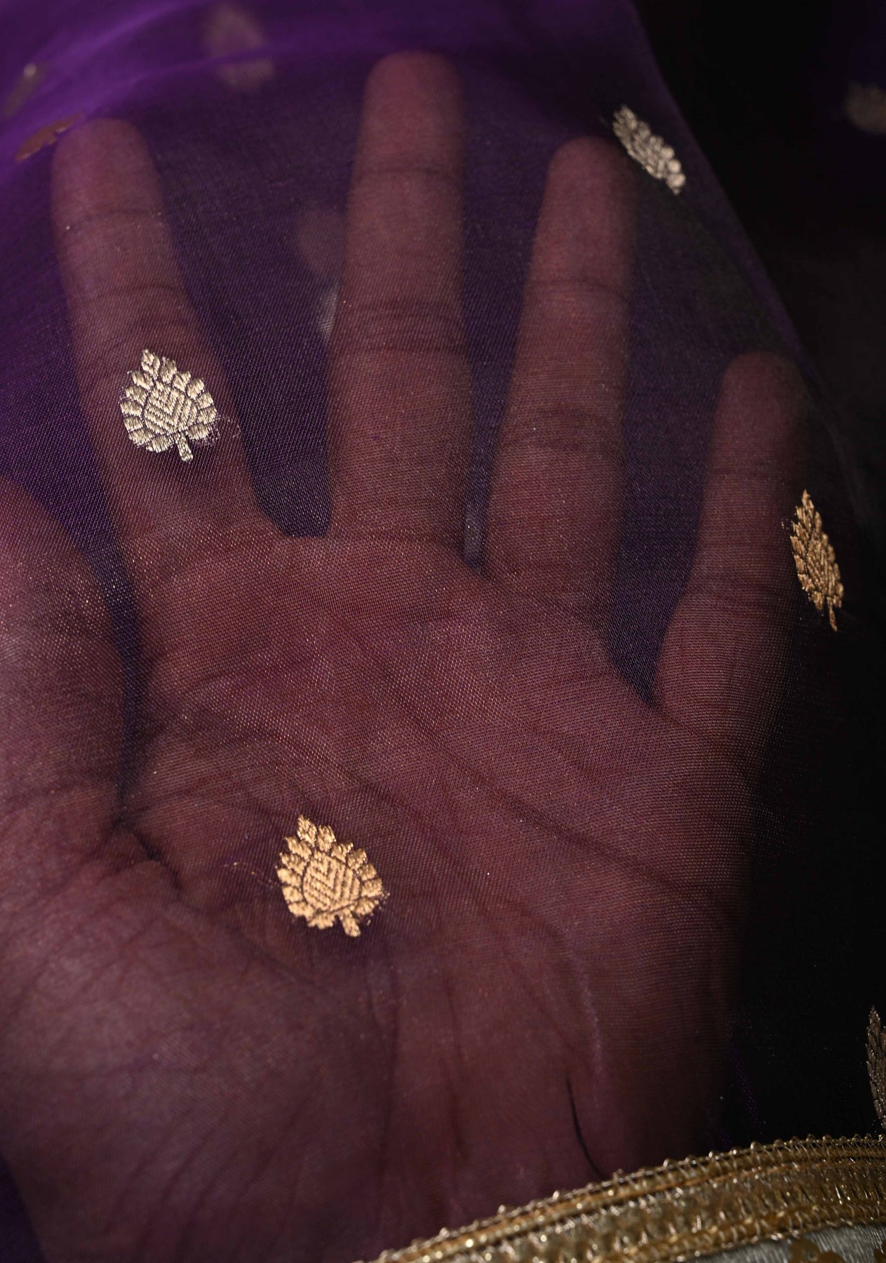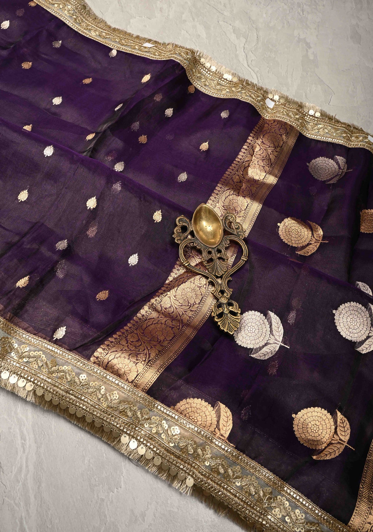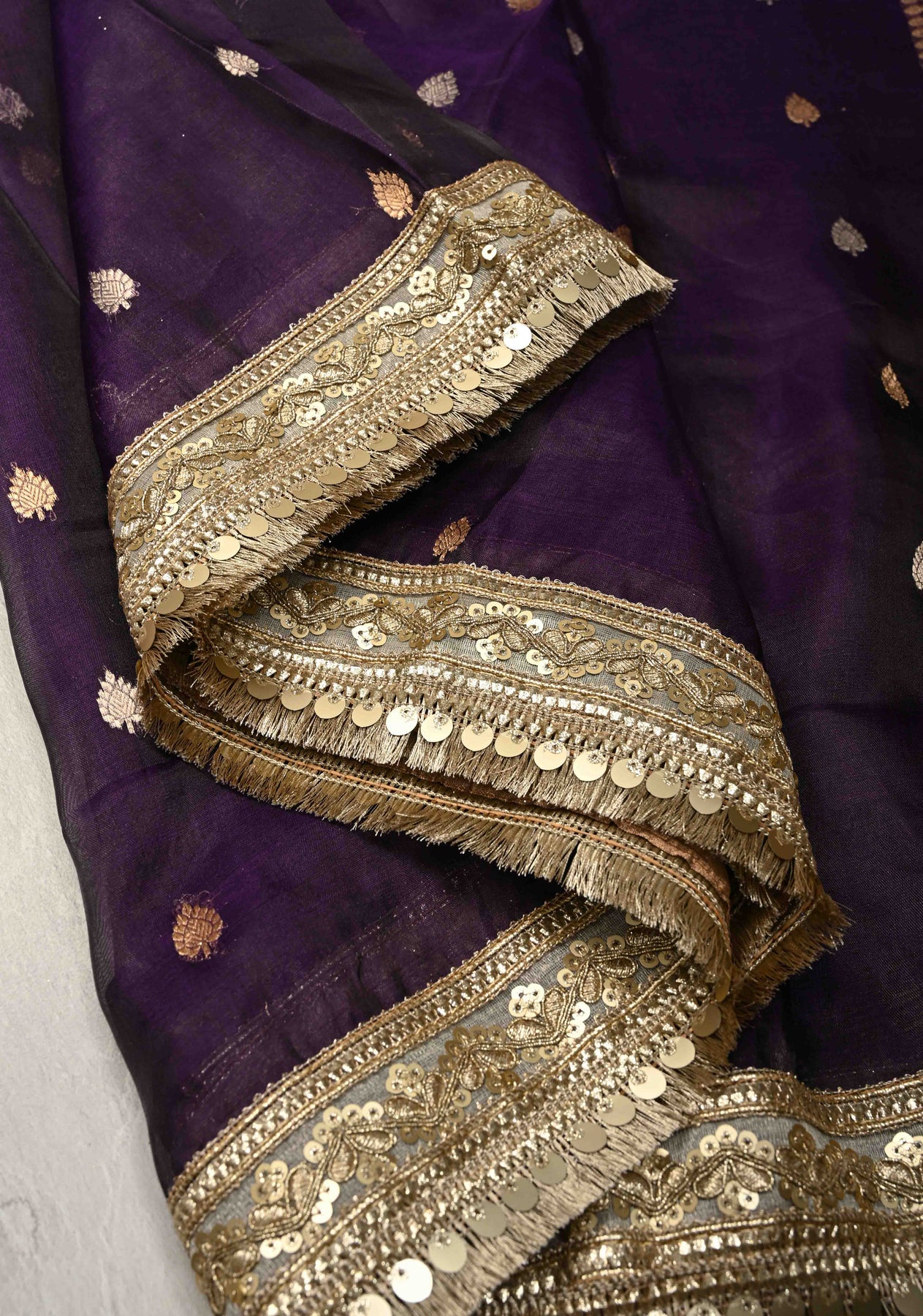 Eggplant Purple Organza Silk Saree with Sona Rupa Buttis and Fancy Lace Trim Border | SILK MARK CERTIFIED