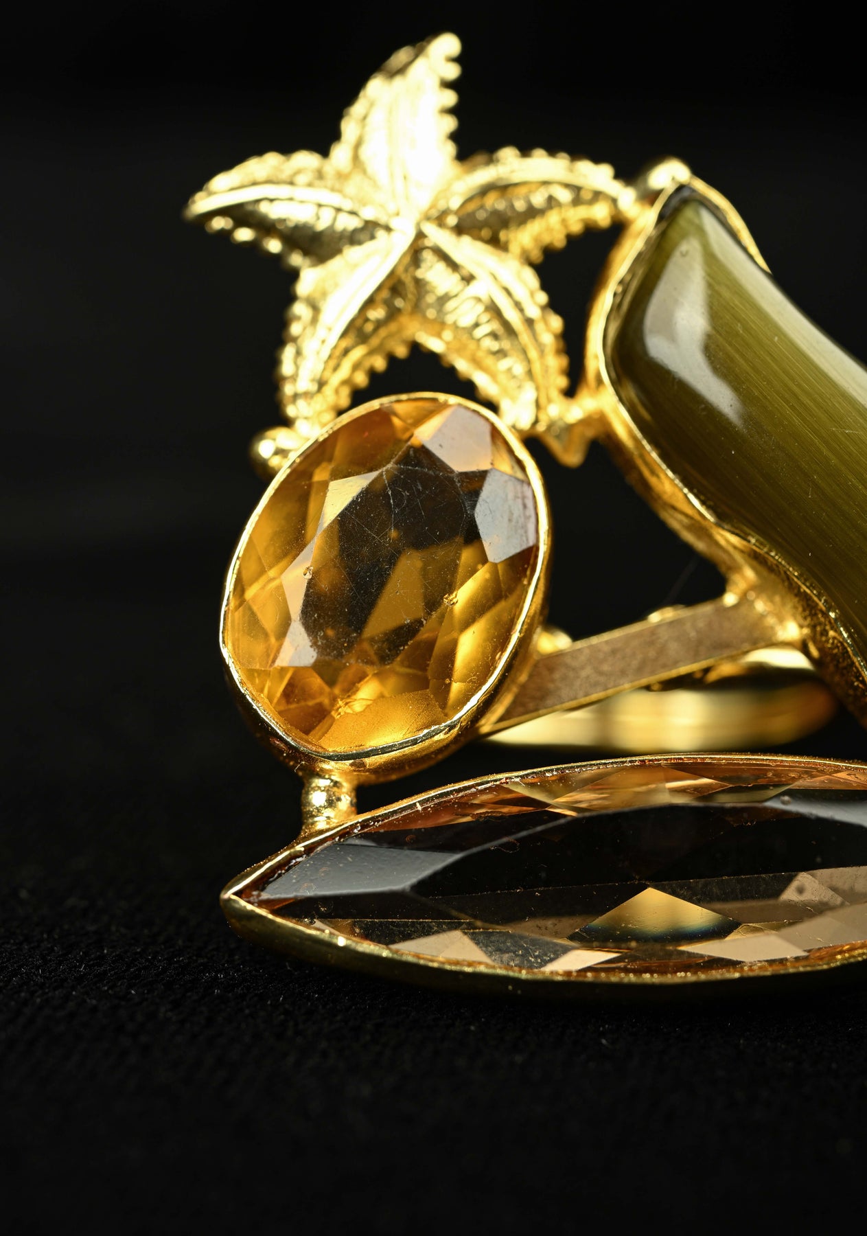 Bright and whimsical, the Gold Starfish Motif Ring with Yellow–White–Green Glass Gemstone is inspired by the carefree beauty of the ocean. Featuring a charming starfish motif in a warm gold tone, this statement ring is accented with a vibrant yellow, white, and green glass gemstone that adds a fresh, sunlit appeal. Perfect for resort wear, festive occasions, and contemporary styling, this ring brings playful elegance and coastal charm to any look.