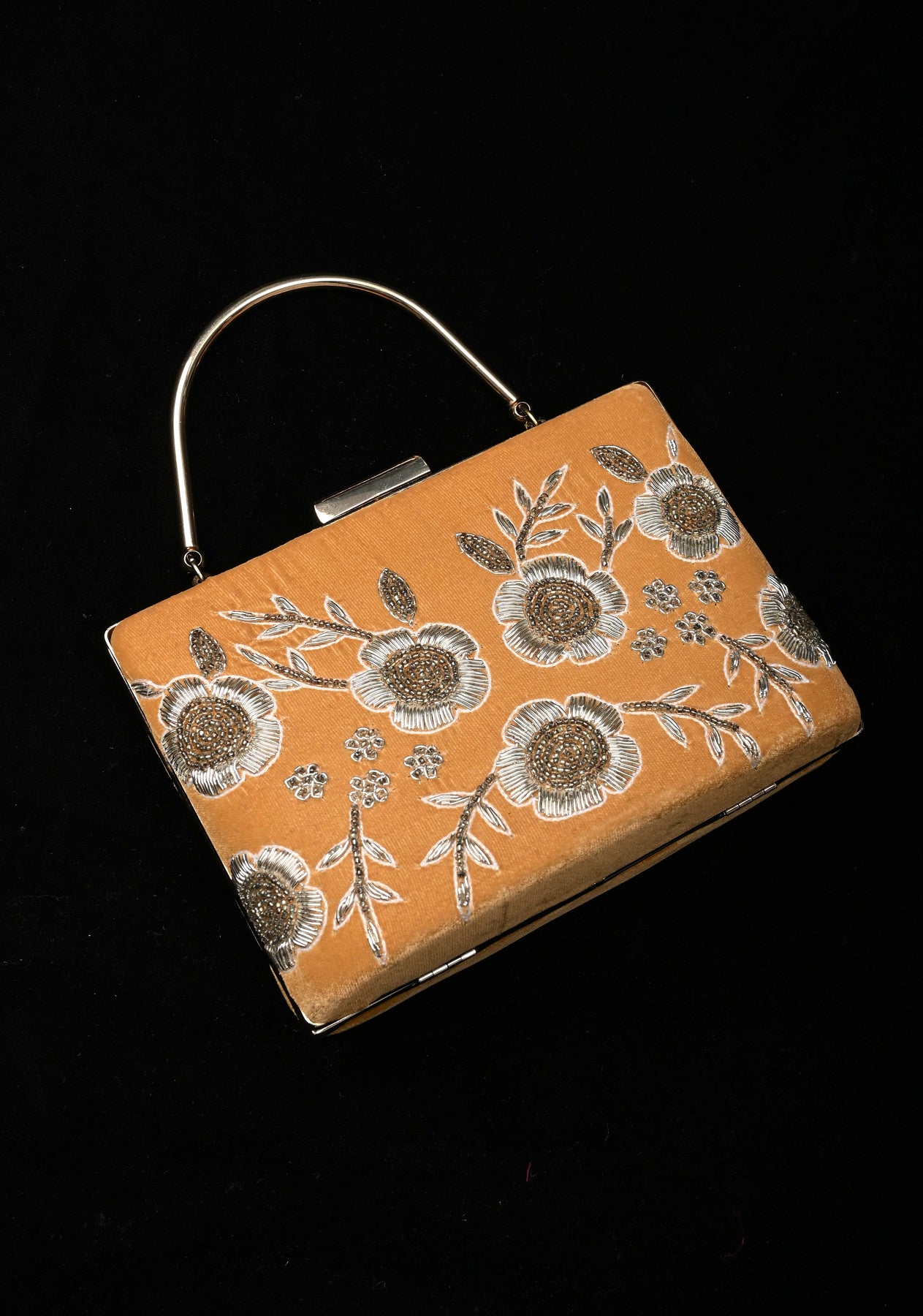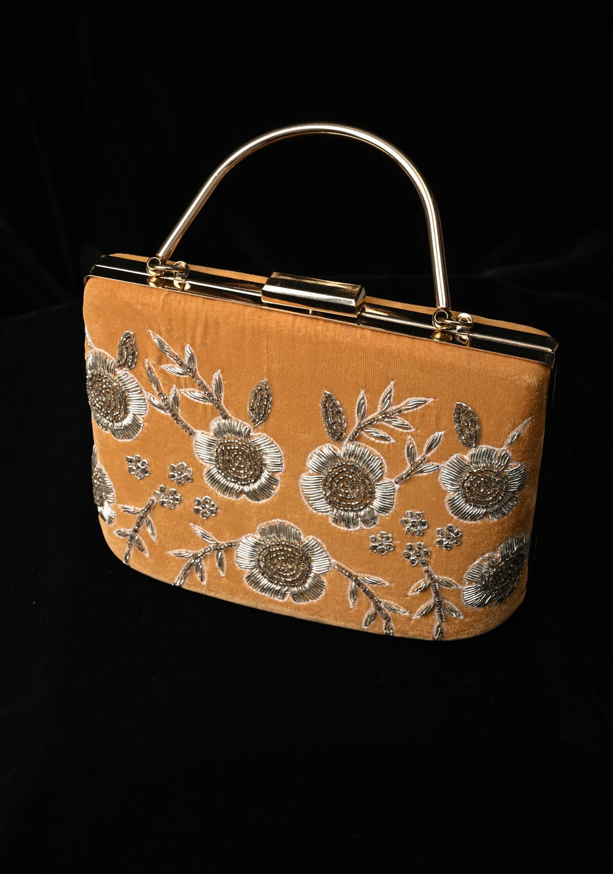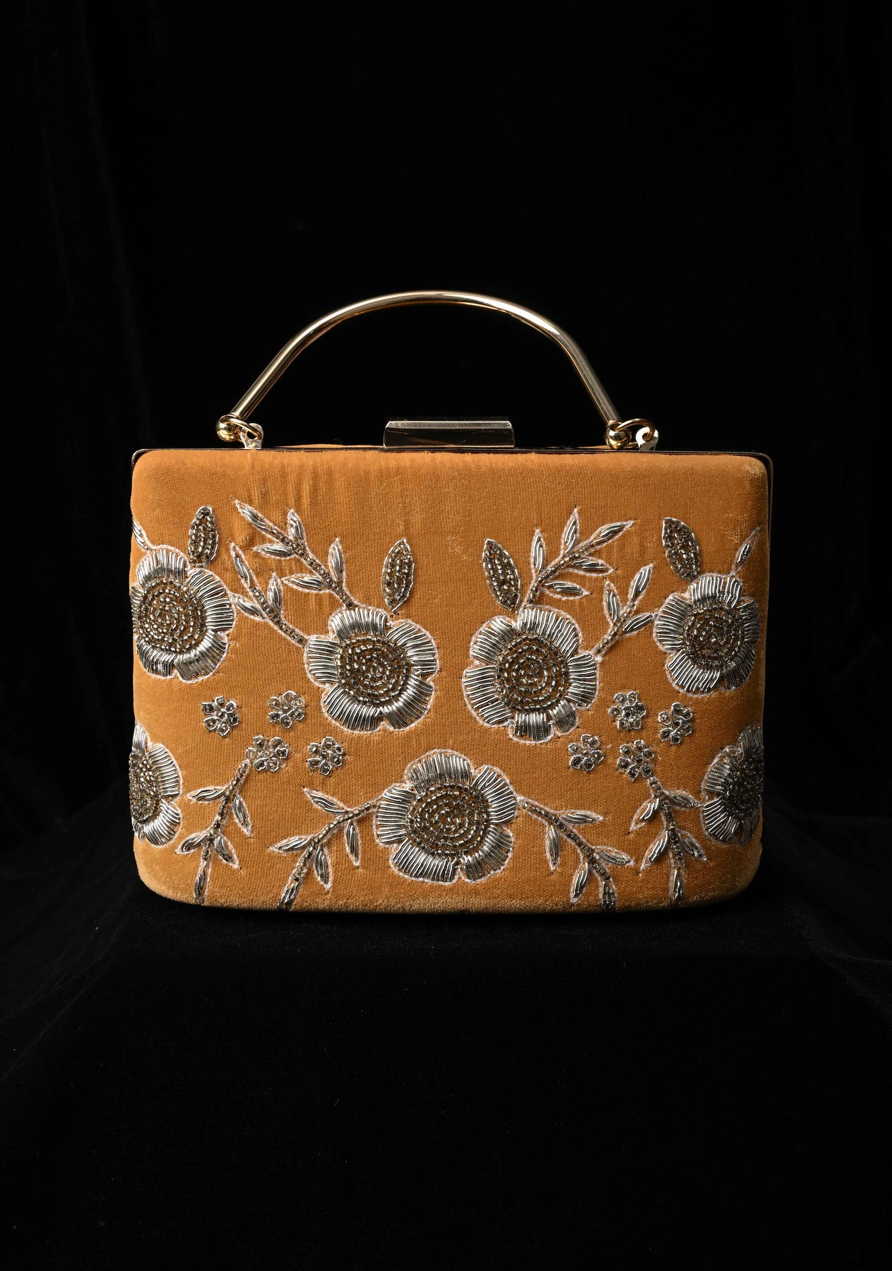 The golden hue complements both traditional and contemporary outfits, while the structured silhouette and secure clasp add functionality to its ornate design. Whether you're attending a wedding, festive celebration, or formal soirée, this clutch is sure to turn heads and add a regal touch to your ensemble.