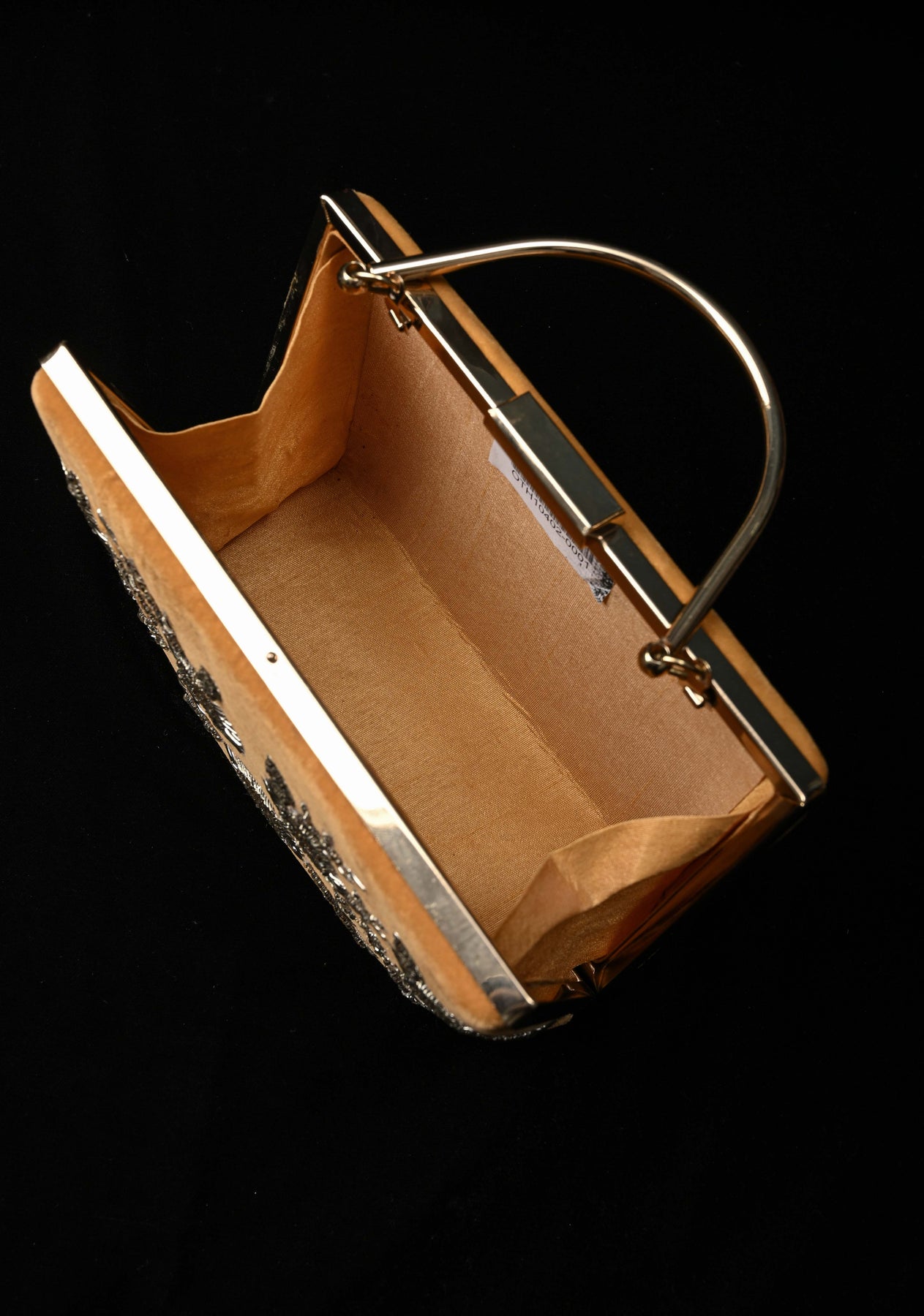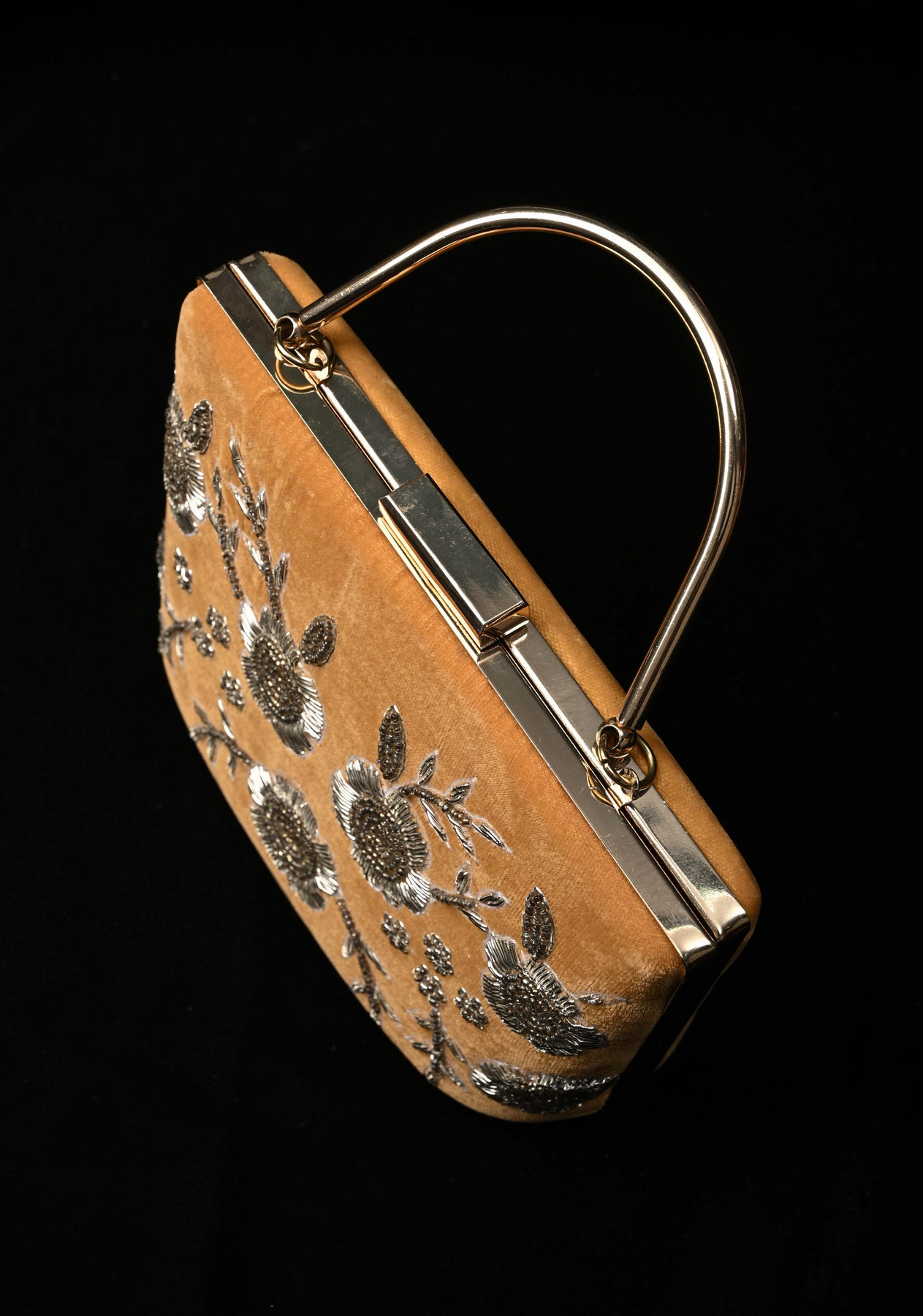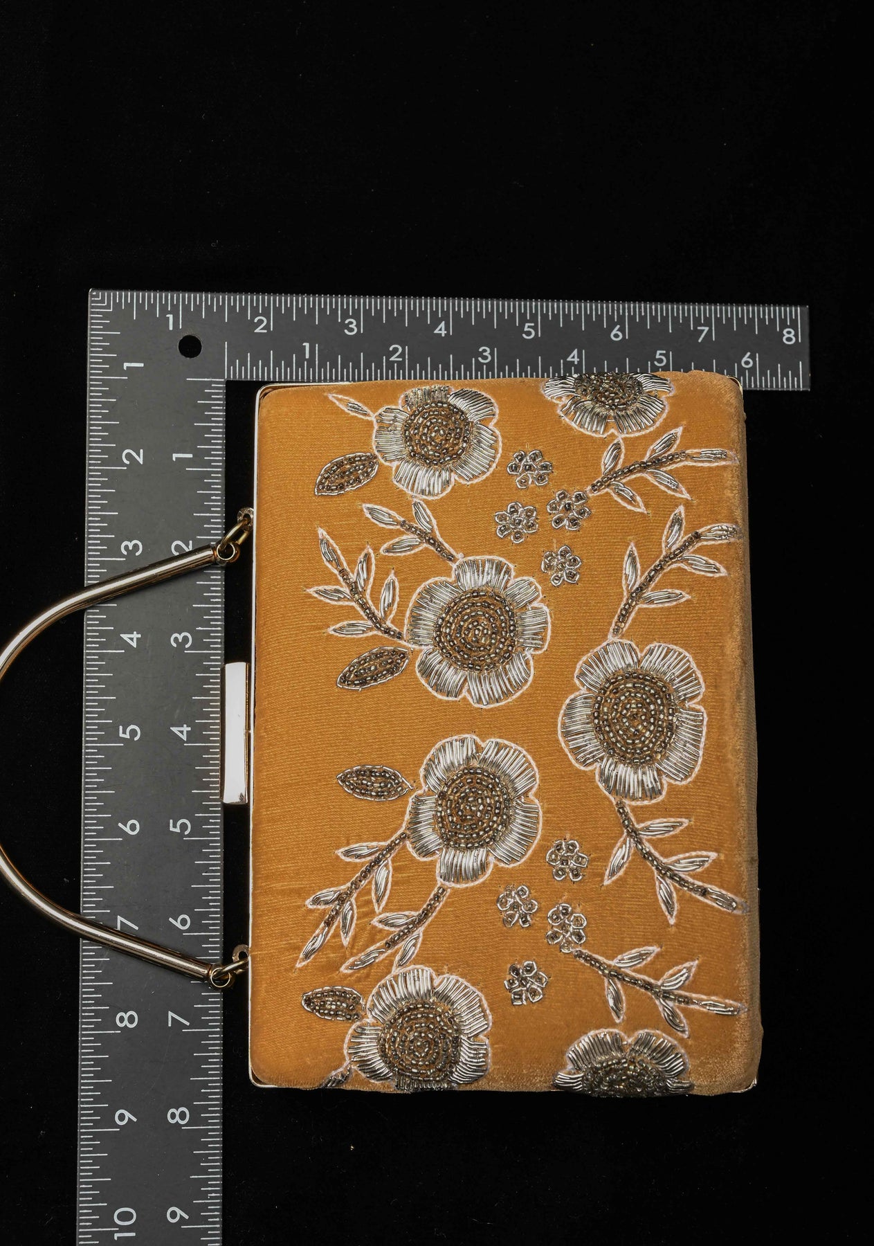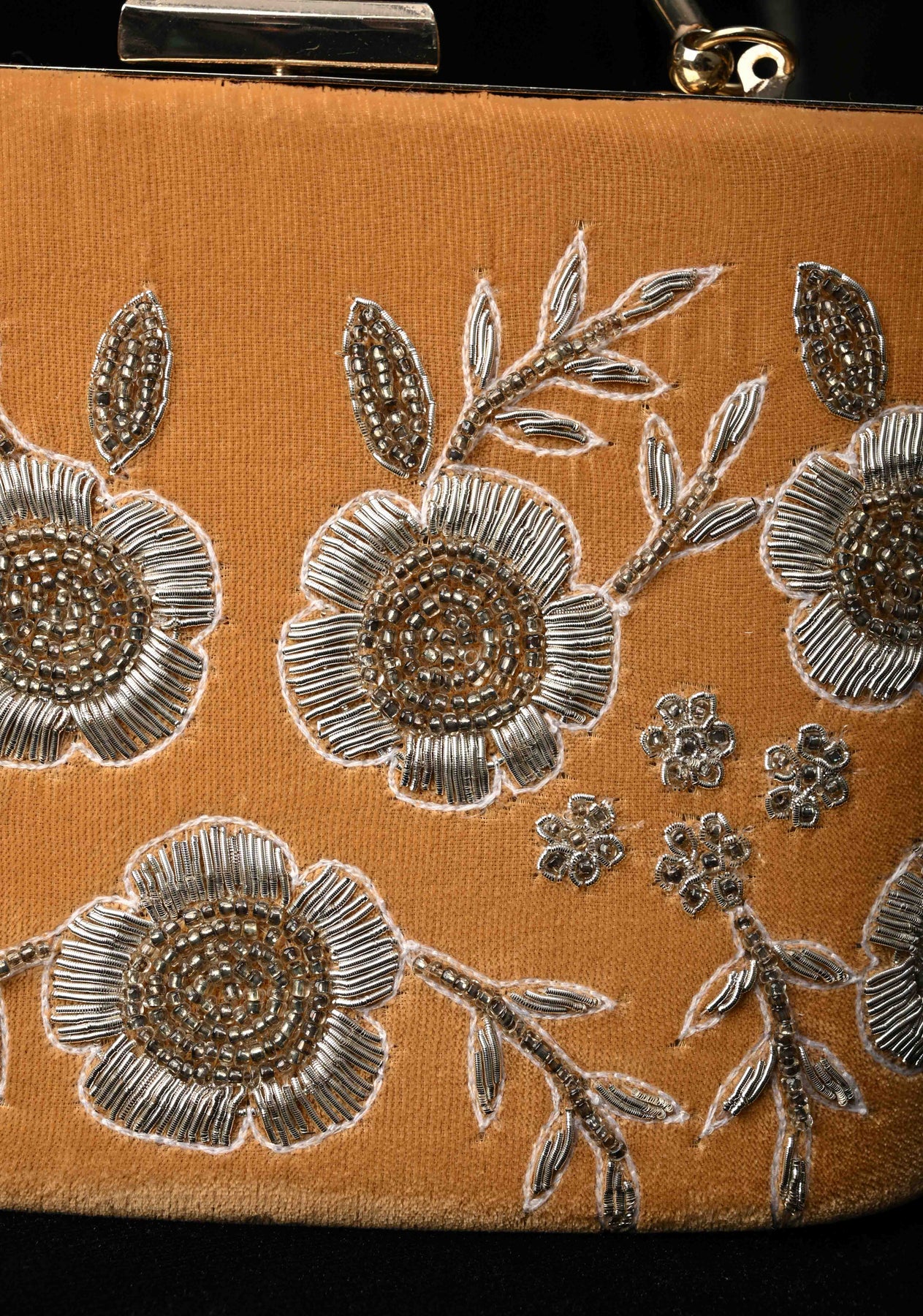 The golden hue complements both traditional and contemporary outfits, while the structured silhouette and secure clasp add functionality to its ornate design. Whether you're attending a wedding, festive celebration, or formal soirée, this clutch is sure to turn heads and add a regal touch to your ensemble.