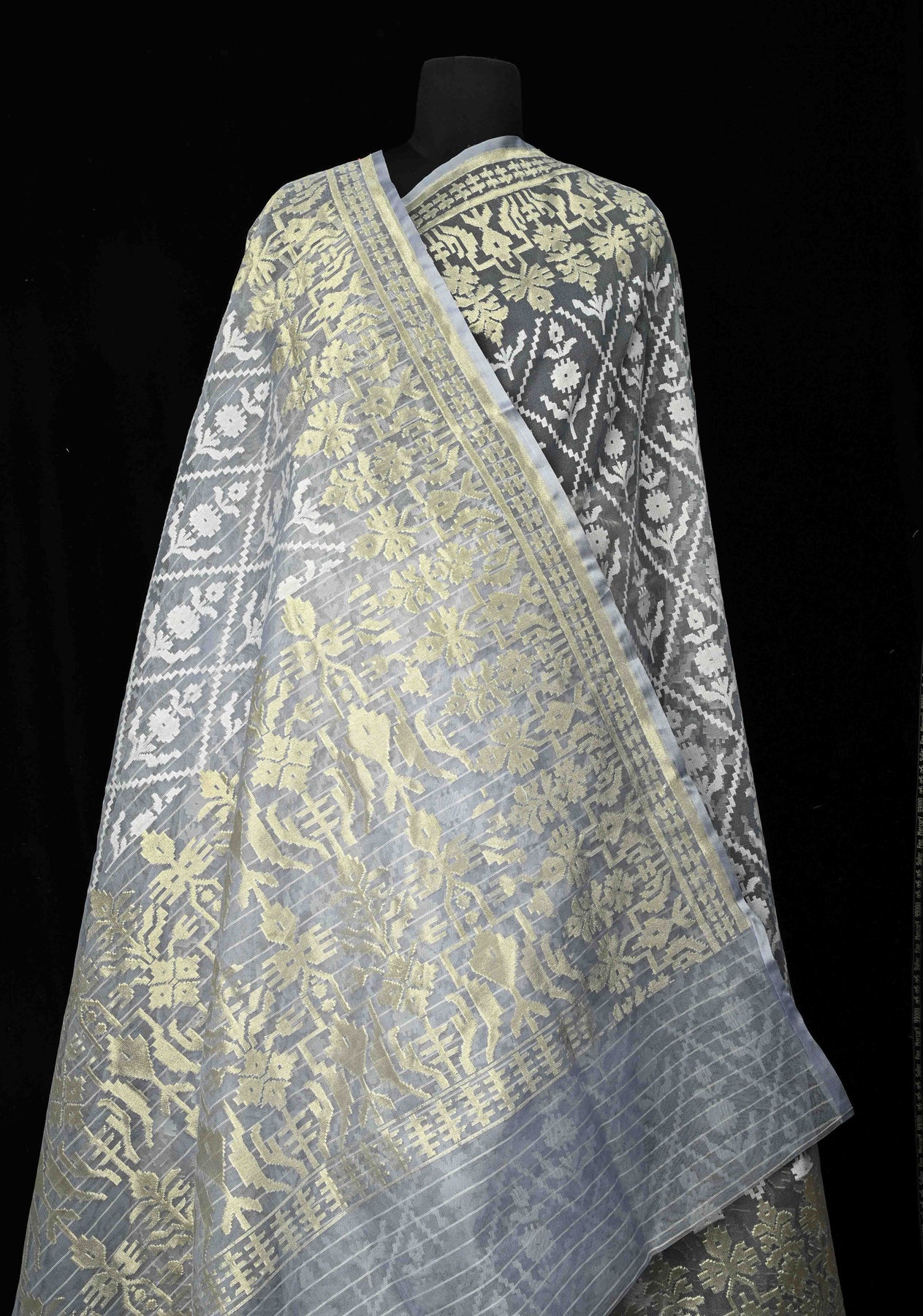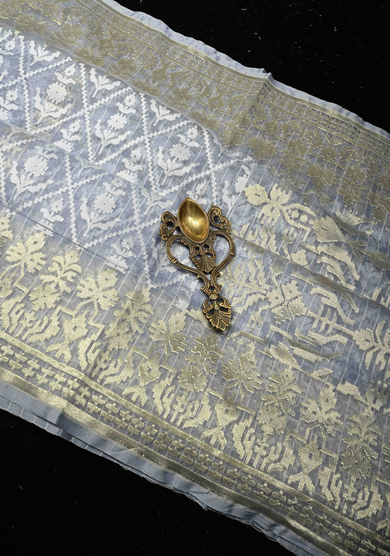 Elevate your ethnic wardrobe with this Gray Blue Handloom Banarasi Net Saree, adorned with exquisite gold and silver butta designs. The intricate handloom weaving adds a touch of traditional elegance, making it a timeless piece for special occasions.