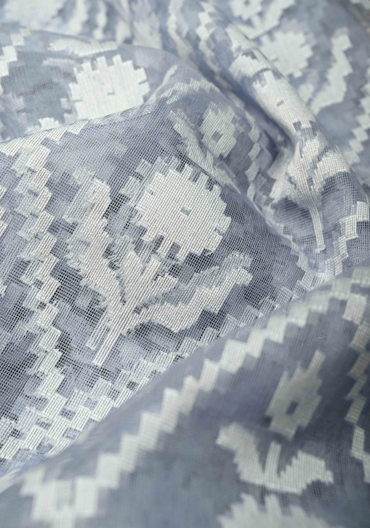Its lightweight net fabric ensures a graceful drape and comfortable wear, perfect for weddings, festivals, and cultural events. The subtle gray-blue hue paired with shimmering buttas gives a regal and sophisticated appeal