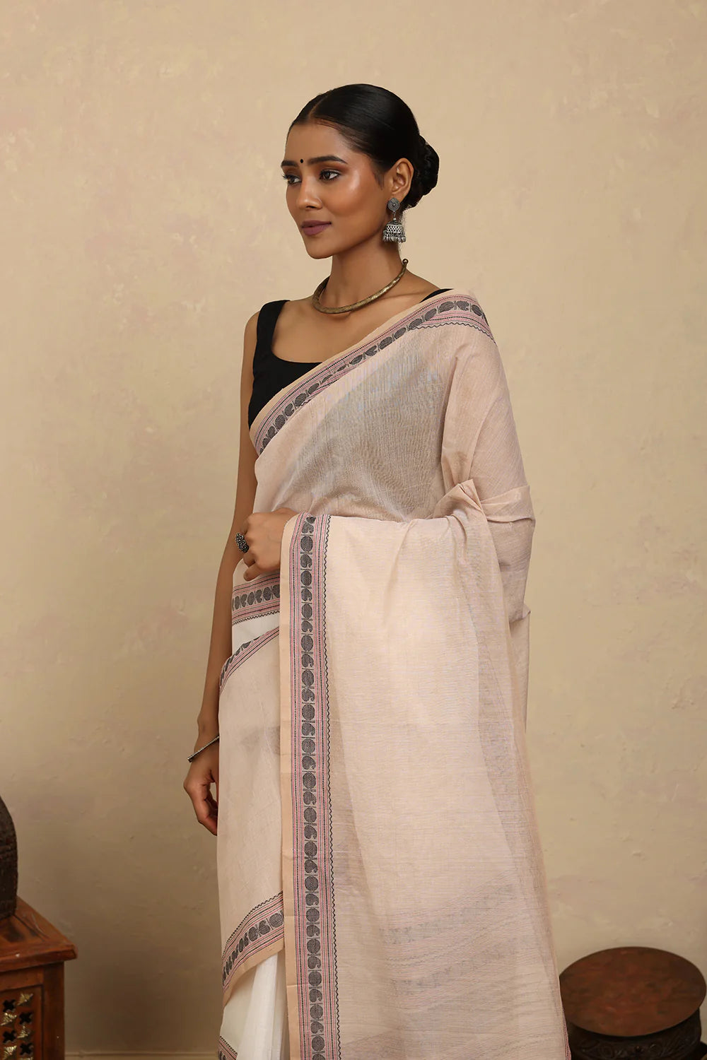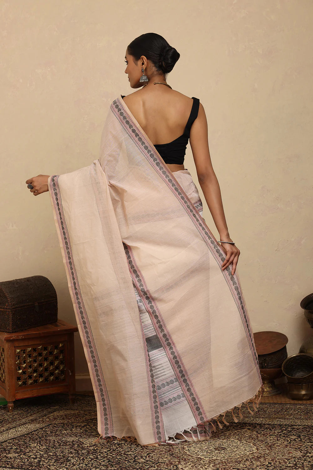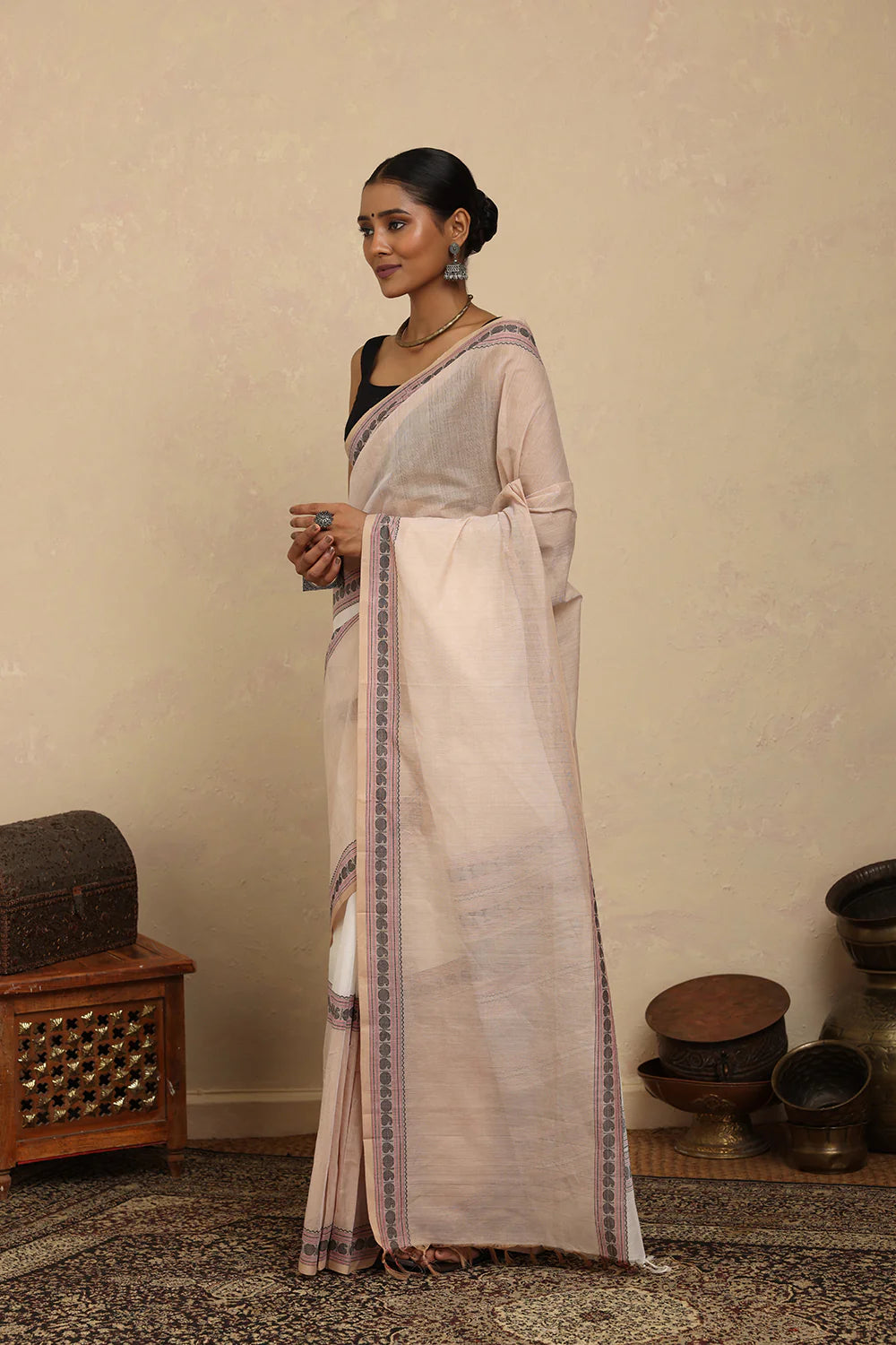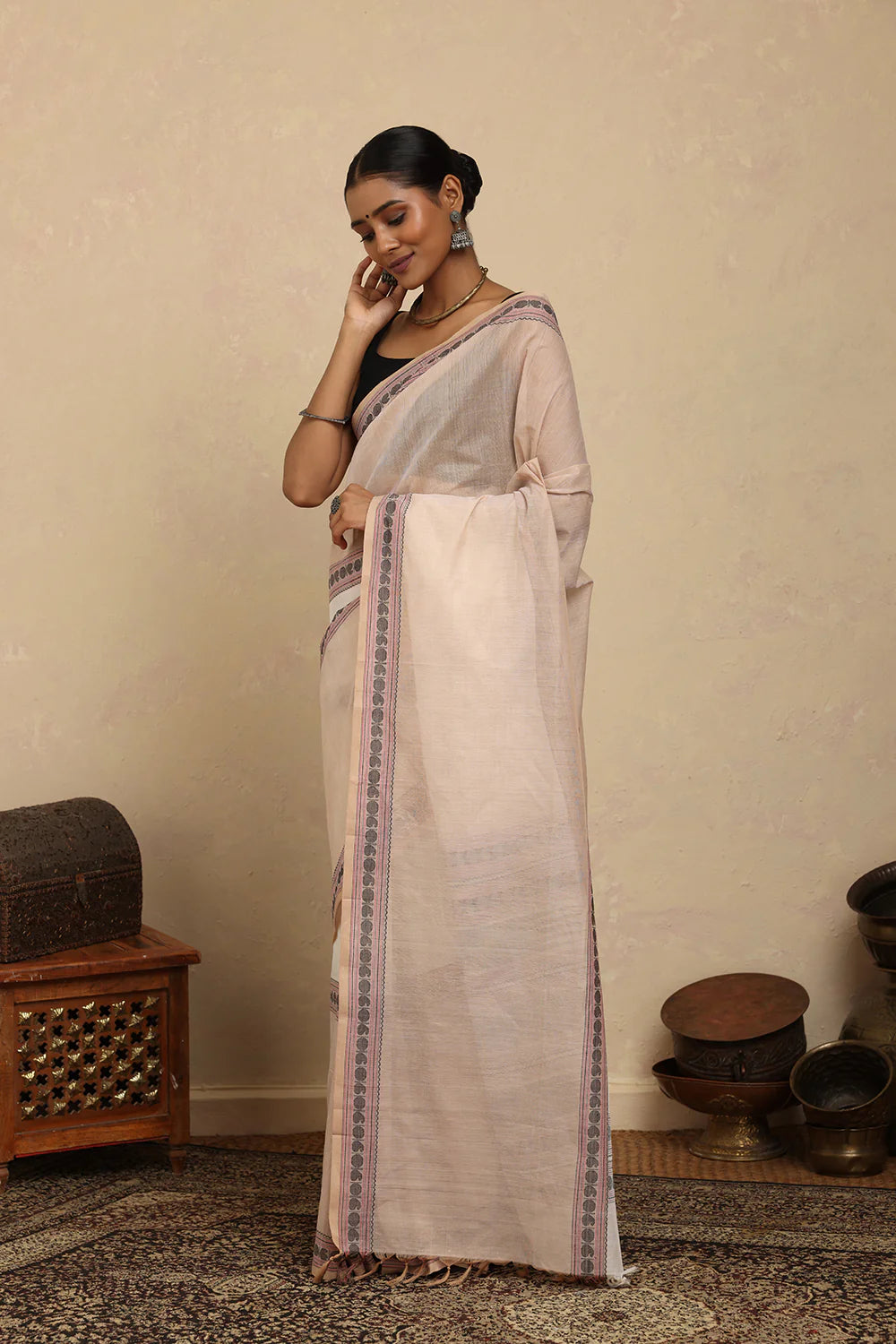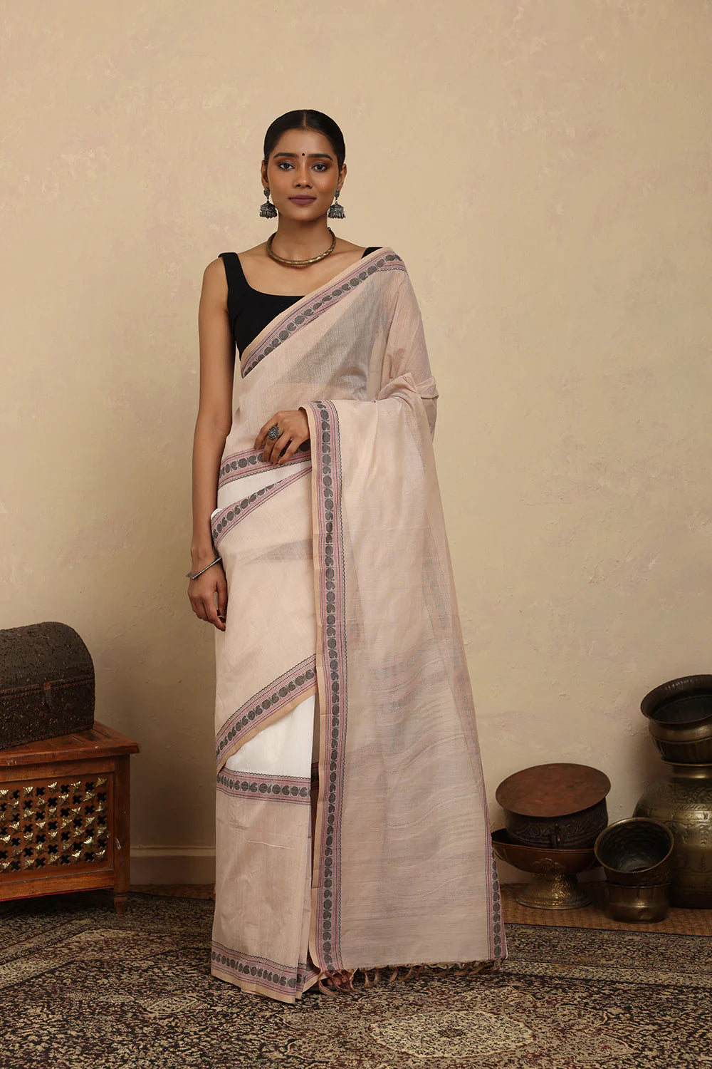 Elegant and soothing, this Handloom Beige and White Kanchi Cotton Saree reflect timeless charm. Handwoven in fine cotton, it promises breathable comfort and an easy drape. The soft beige paired with pristine white creates a graceful contrast, making it suitable for festive rituals, cultural gatherings, or everyday elegance. A classic handloom weave for versatile styling.