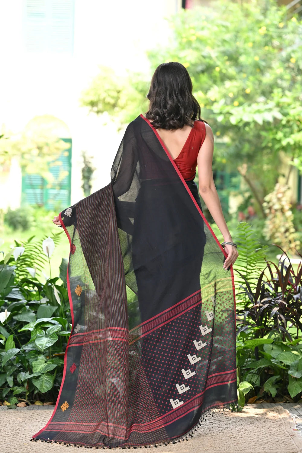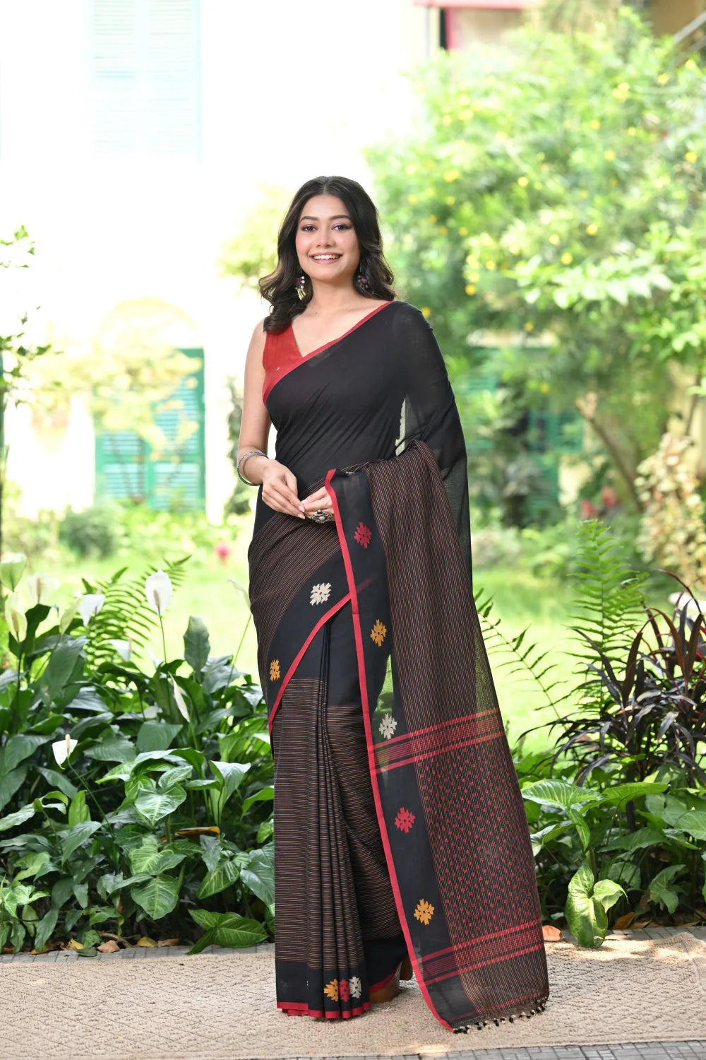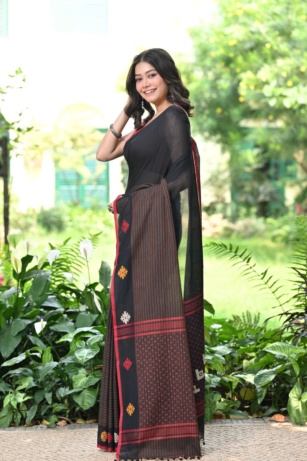 Step into timeless sophistication with our Handloom Black Soft Cotton Jamdani Saree, featuring a sleek red border adorned with multi-color motifs woven intricately along the border and pallu. Meticulously crafted, this saree exudes elegance and grace. The contrasting hues add a touch of vibrancy to its classic black backdrop. Crafted from soft cotton, it promises comfort and style with every drape. Elevate your wardrobe with this exquisite piece, blending tradition with contemporary allure. Explore our collection and immerse yourself in the beauty of handloom craftsmanship.