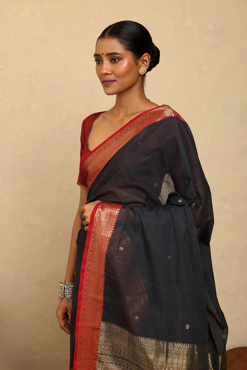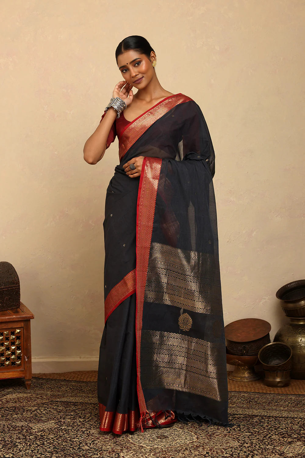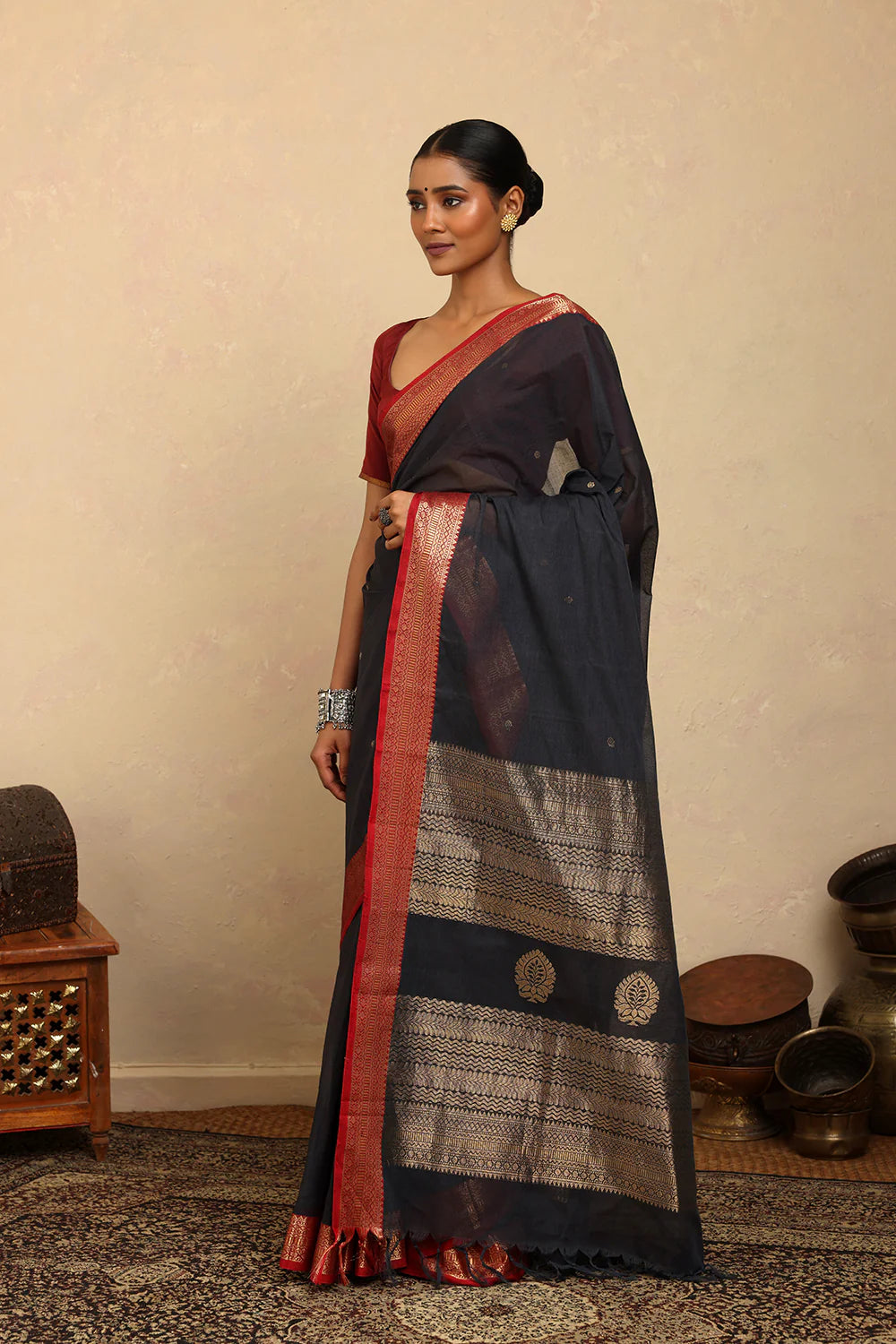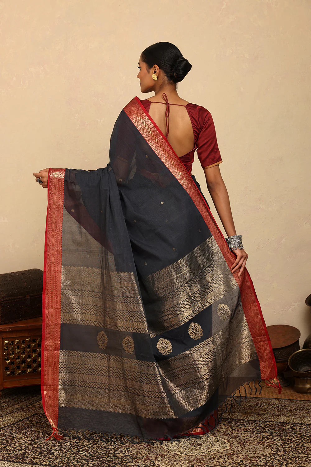 Drape timeless elegance with our Handloom Deark Grey Kanchi Cotton Saree, beautifully accented with a bold red zari border. Woven with precision, this saree balances tradition and sophistication. Lightweight, breathable, and versatile, it is perfect for festive occasions, celebrations, or elegant daily wear. A classic addition to your wardrobe, showcasing the finesse of handloom weaving.