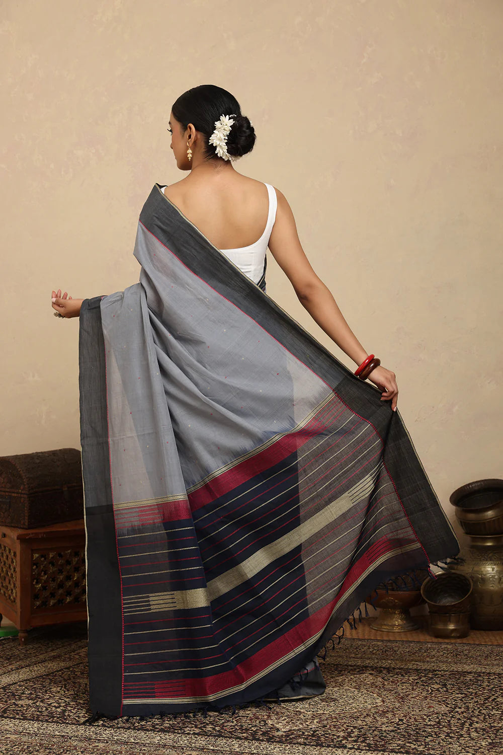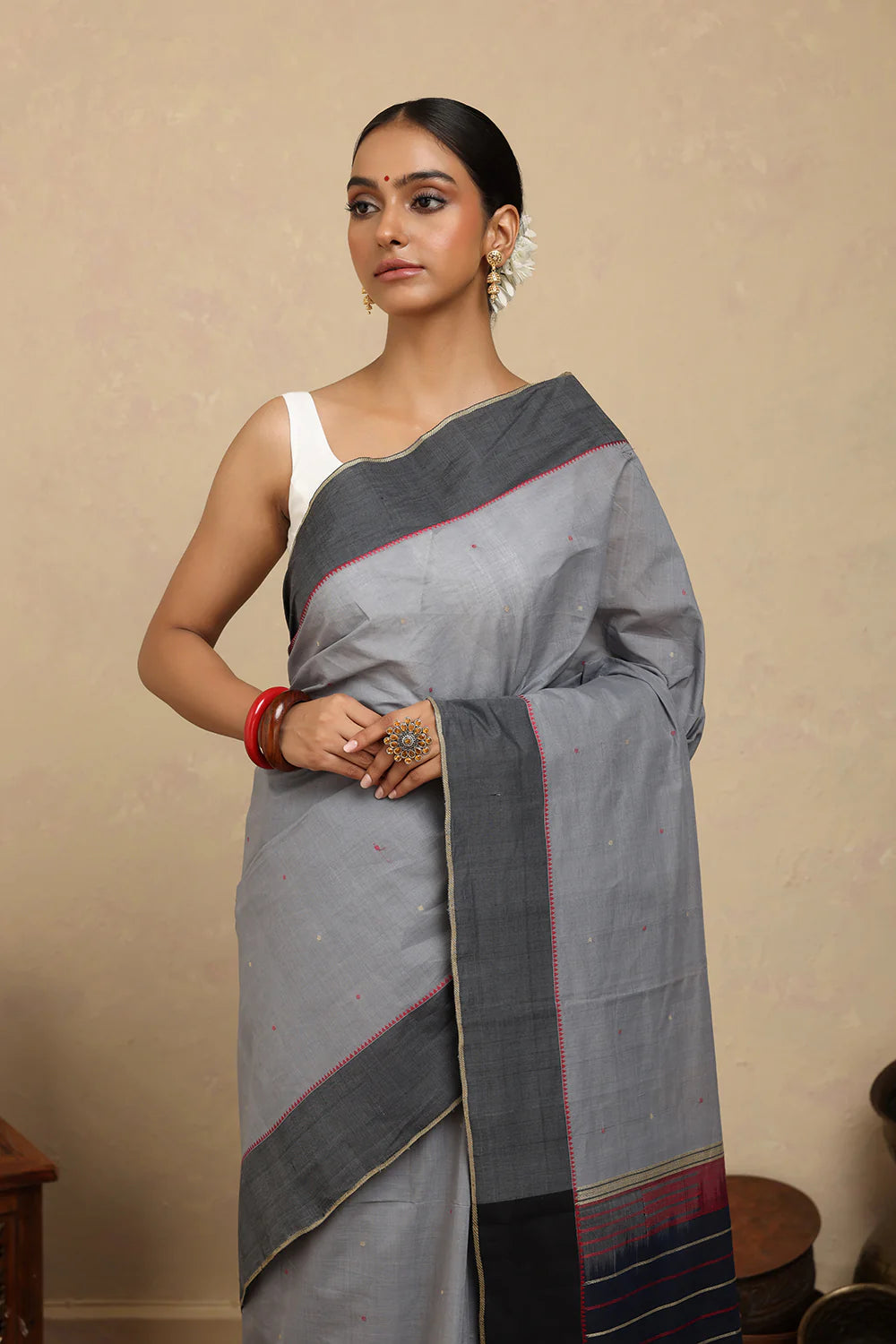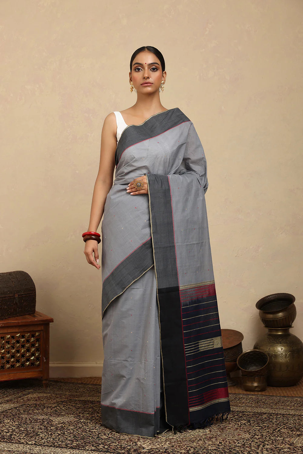 Refined and minimal, this Handloom Grey Kanchi Cotton Saree with Dark Grey Border embodies understated elegance. Handwoven in pure cotton, it ensures breathability, comfort, and a graceful drape. The soft grey body paired with a deep grey border creates a subtle contrast, making it perfect for formal occasions, traditional gatherings, or everyday timeless style.