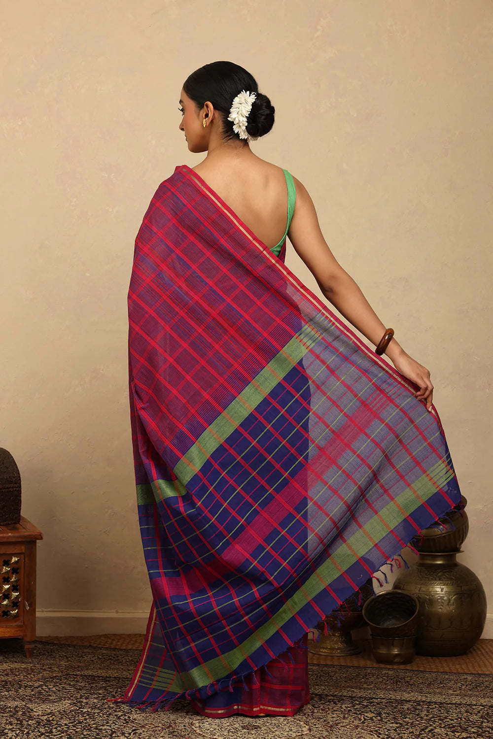 Handloom Hot Pink & Blue Check Kanchi Cotton Saree