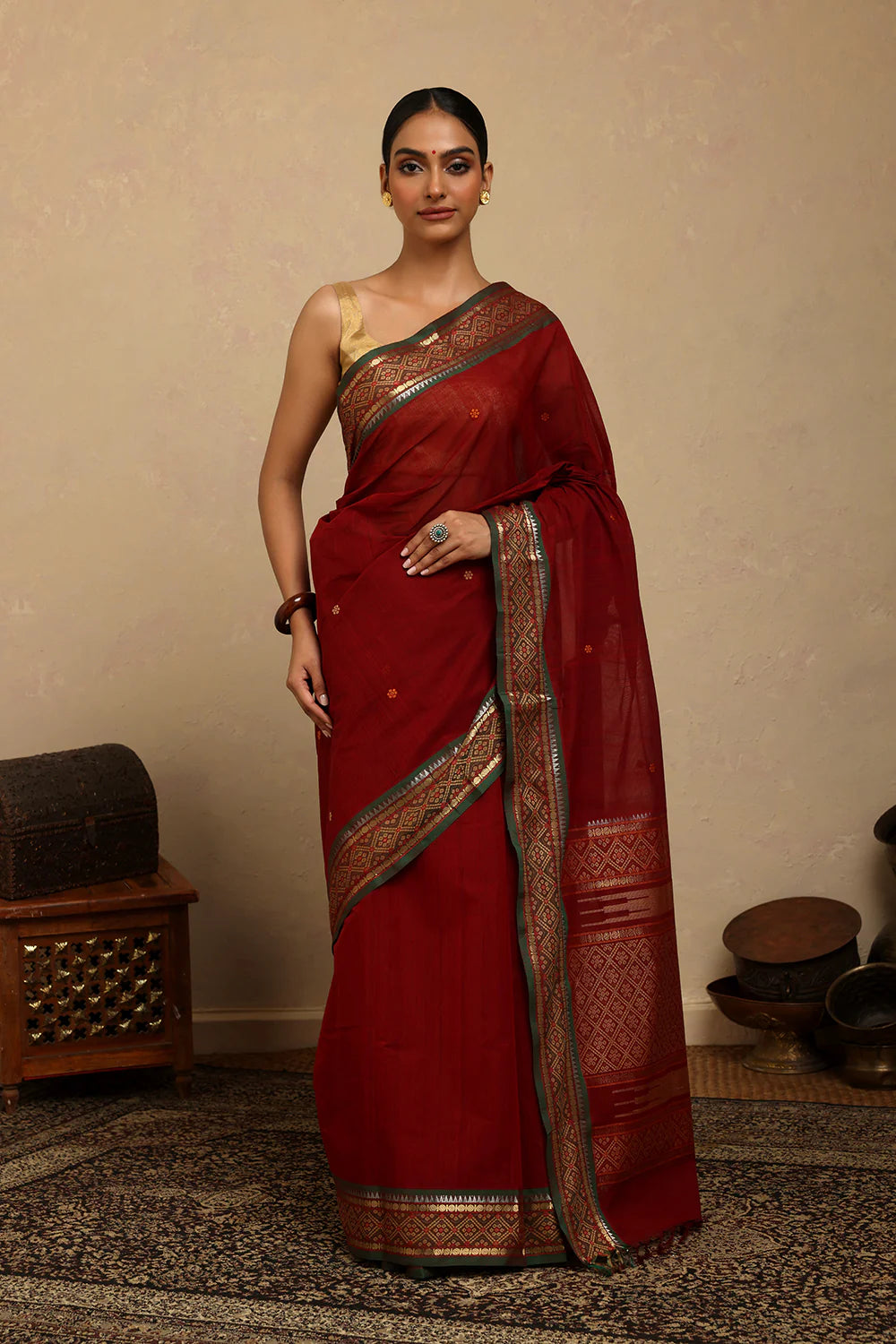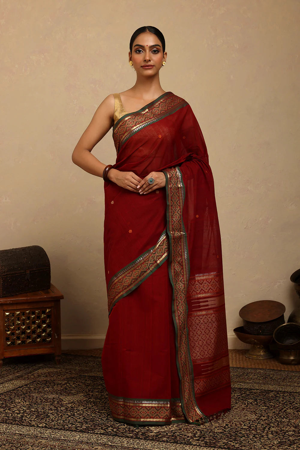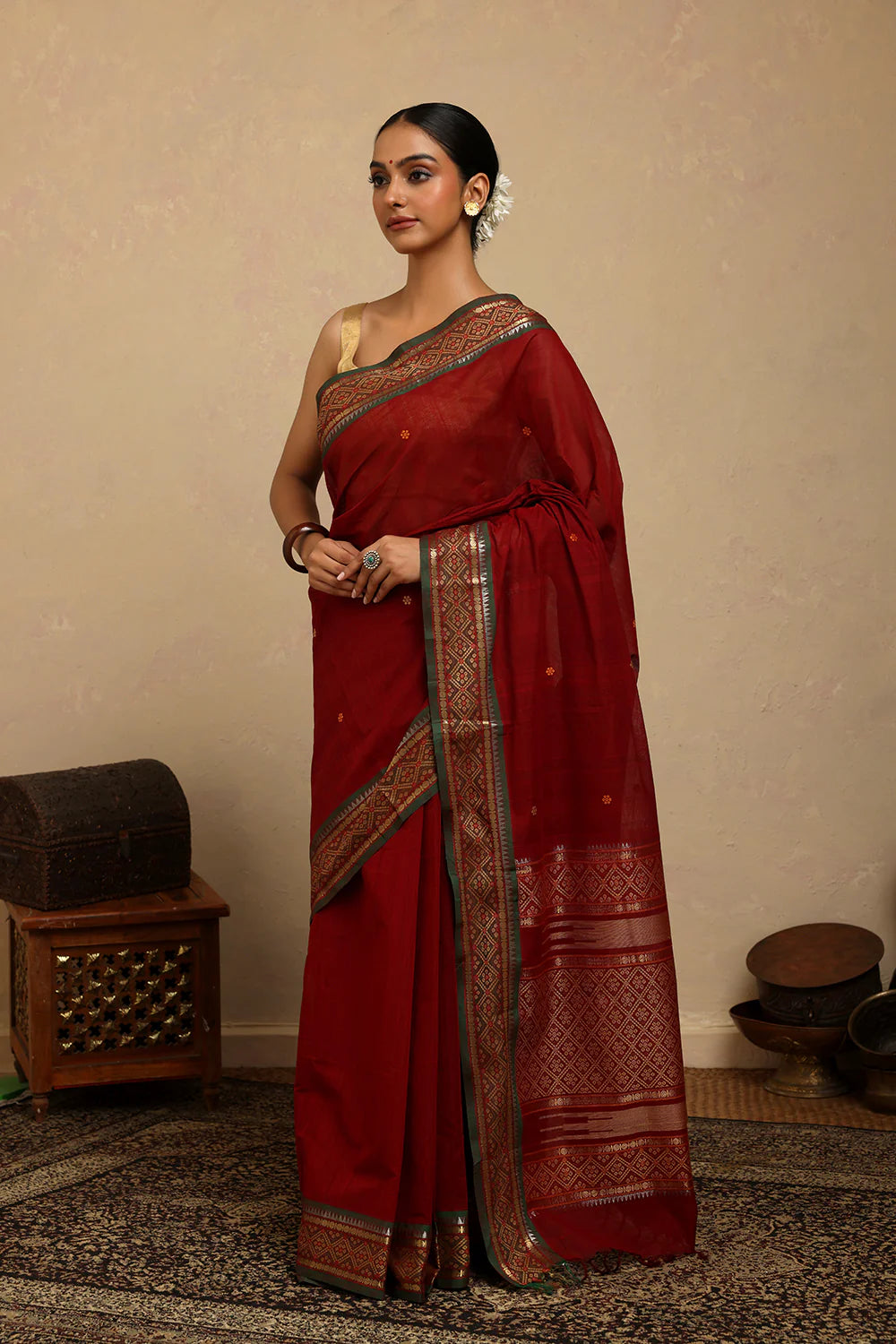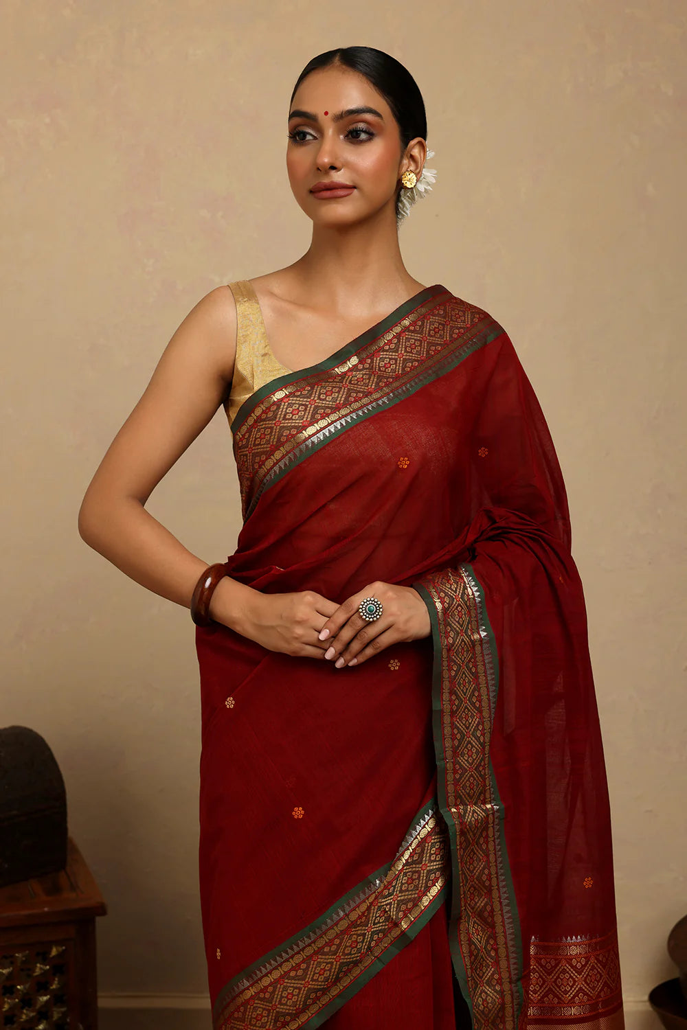 Richly elegant, this Handloom Maroon Kanchi Cotton Saree features a stunning gold zari border that adds a touch of grandeur to its timeless weave. Crafted in fine cotton, it blends comfort with sophistication, making it perfect for festive occasions or traditional gatherings. A versatile drape that beautifully captures the charm of heritage handloom artistry.