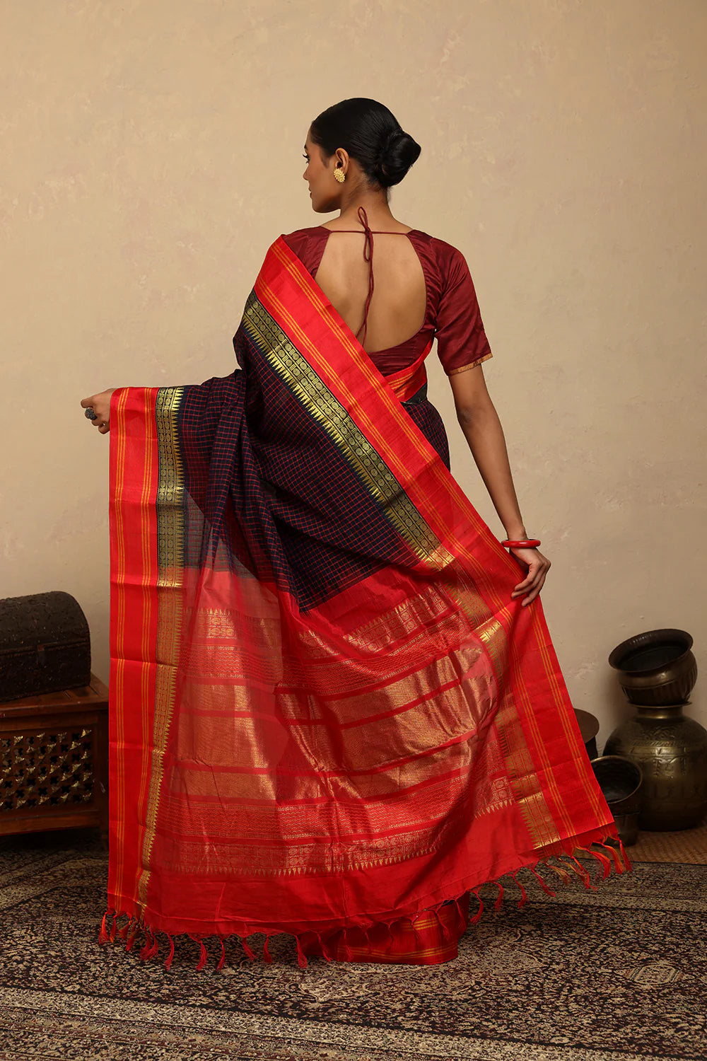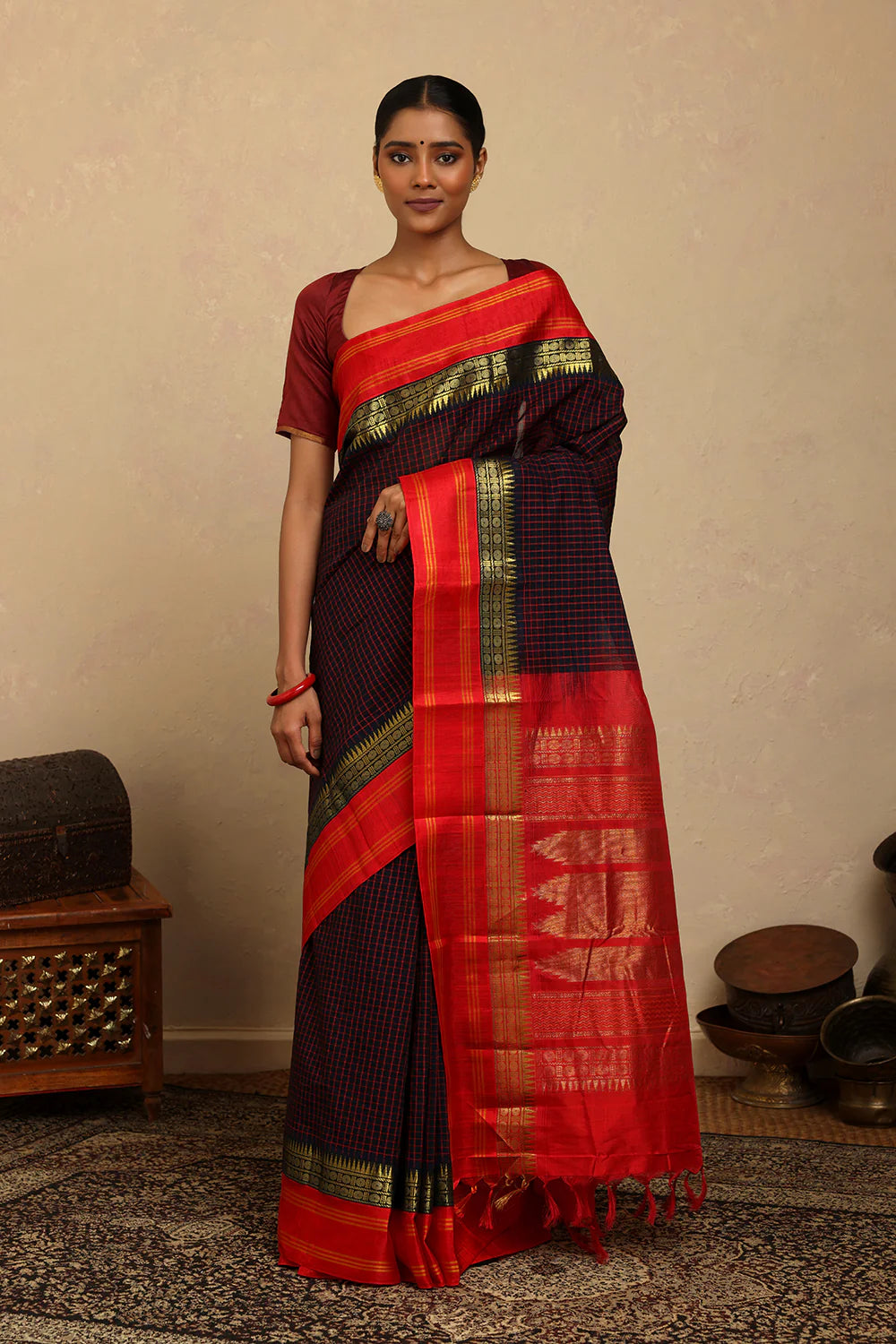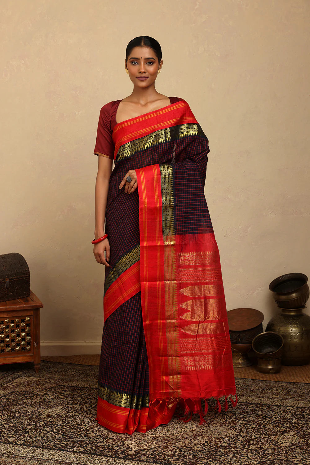 Traditional charm meets bold contrast in this Handloom Navy Blue Check Kanchi Cotton Saree. The classic checkered weave is beautifully complemented by a rich red silk pallu, adding a touch of festive elegance. Lightweight and breathable, it offers effortless draping, making it perfect for cultural celebrations, formal gatherings, or graceful everyday wear.
