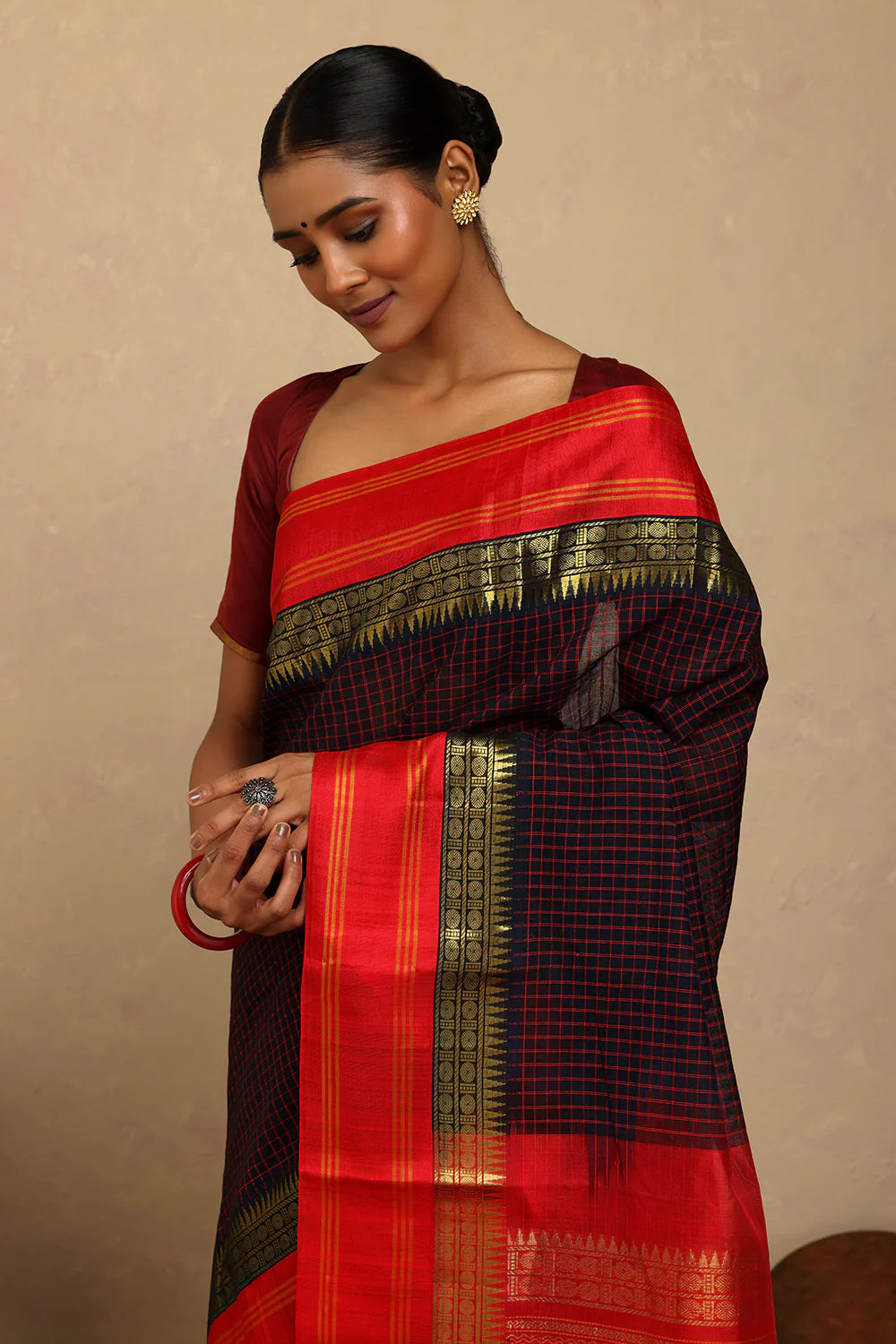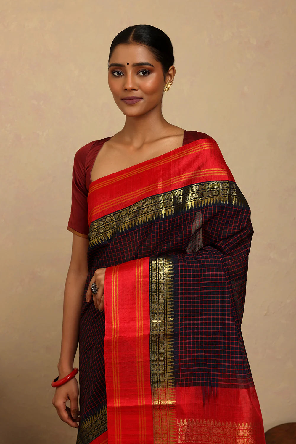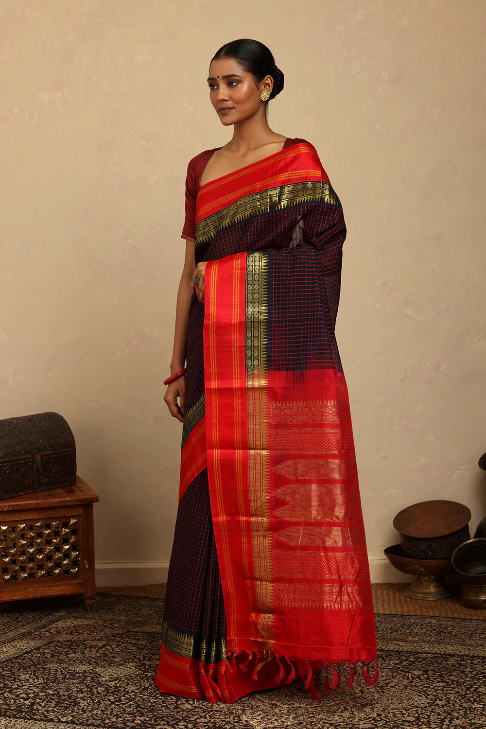 Traditional charm meets bold contrast in this Handloom Navy Blue Check Kanchi Cotton Saree. The classic checkered weave is beautifully complemented by a rich red silk pallu, adding a touch of festive elegance. Lightweight and breathable, it offers effortless draping, making it perfect for cultural celebrations, formal gatherings, or graceful everyday wear.