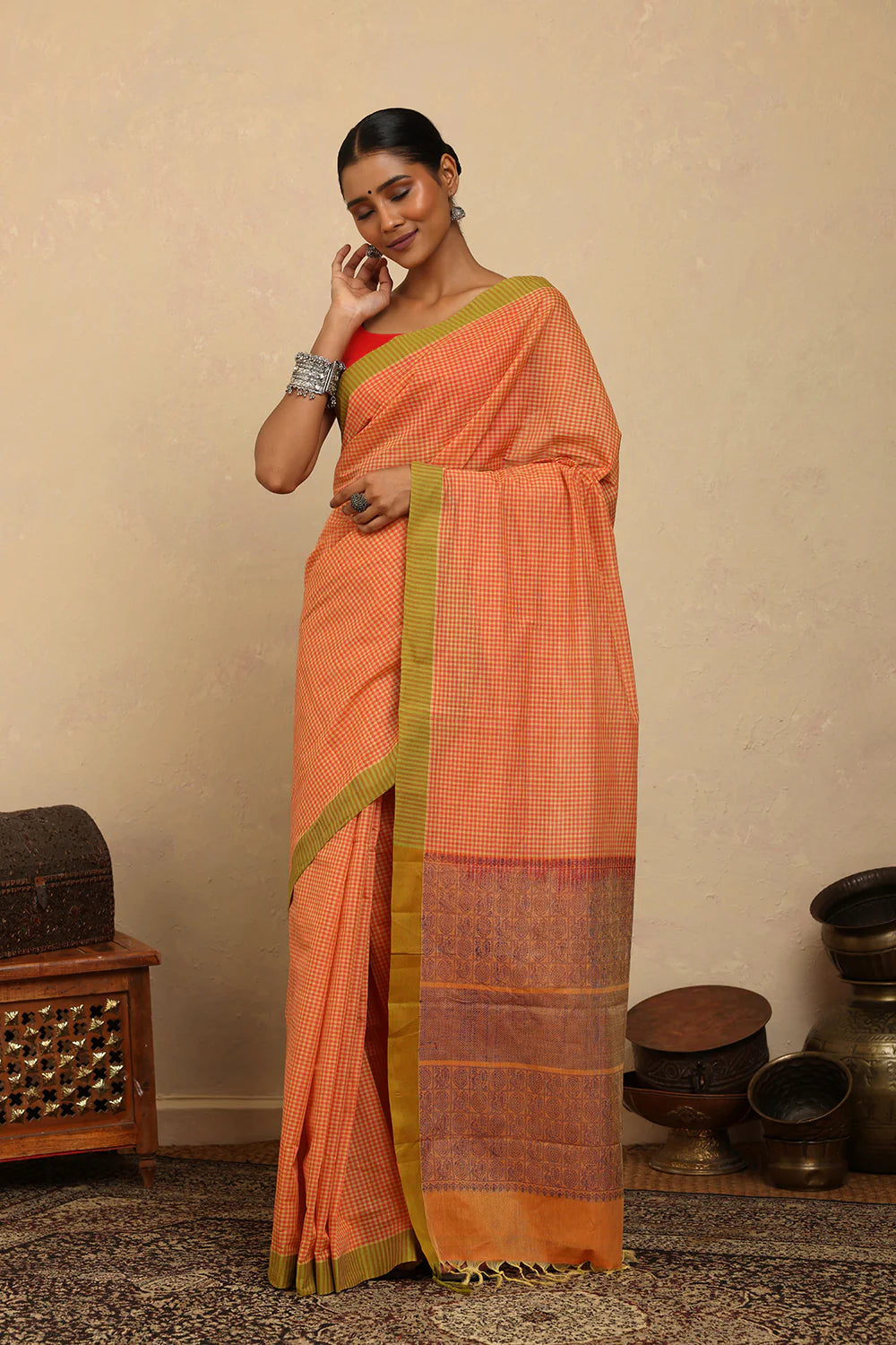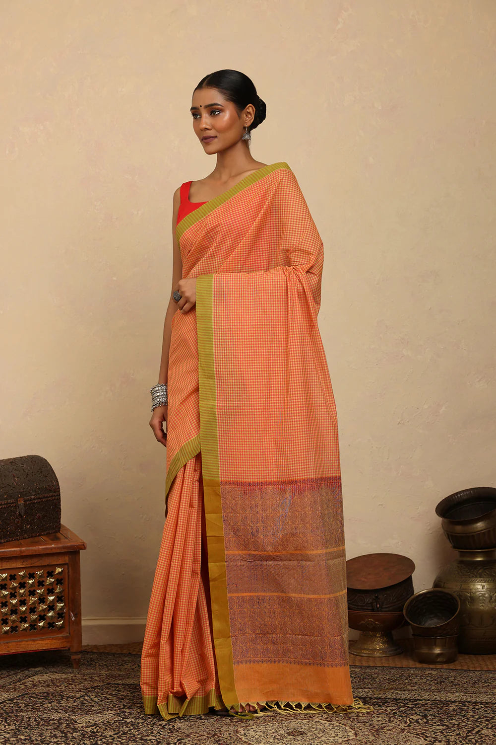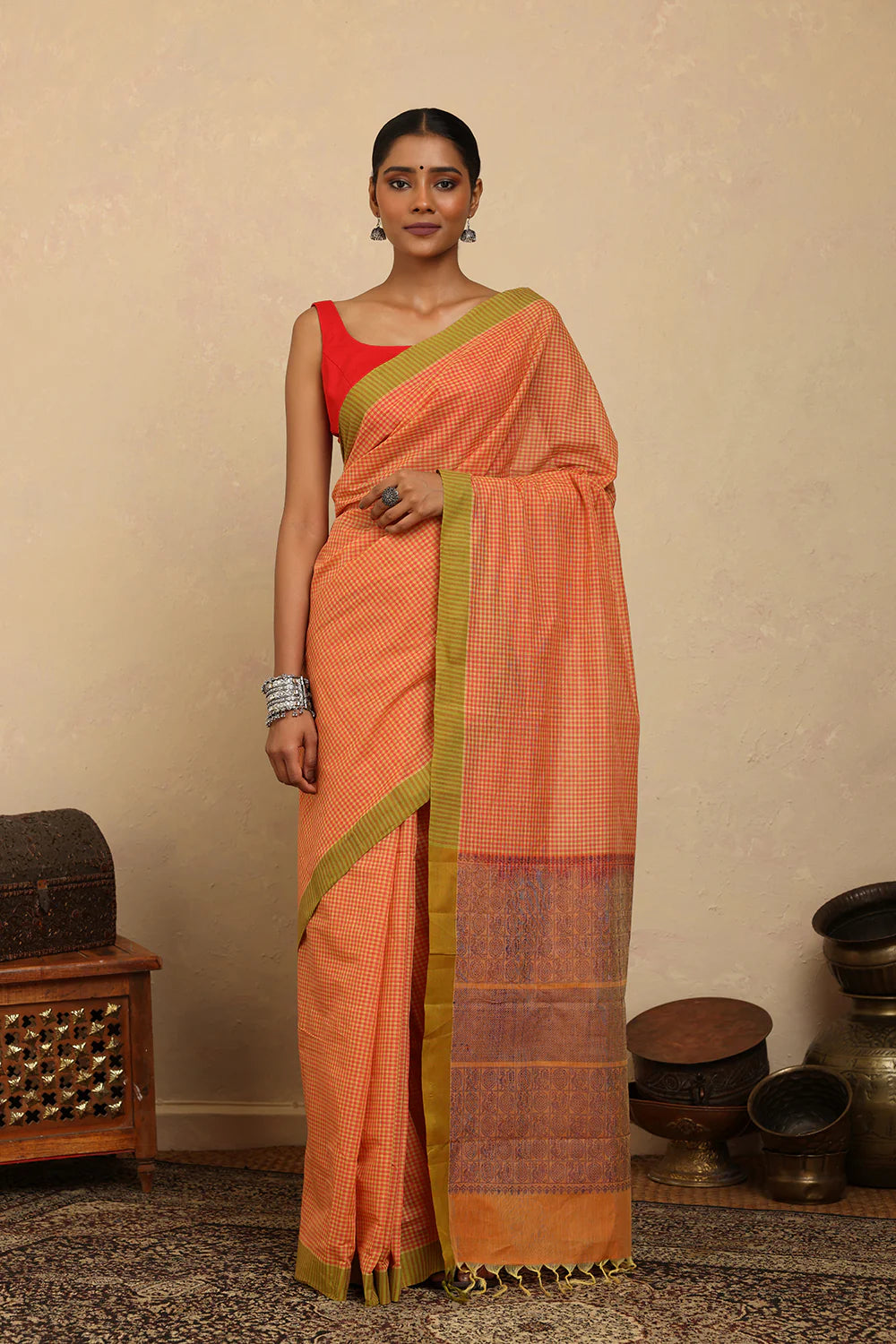 Handloom Soft Orange Mini Checks Kanchi Cotton Saree