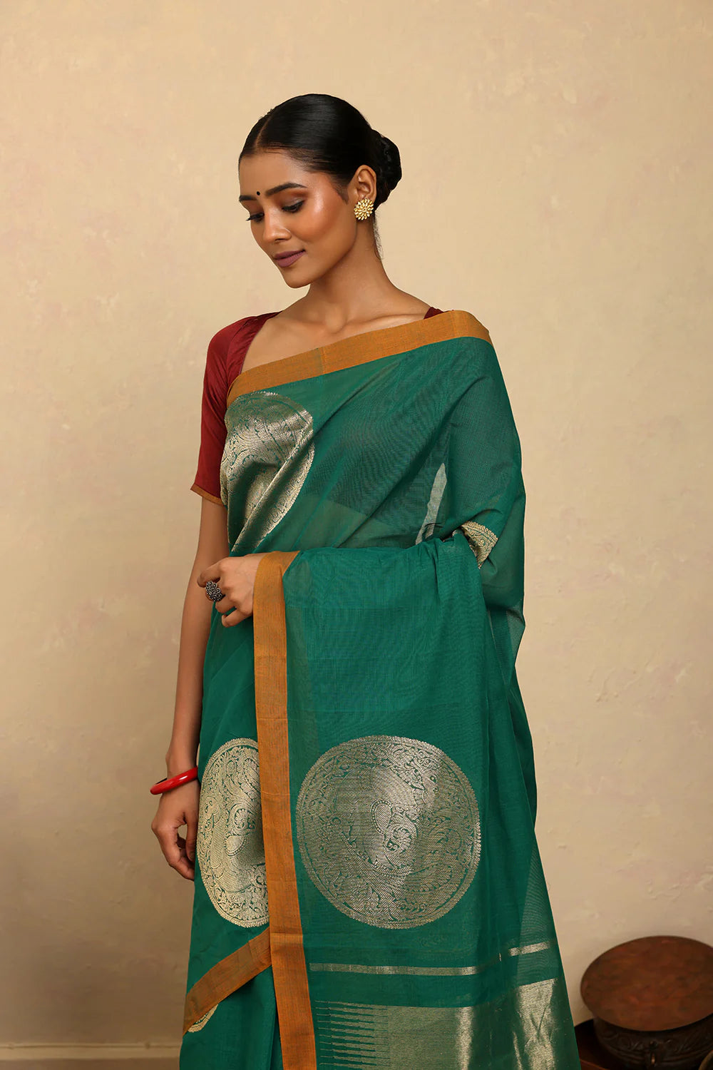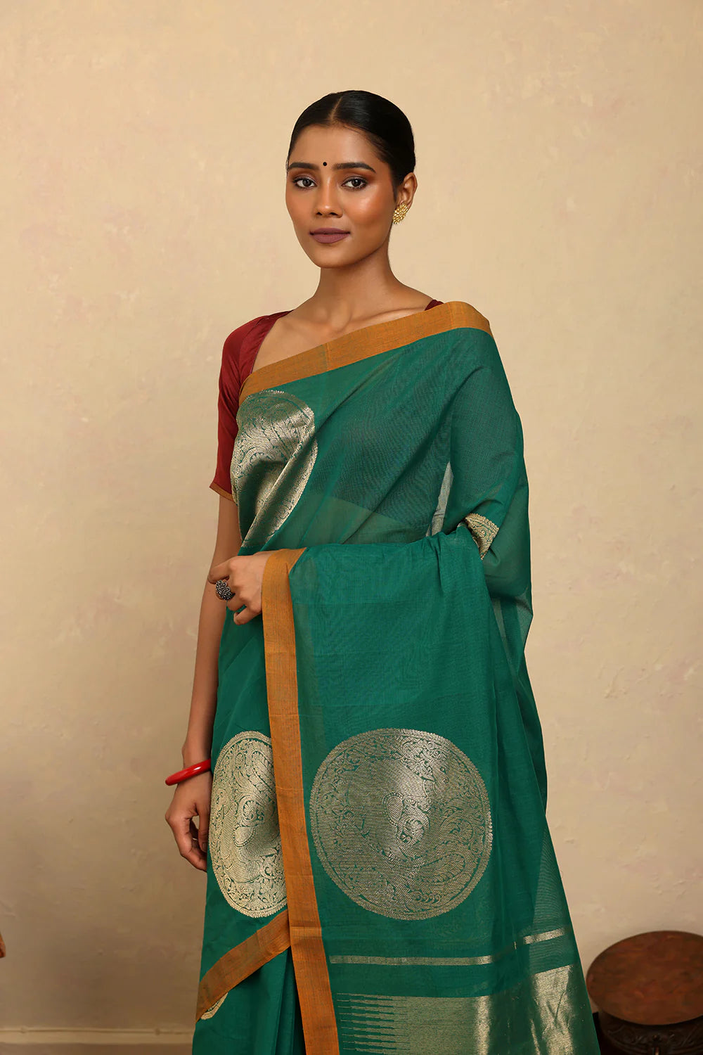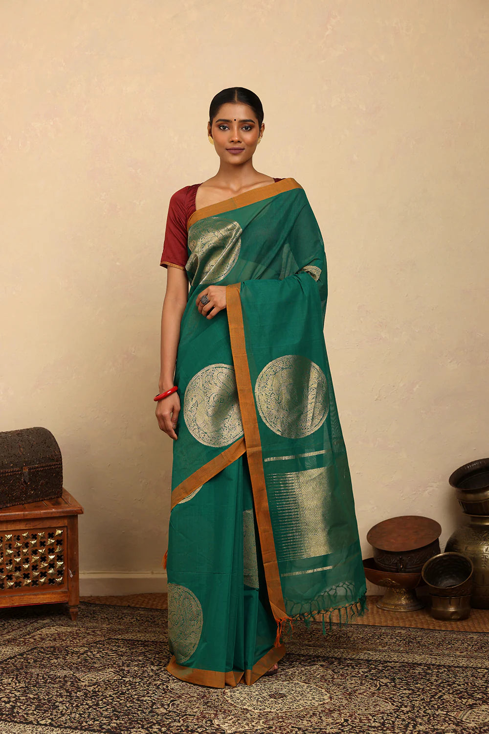 Fresh and graceful, this HandloomTeal Kanchi Cotton Saree features delicate coin motifs that reflect timeless weaving traditions. Crafted in fine cotton, it blends lightness with elegance, making it ideal for festive occasions, cultural gatherings, or everyday sophistication. A versatile drape that celebrates the richness of handloom artistry while adding a vibrant touch to your wardrobe.