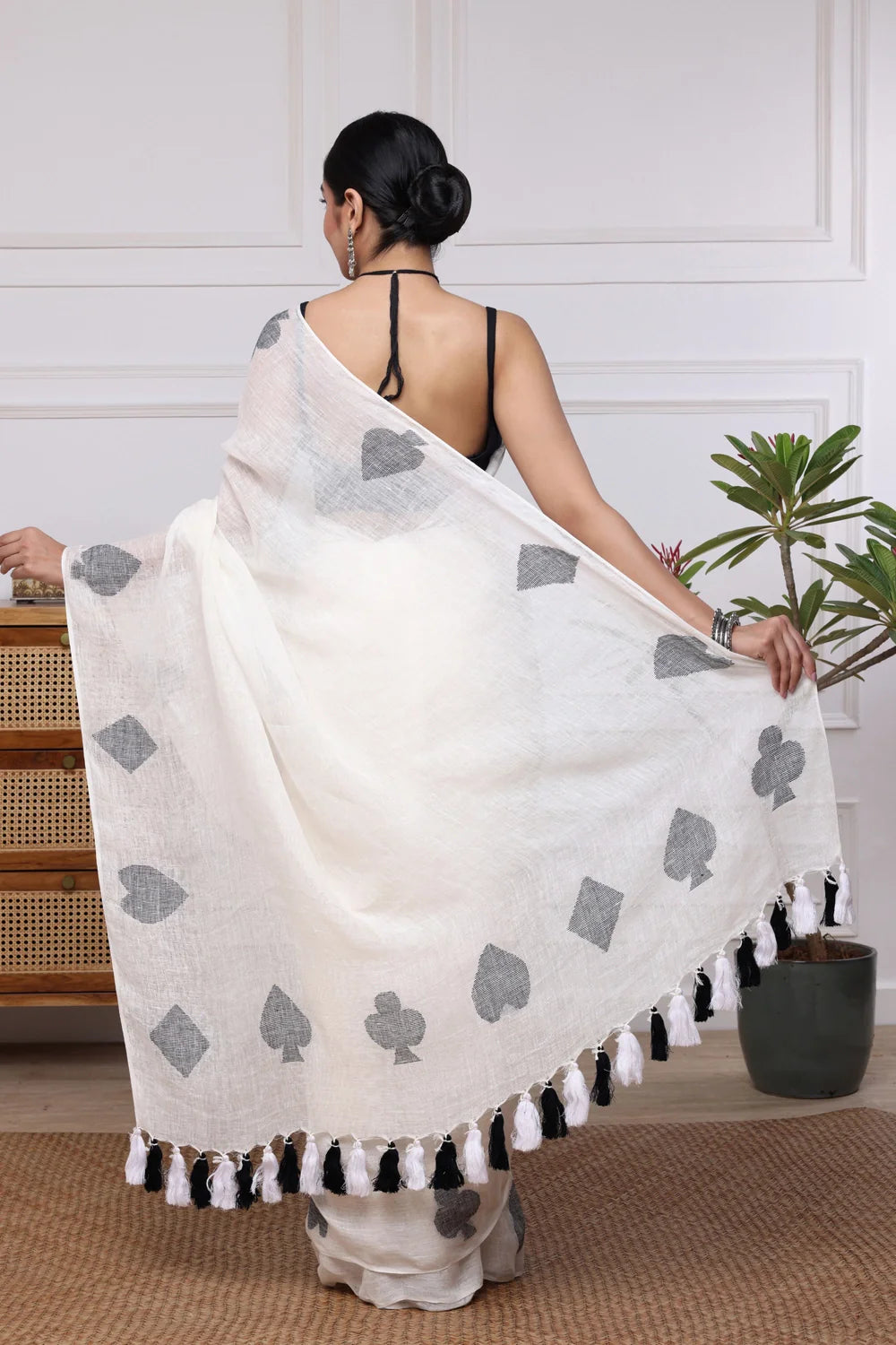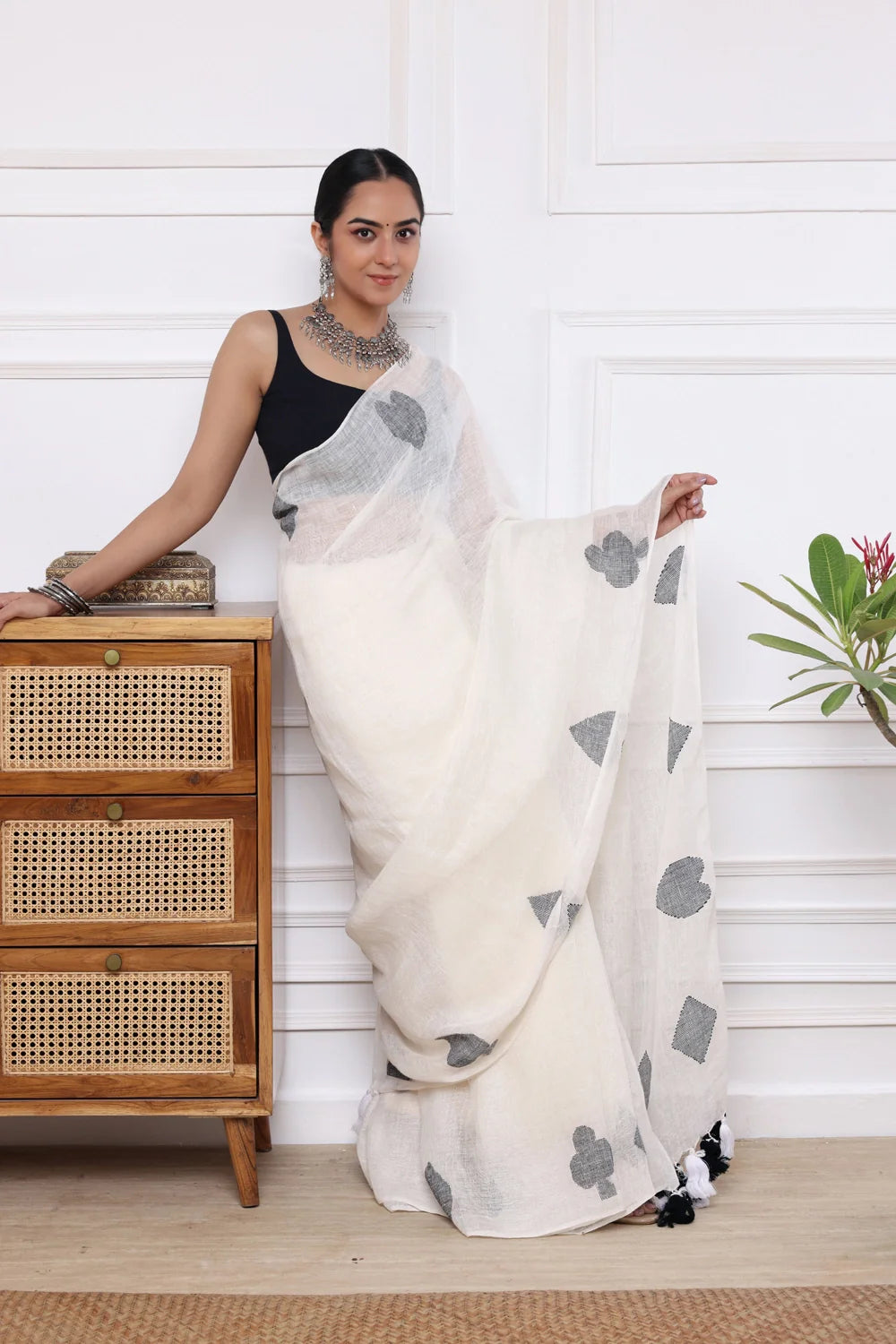 Elevate your style with our Handloom White Pure Linen Teen Patti Jamdani Saree. Delicately woven with intricate Teen Patti Jamdani motifs, this saree embodies timeless elegance and craftsmanship. Crafted from pure linen, it offers a luxurious drape and exceptional comfort. Perfect for any occasion, embrace the allure of traditional handloom artistry with this exquisite piece