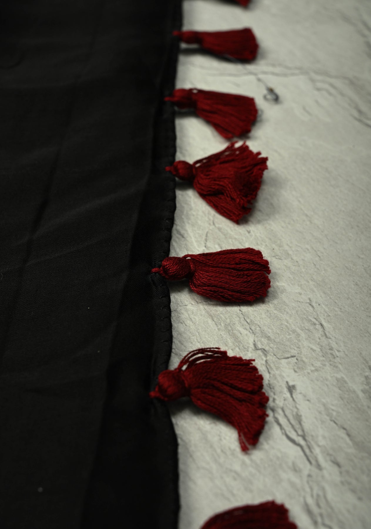 This saree is ready to wear with fall and pico done. An unstitched blouse fabric is included.Hand-made tassels adorn pallu.