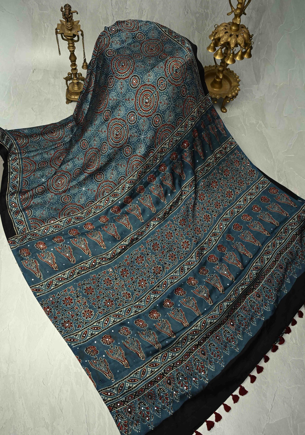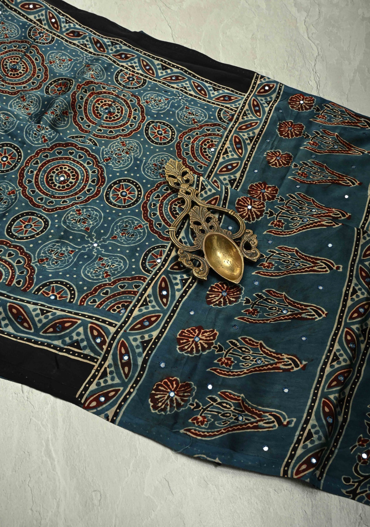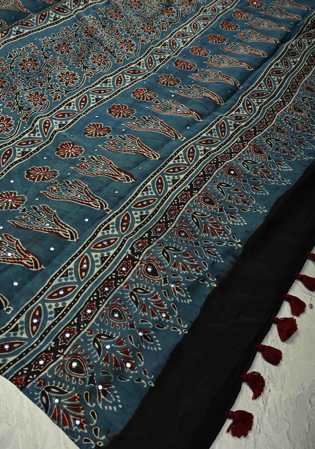 Indigo Ajrakh Block Print on Modal Saree with Mirror Work