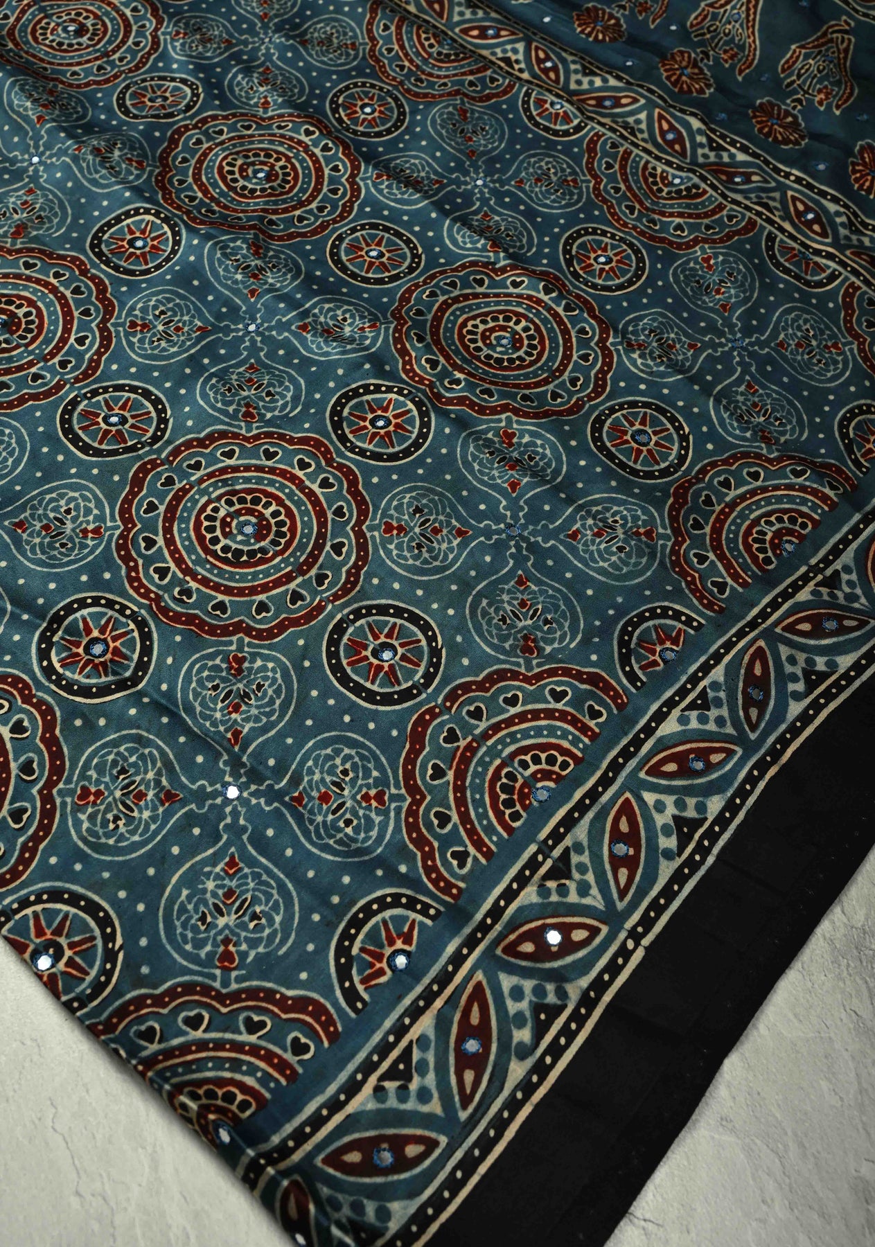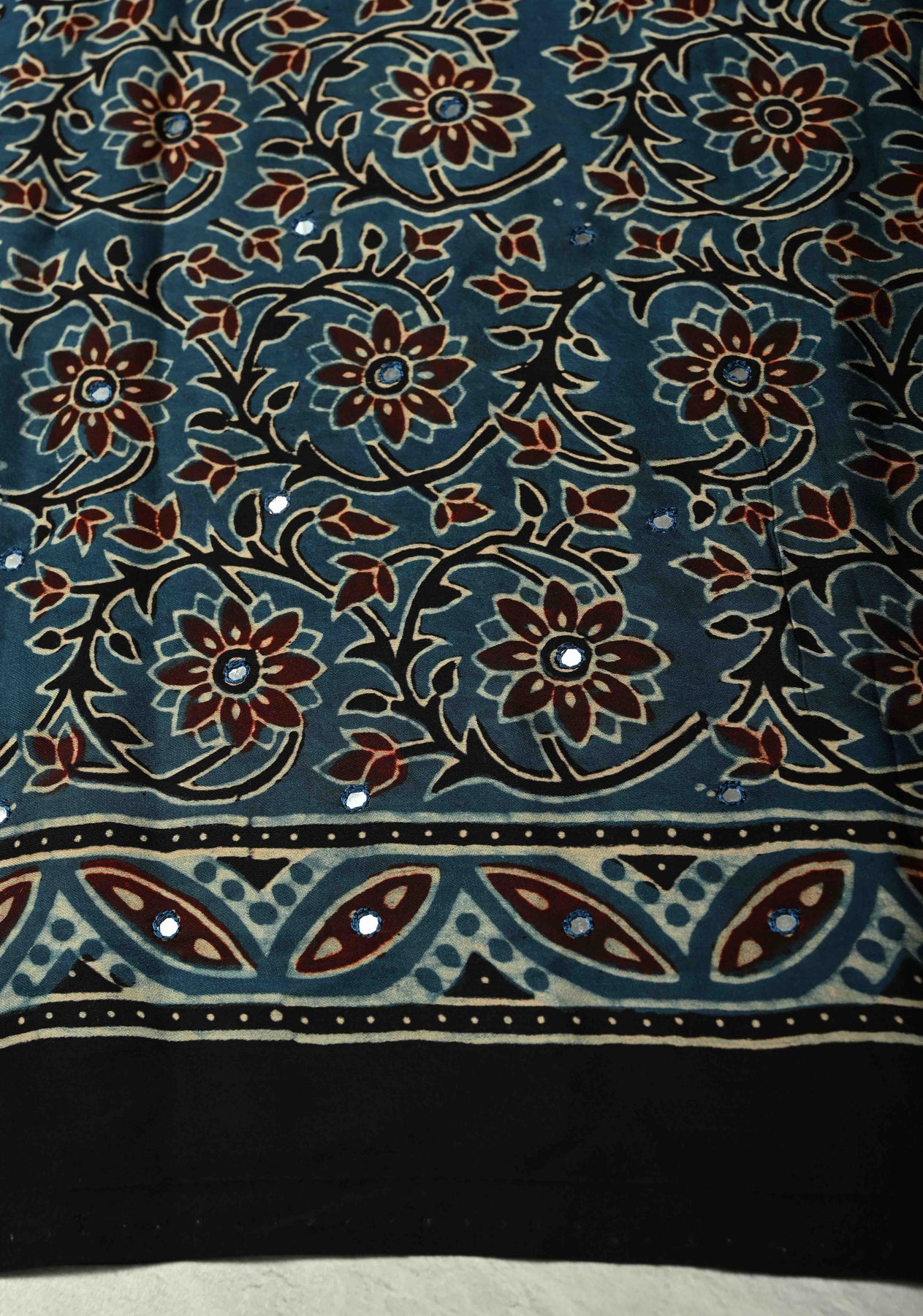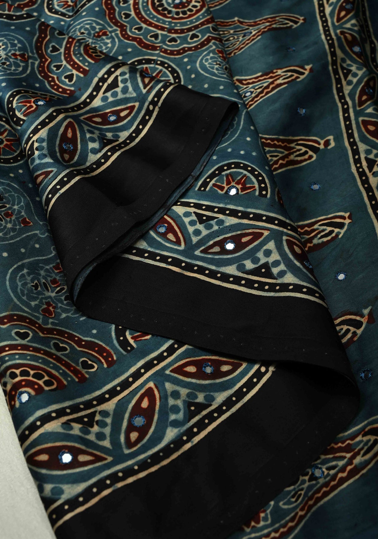 Indigo Ajrakh Block Print on Modal Saree with Mirror Work