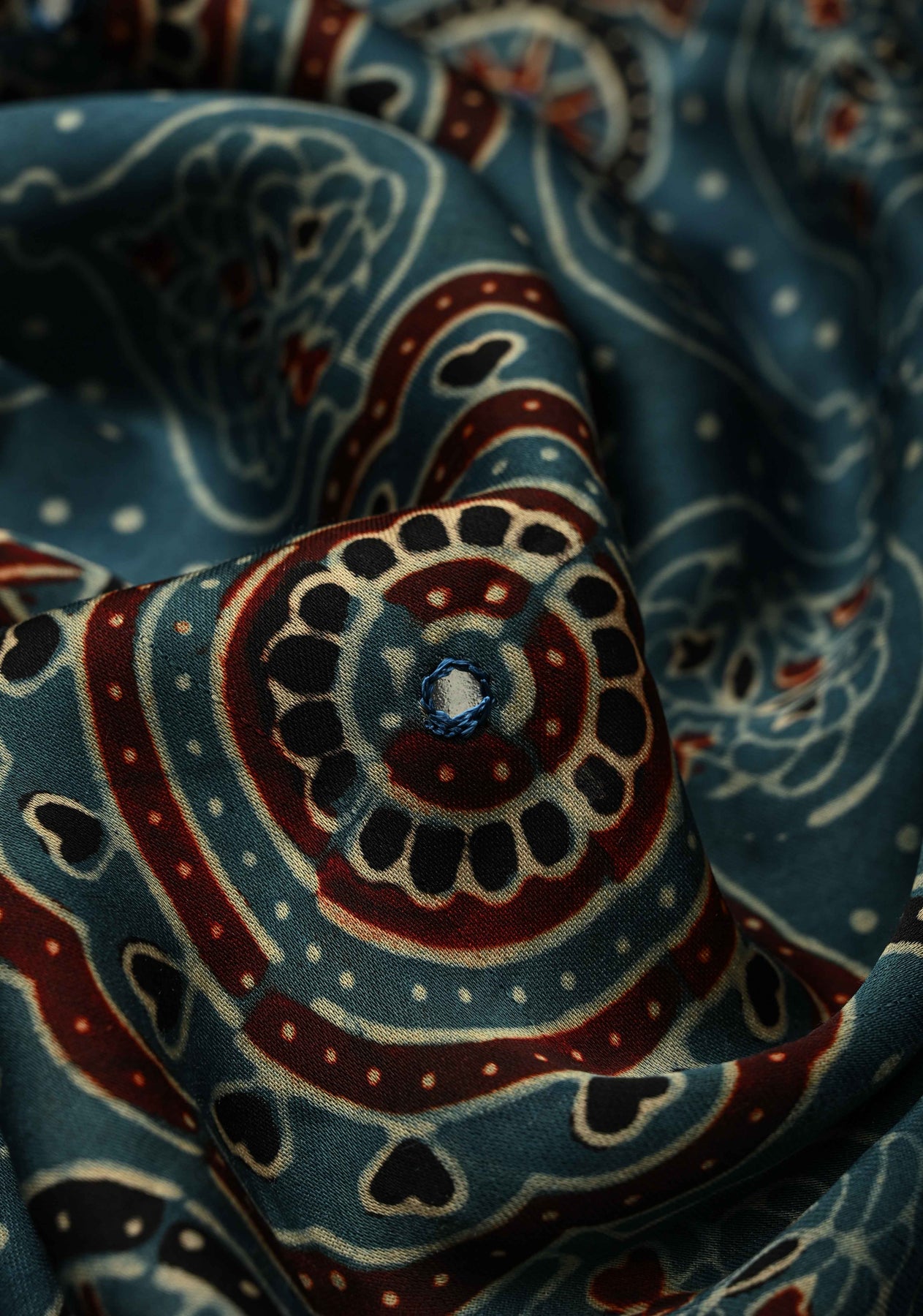 Celebrate the beauty of traditional craft with this Indigo Ajrakh Block Print Modal Saree with Mirror Work — a timeless fusion of heritage artistry and contemporary style. Handcrafted using the ancient Ajrakh block printing technique, this saree features intricate geometric and floral motifs in deep indigo hues, created with natural dyes and traditional wooden blocks.