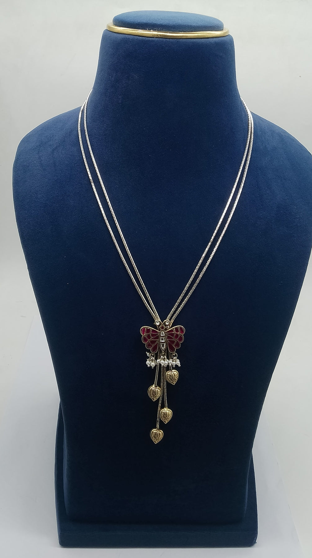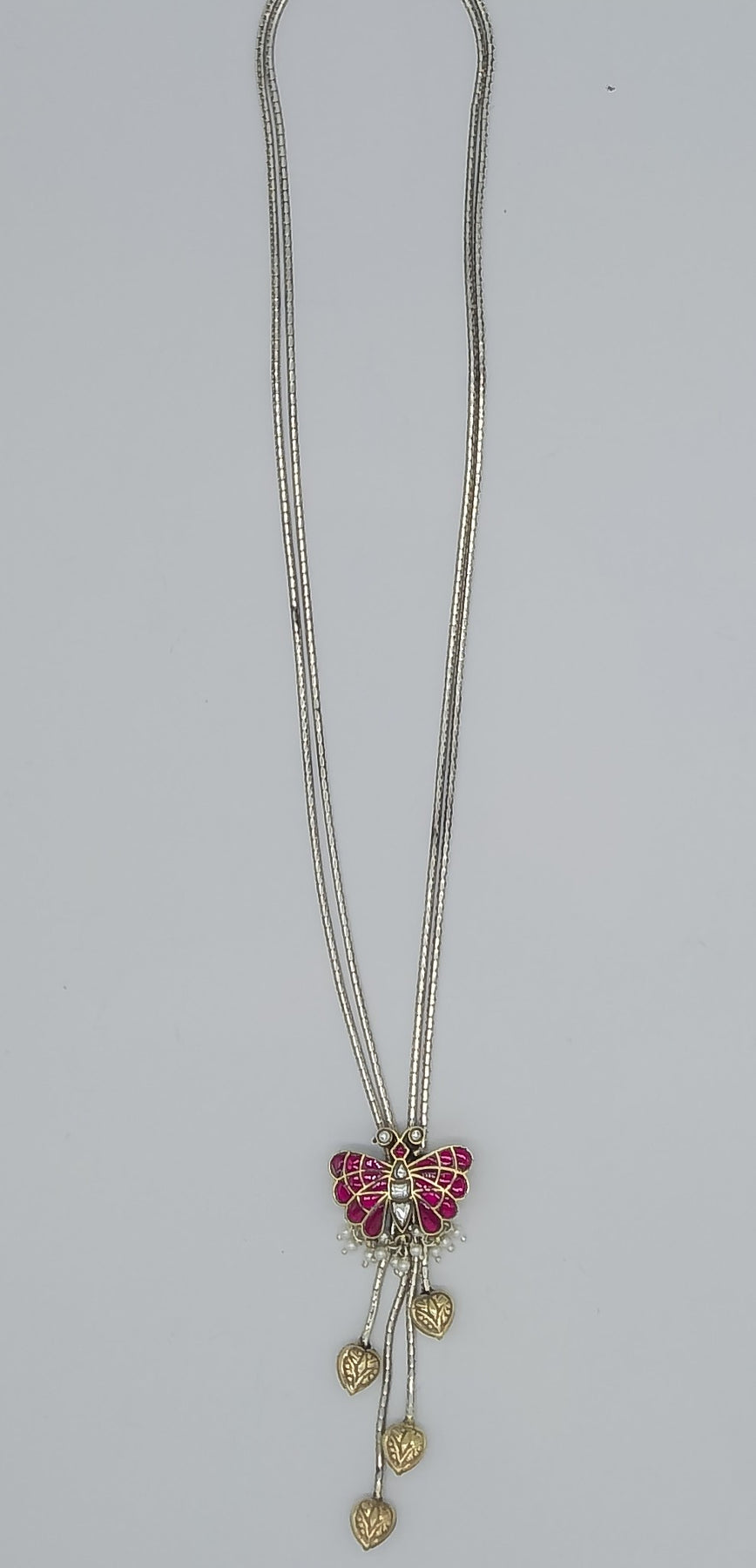 Experience the perfect blend of heritage and contemporary style with our Intricate Pure Silver Butterfly Pendant. Handcrafted from high-quality silver, this whimsical design features vibrant pink-toned wing accents and elegant heart-shaped drops. Paired with a sleek, minimalist chain, it offers a versatile statement of modern elegance