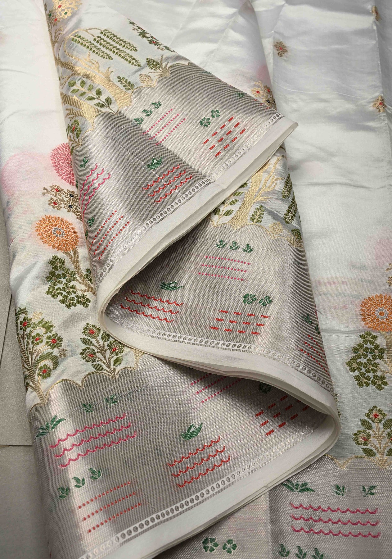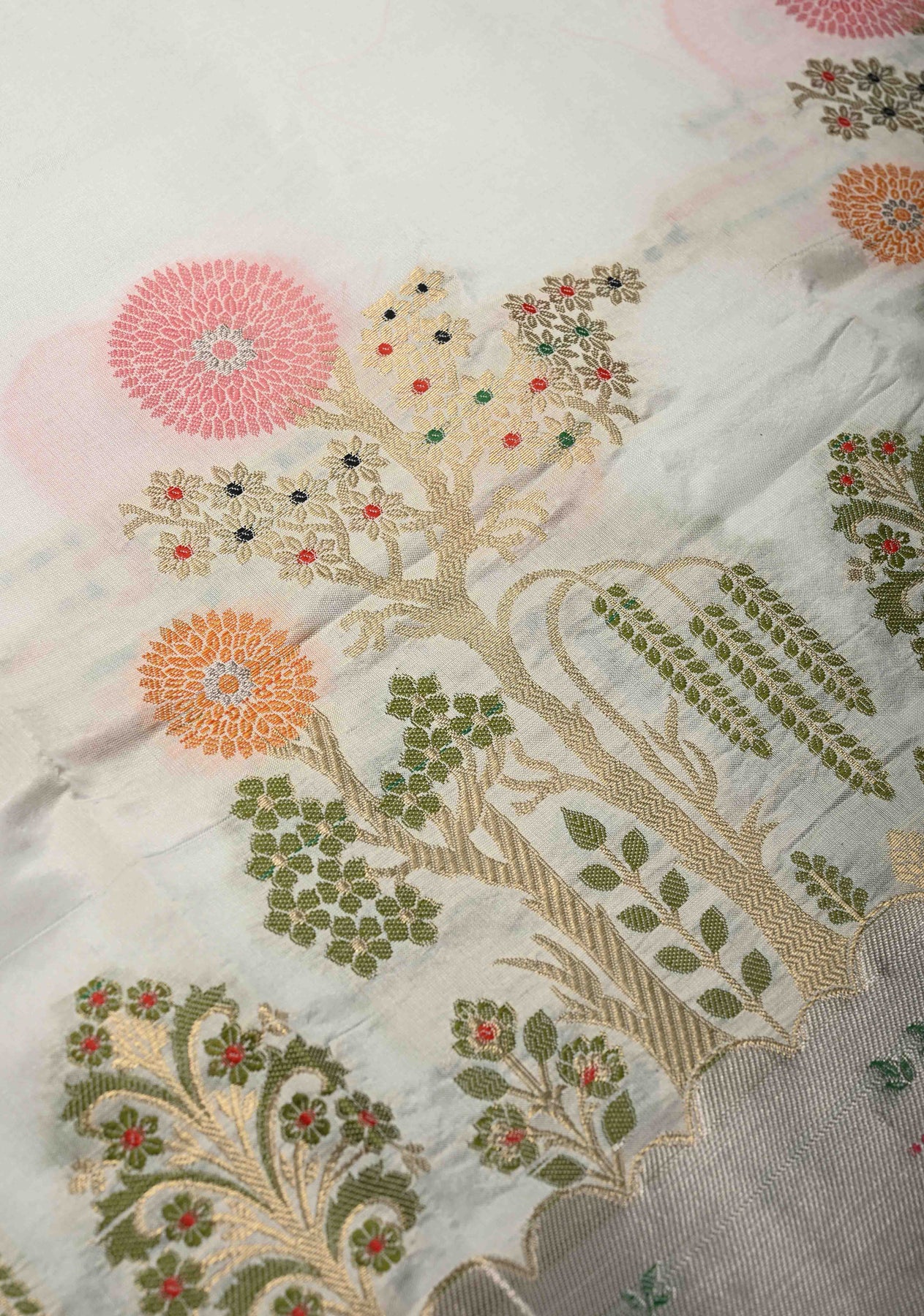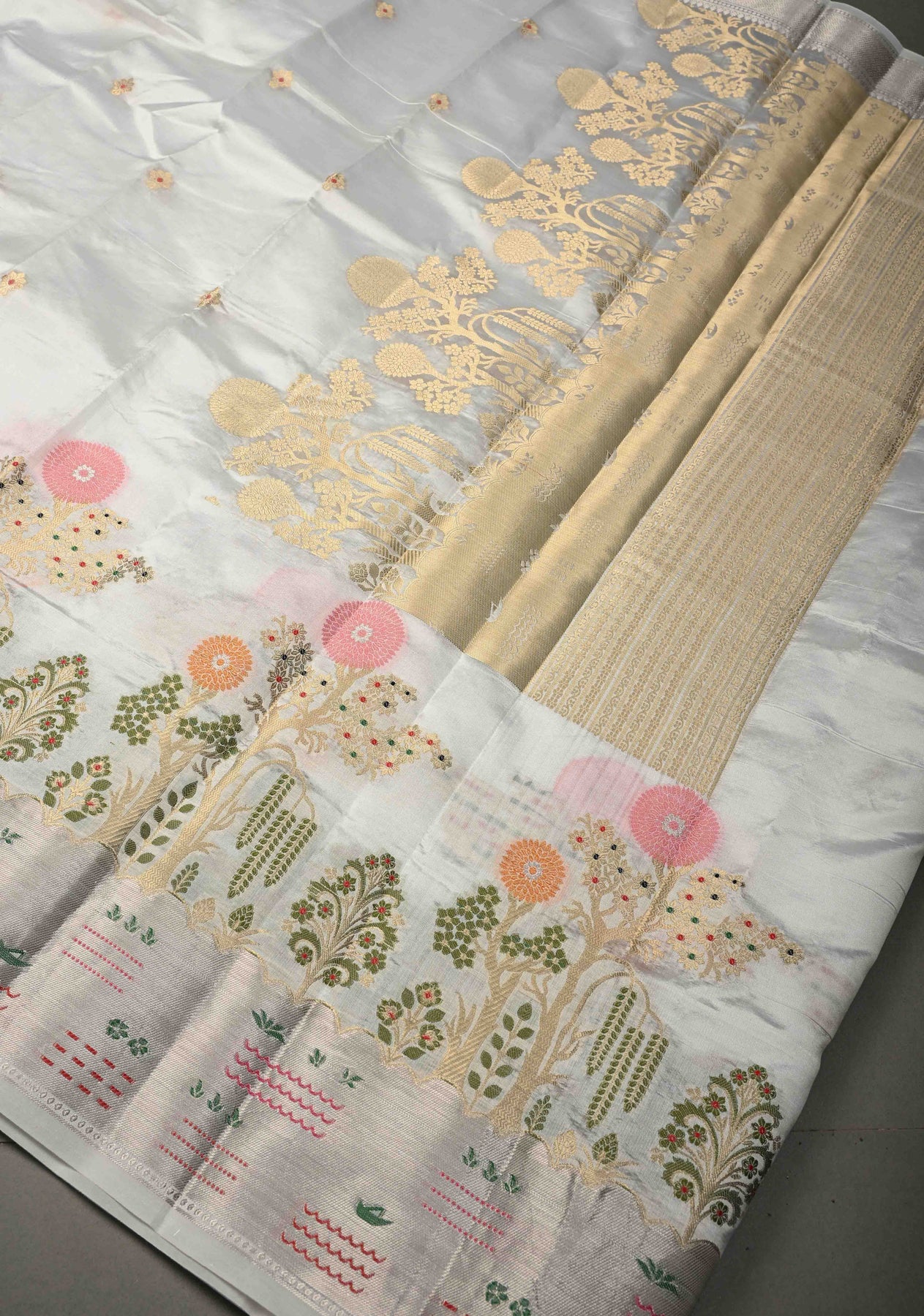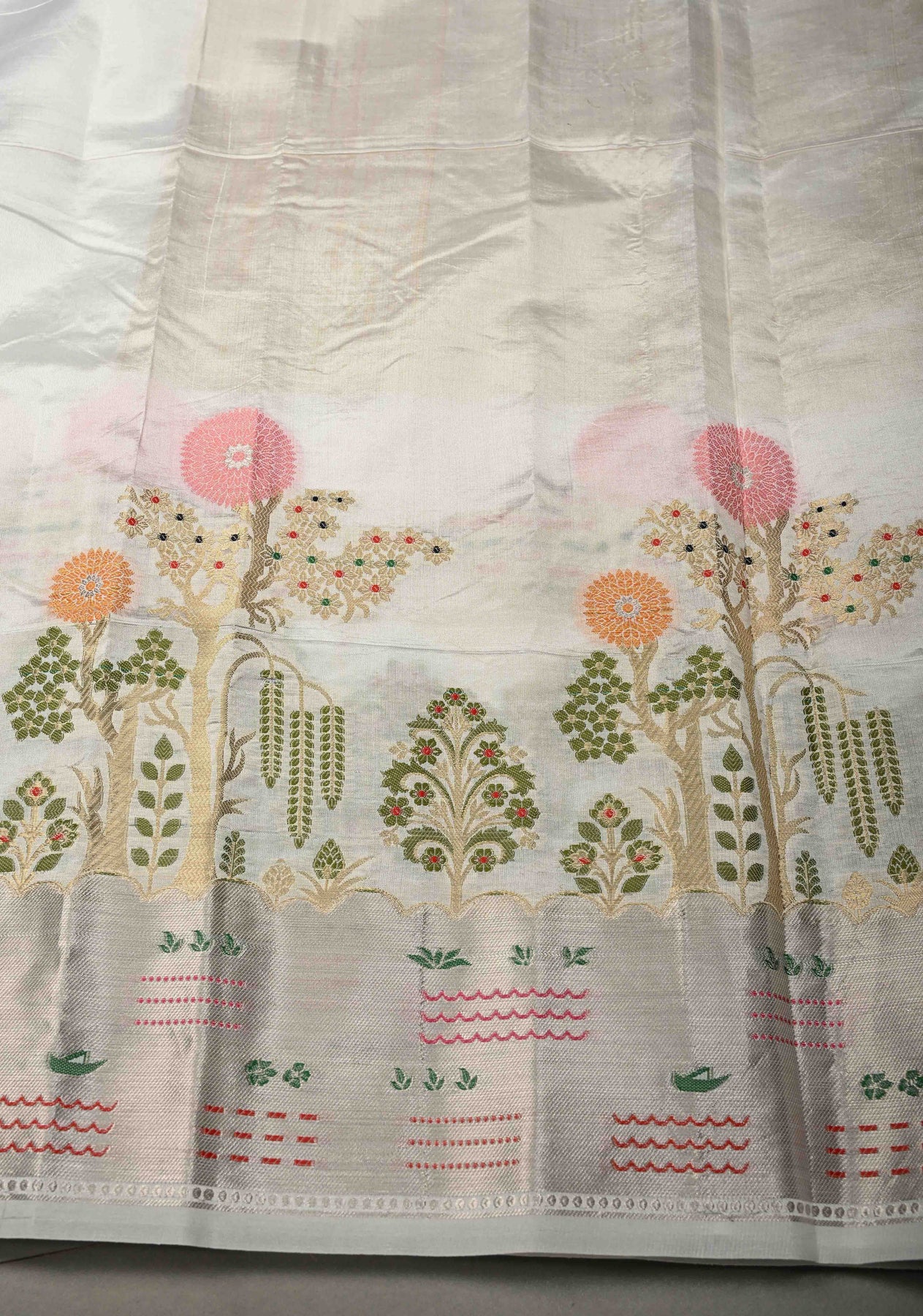 Ivory Katan Resham Saree with Floral Meenakari  Zari Buttas and Tree of life Sliver Zari Border | SILK MARK CERTIFIED