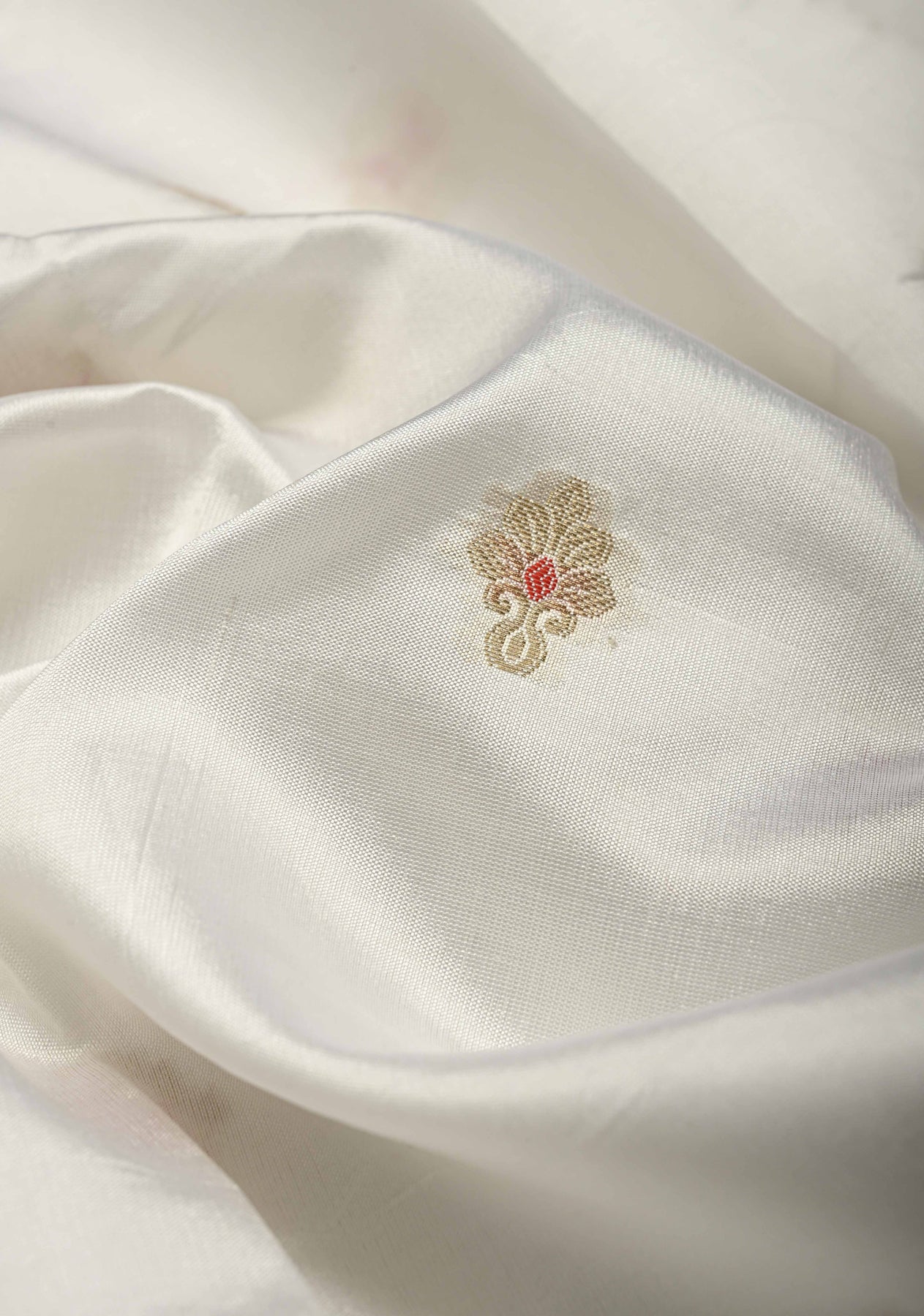 Ivory Katan Resham Saree with Floral Meenakari Zari Buttas and Tree of life Sliver Zari Border | SILK MARK CERTIFIED