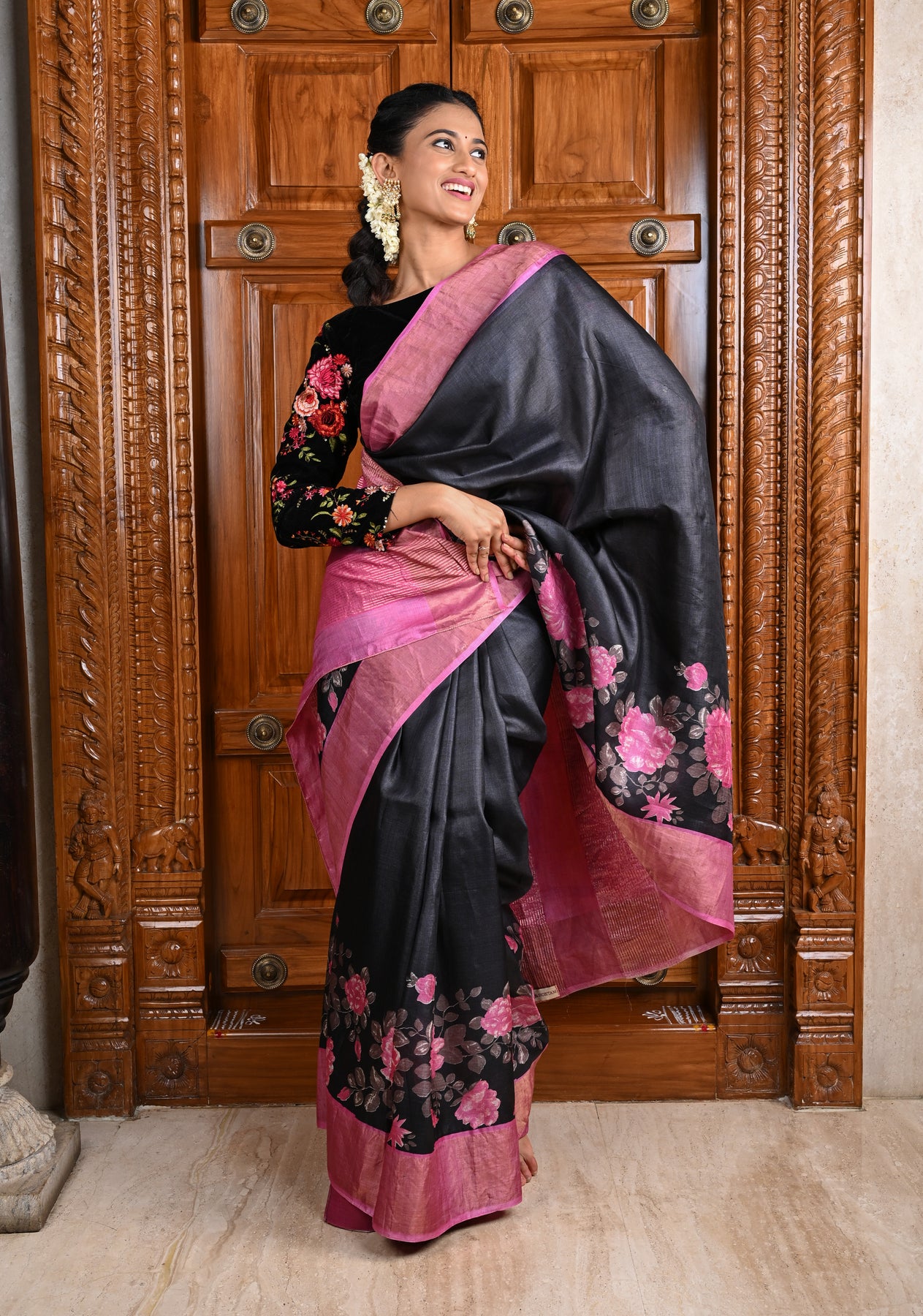 Step into timeless grace with this exquisite Black Jari Tussar Silk Saree, a perfect blend of heritage textile and contemporary design. Crafted from luxurious Tussar silk with a subtle gold zari weave, this saree features a striking floral digital print that adds vibrance and modern flair to its deep black base.