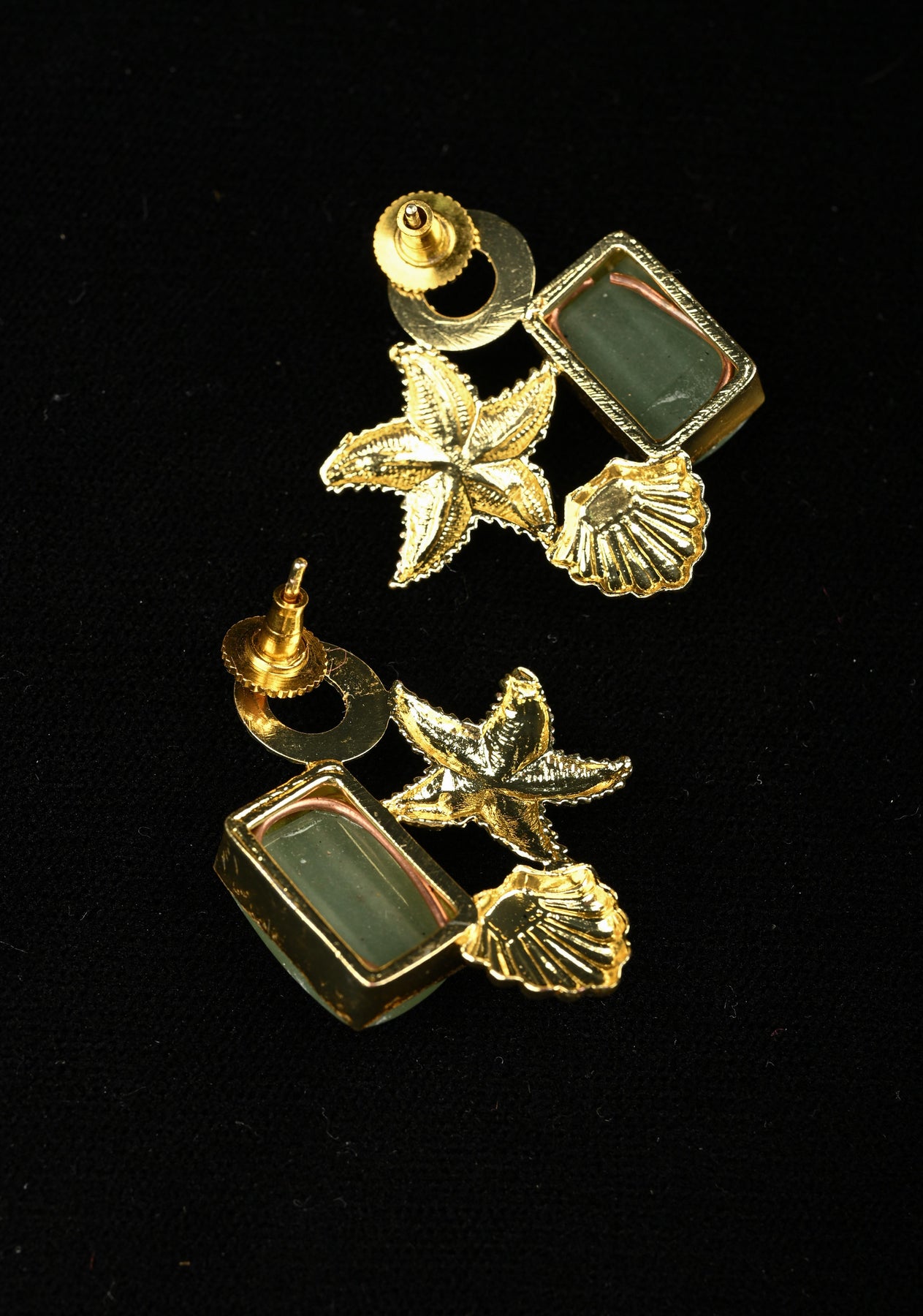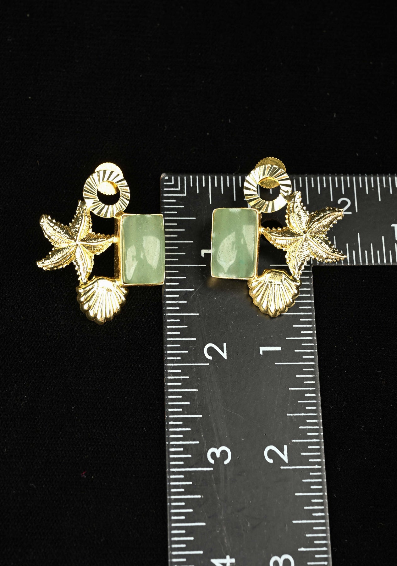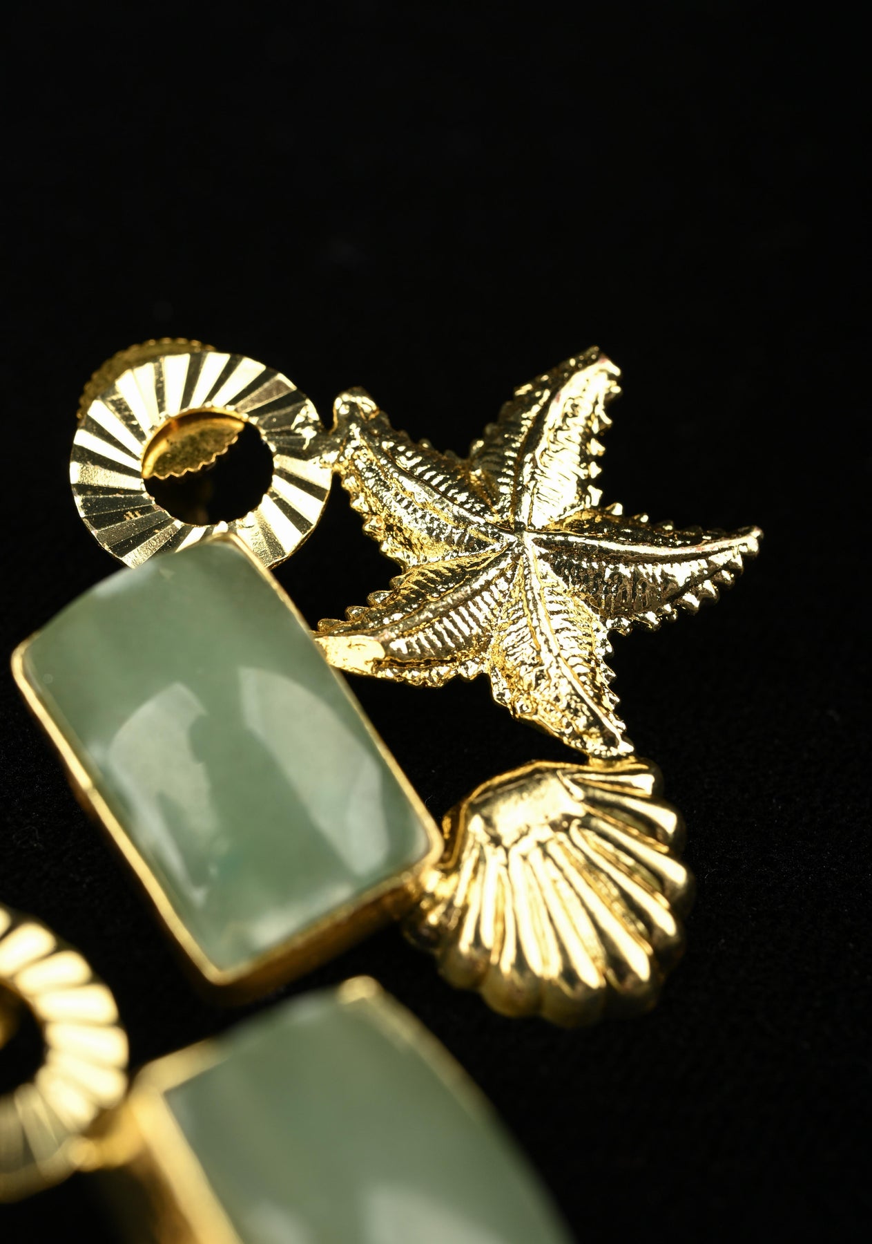 Inspired by oceanic elegance, the Lapis Lazuli & Green Jade with Gold Starfish-Shell Earrings blend natural gemstones with artisanal charm. Featuring deep blue lapis lazuli paired with soothing green jade, these earrings are beautifully accented with a gold-finished starfish-shell motif. The contrasting hues and textured detailing create a striking yet balanced design, making them perfect for resort wear, festive occasions, and statement evening styling. Lightweight and eye-catching, these earrings add a touch of coastal luxury and contemporary sophistication to any ensemble.