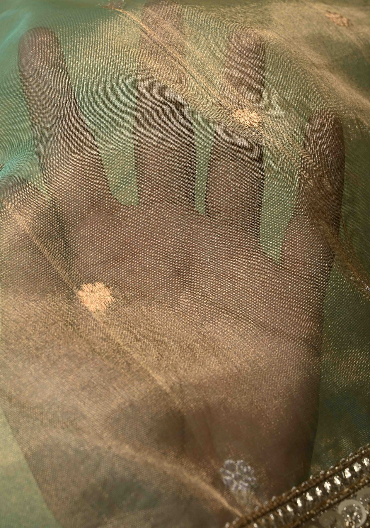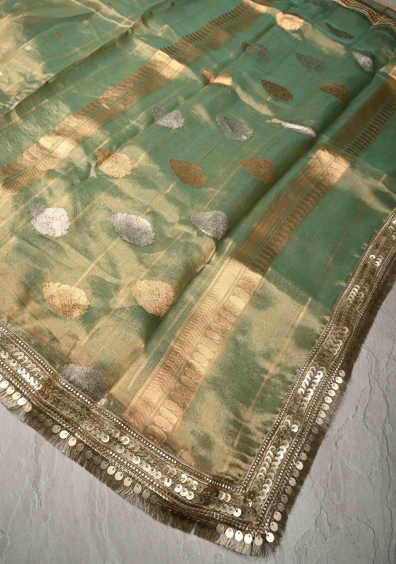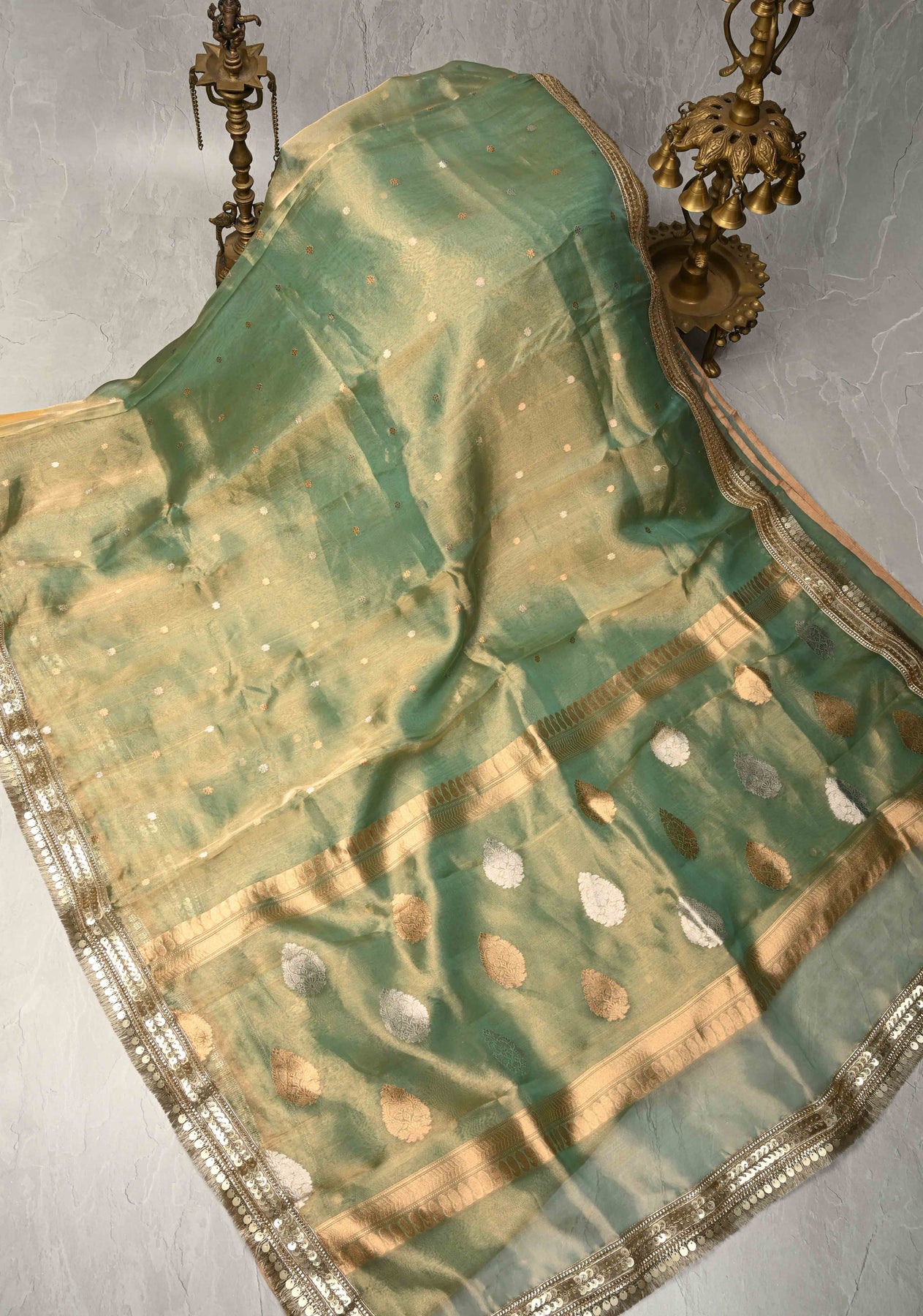 The Light Green Banarasi Pure Tissue Silk Saree is a delicate masterpiece that embodies refined elegance and traditional charm. Woven from pure tissue silk, this saree has a soft, lustrous texture with a subtle golden sheen that enhances its graceful drape. The soothing light green hue adds a touch of freshness, making it perfect for daytime celebrations and festive occasions. It is beautifully embellished with Sona Rupa Chunri buttis—intricately woven gold and silver dots that reflect timeless Banarasi craftsmanship. Finished with a fancy lace trim border, this saree effortlessly balances classic design with contemporary sophistication, ideal for weddings, poojas, and formal gatherings.